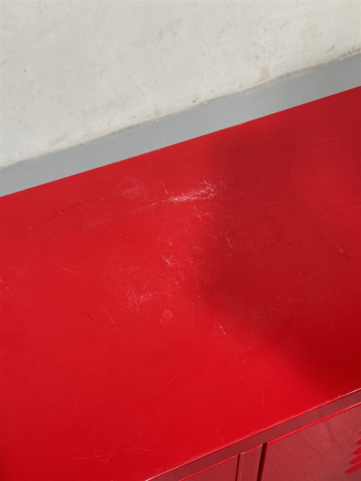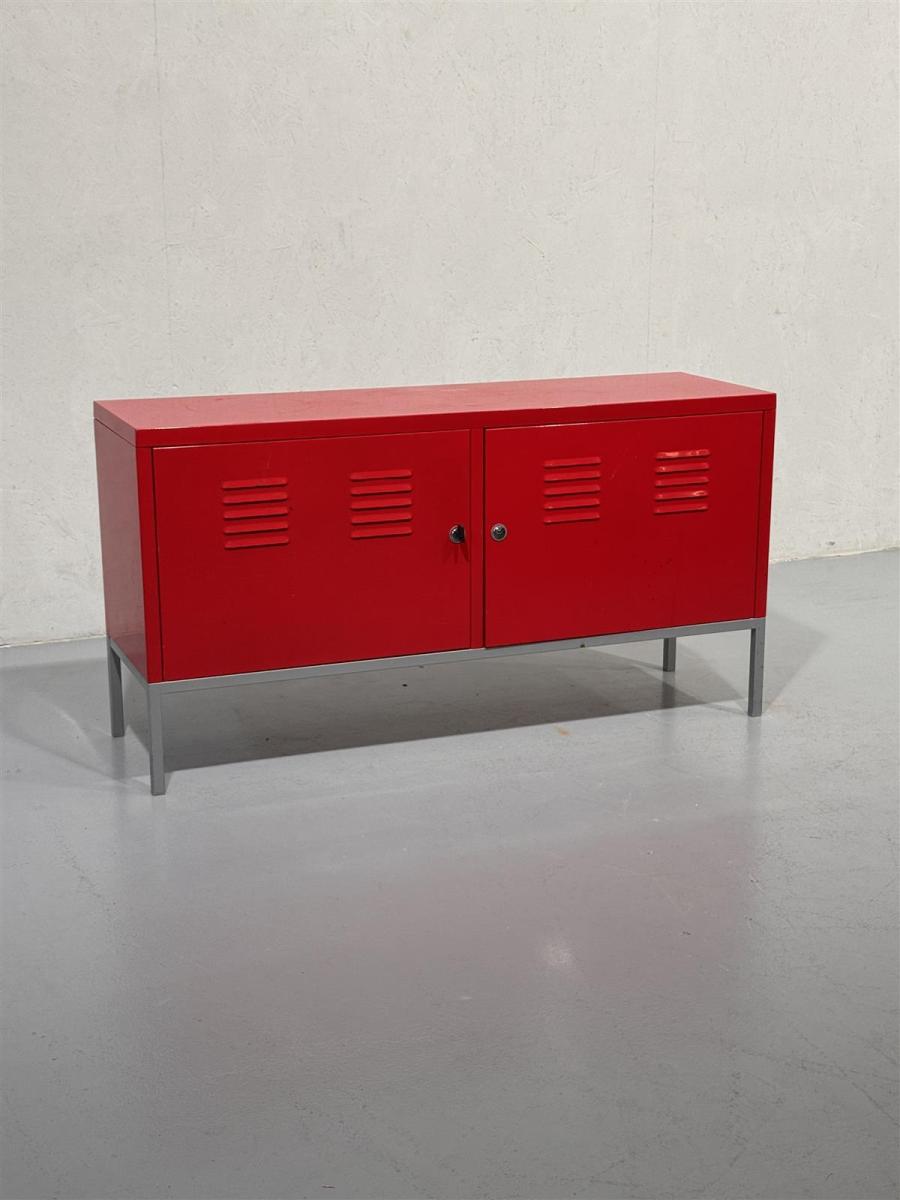 Punainen metallinen IKEA PS malliston säilytyskaappi, jossa on kaksi ovea ja tuuletusaukot. Kaappi seisoo tukevilla metallijaloilla ja siinä on lukittavat ovet, jotka tarjoavat turvallisen säilytystilan. Sopii hyvin esimerkiksi toimistoon tai varastoon.