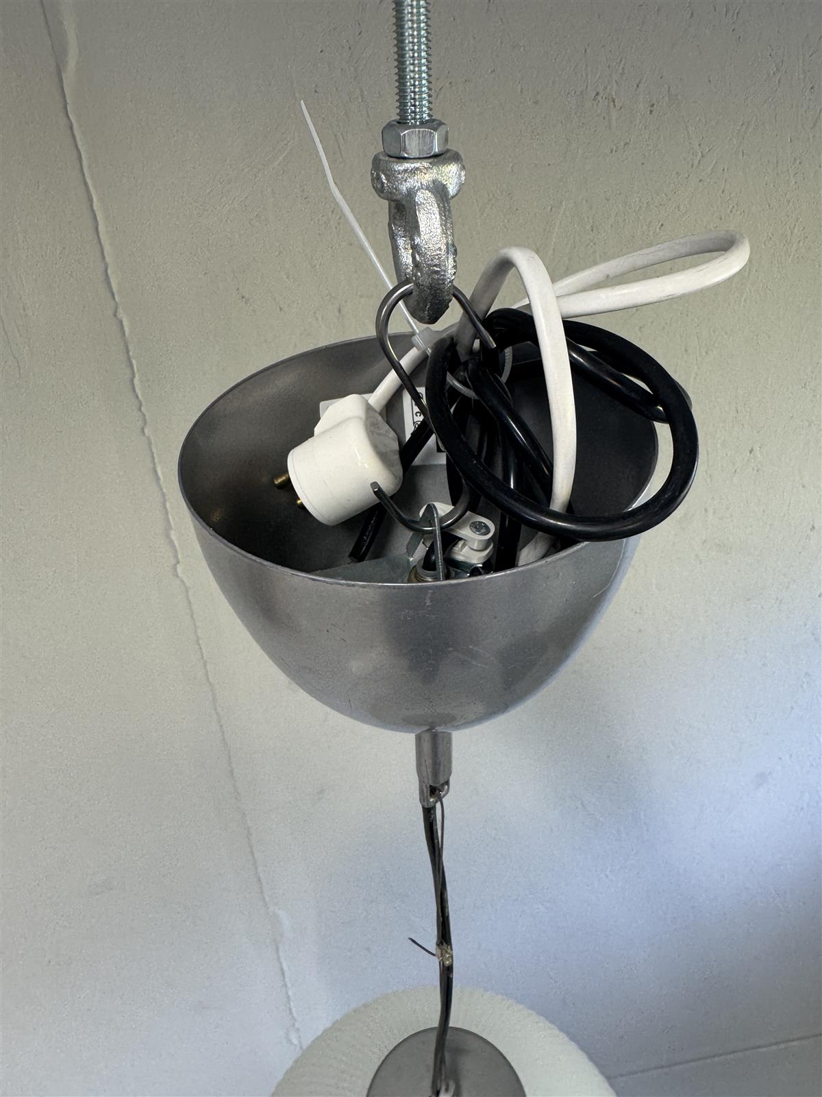 Valaisimessa on joitakin käytön jälkiä, kuten pieniä naarmuja metalliosissa ja pölyä. Johto on hieman kierteellä, mutta muuten valaisin on hyvässä kunnossa ja täysin toimiva.