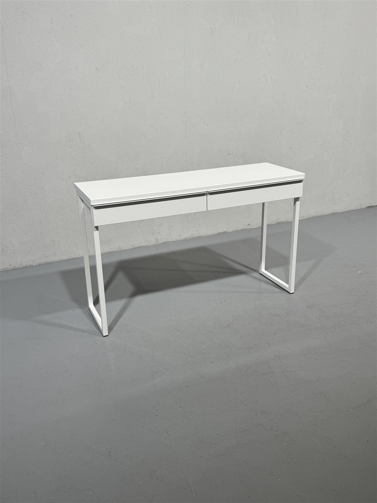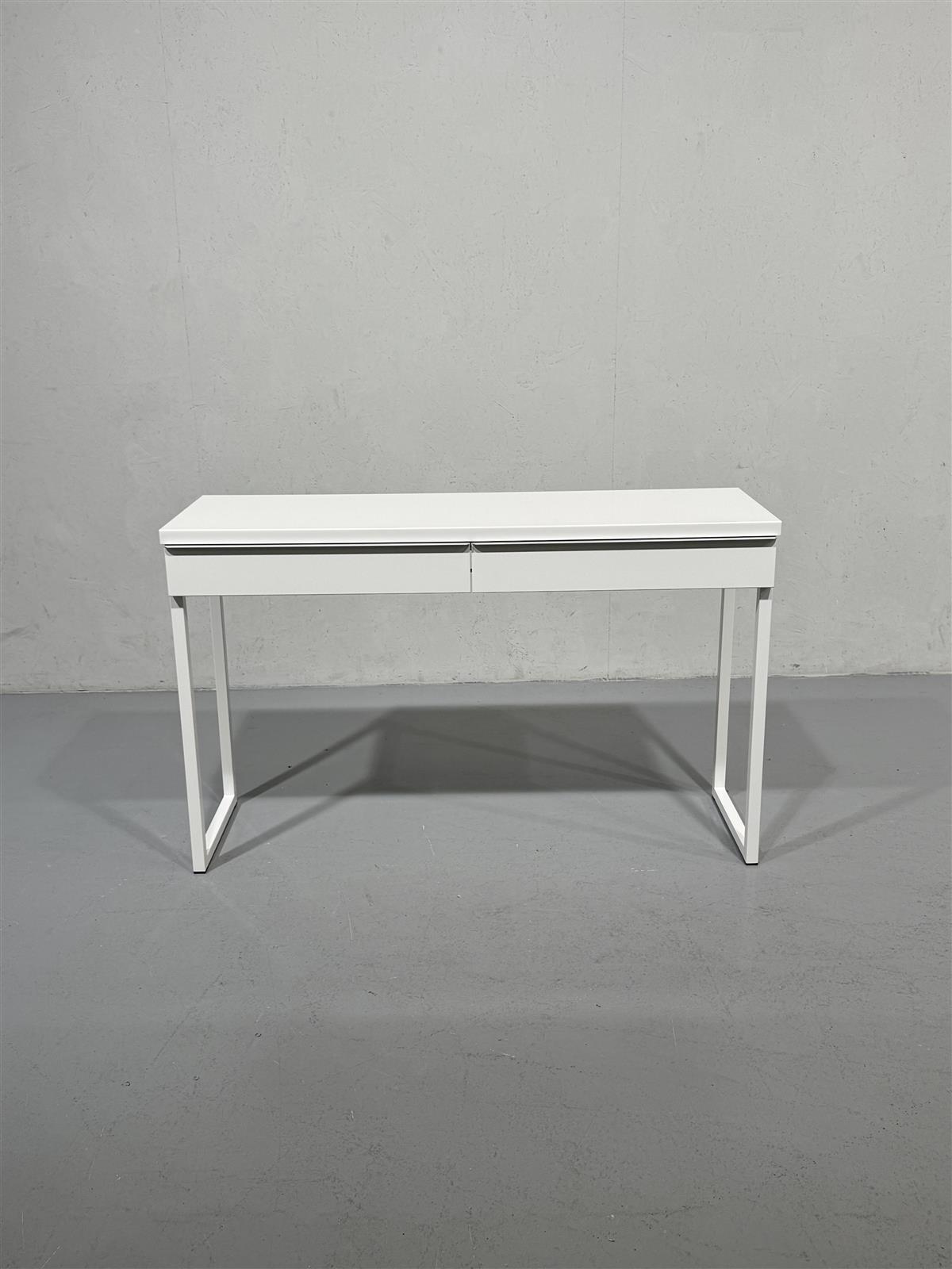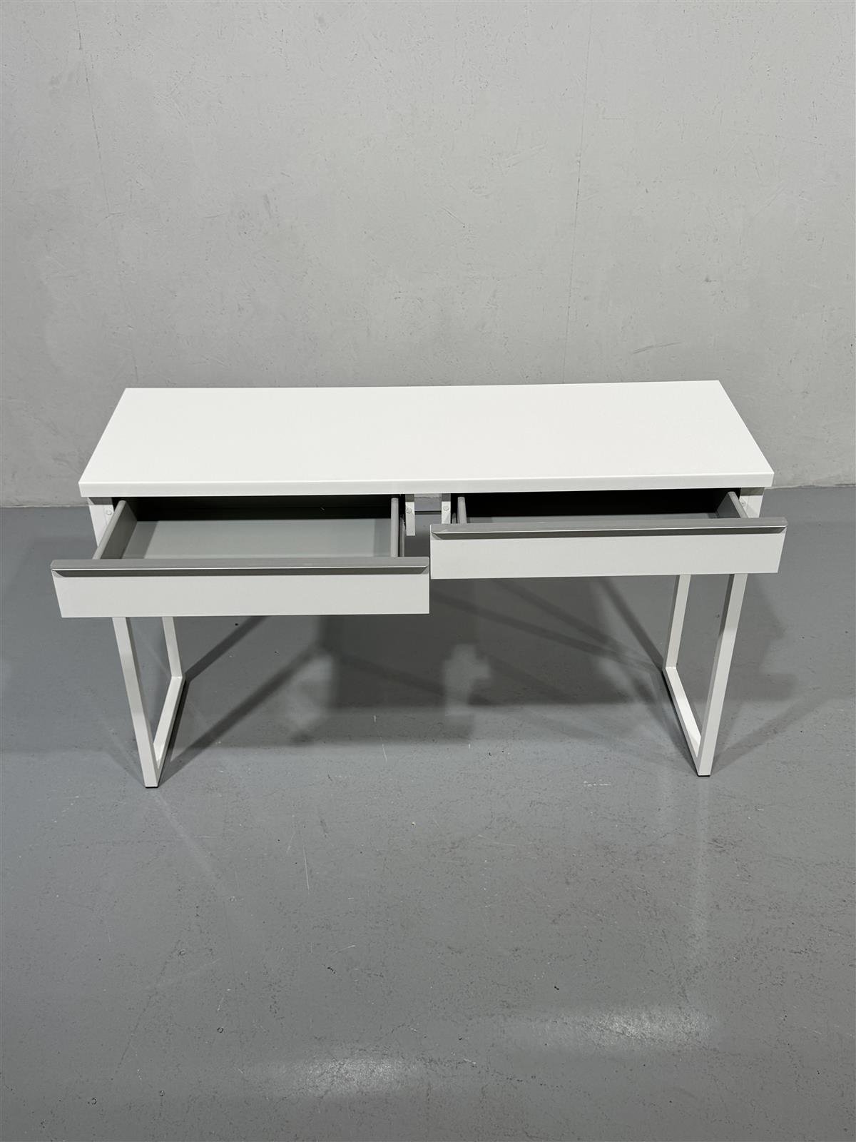 Tyylikäs Ikean moderni työpöytä, jossa on kaksi vetolaatikkoa. Valkoinen väri ja minimalistinen muotoilu tekevät siitä monikäyttöisen huonekalun moneen tilaan.