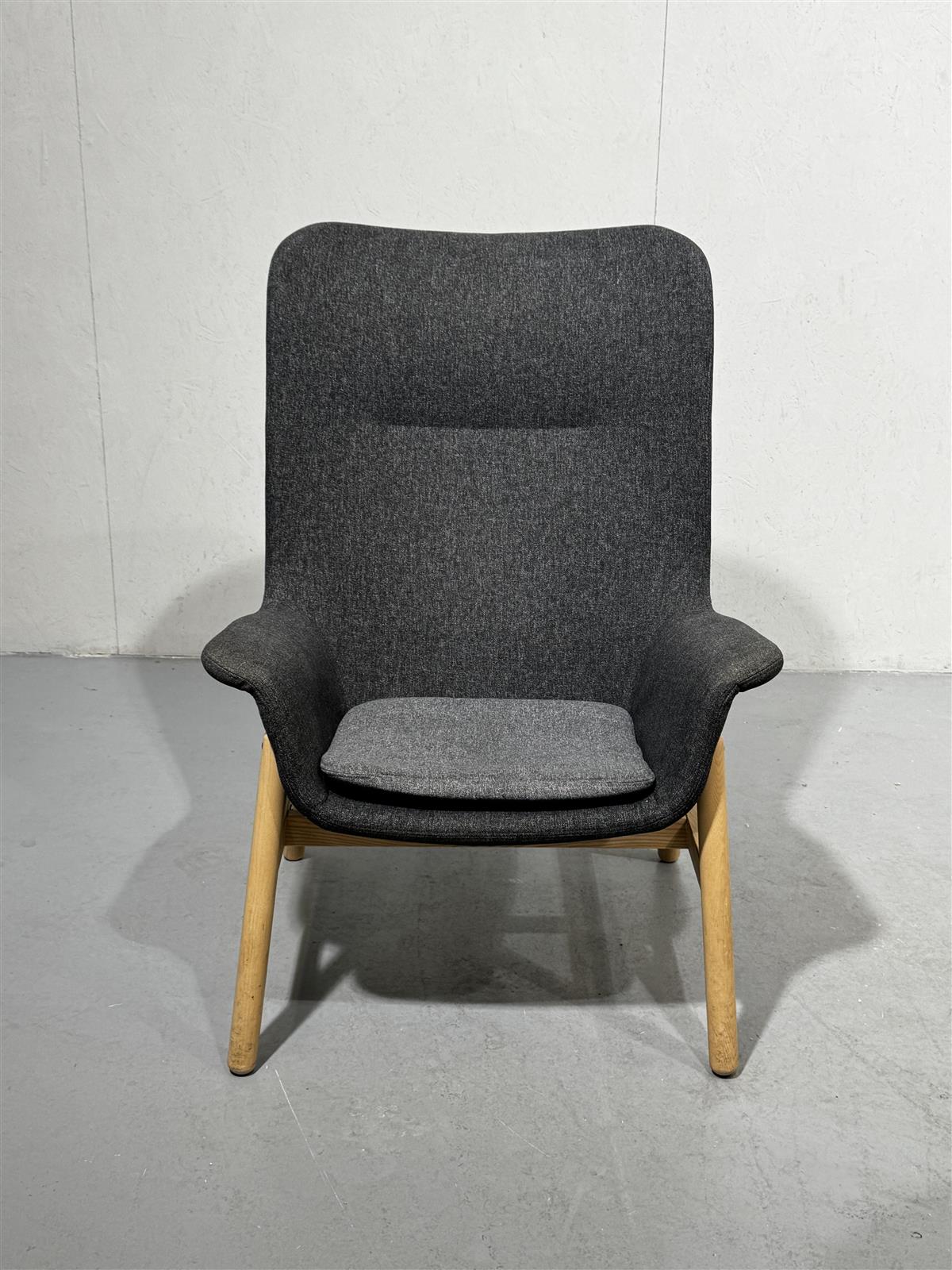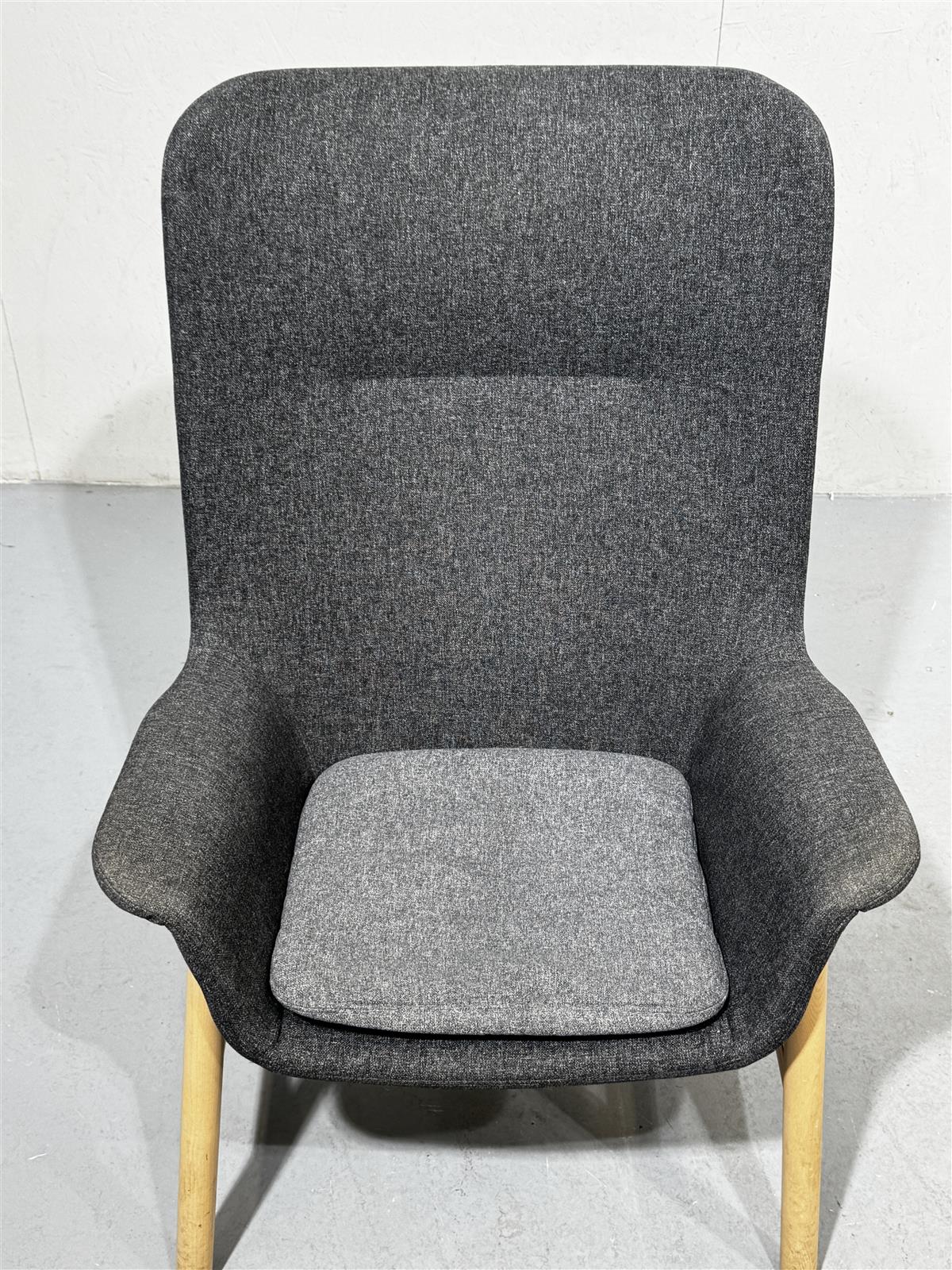 Tyylikäs Ikea Vedbo nojatuoli 1 kpl, jossa on harmaa kangasverhoilu ja puurunko. Tämä tuoli tarjoaa mukavan istumakokemuksen ja on erinomainen lisä mihin tahansa olohuoneeseen tai lukunurkkaan.