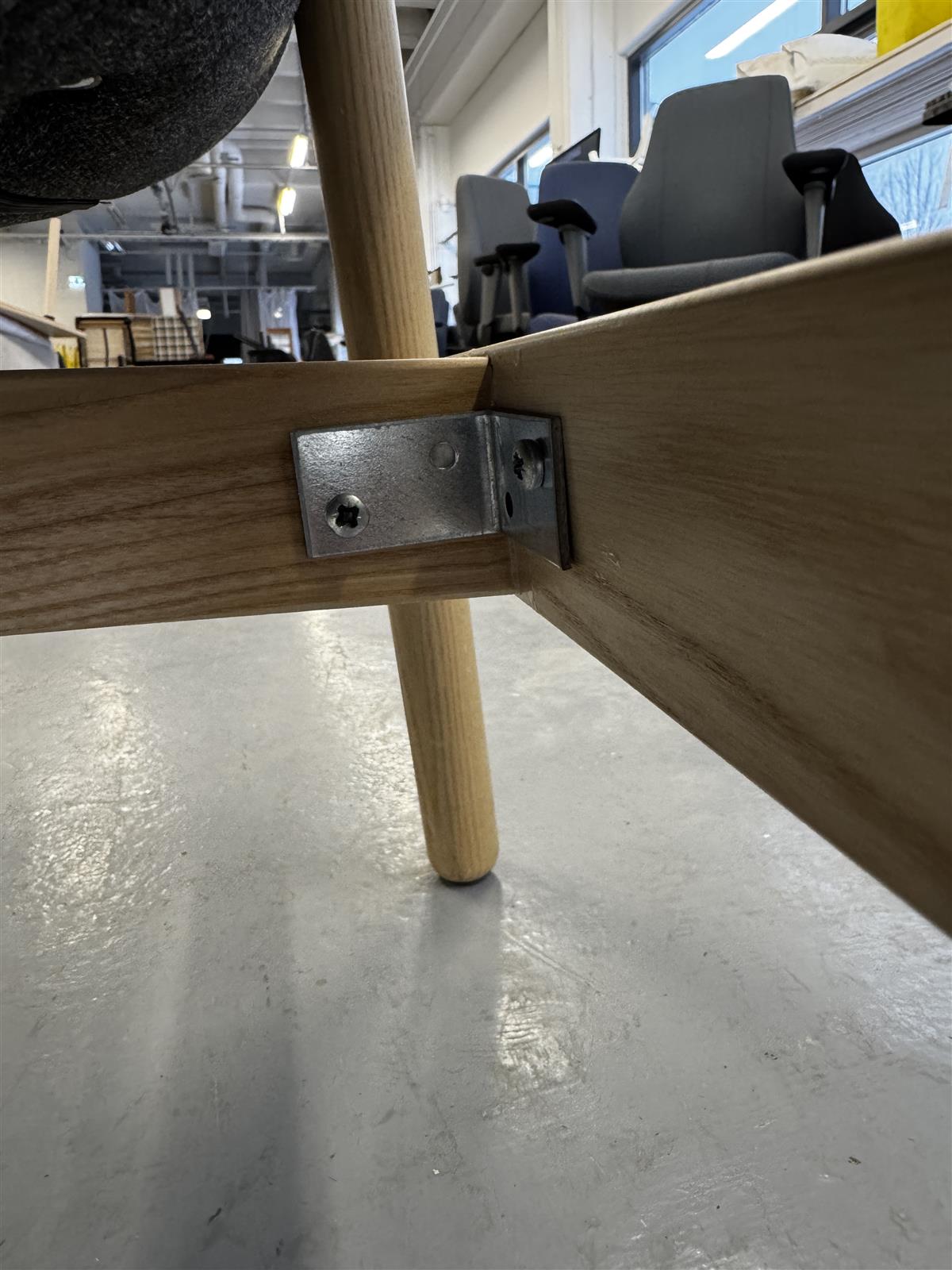 Tuolissa on havaittavissa pinnalla vähäistä kulumaa. Kangas on säilynyt siistinä, ja puuosat ovat tukevat. Istuimen rungossa lisätuentaa kulmaraudoilla ja istuimen alta puuttuu 2 tukipulttia. Kunto huomioitu hinnassa.