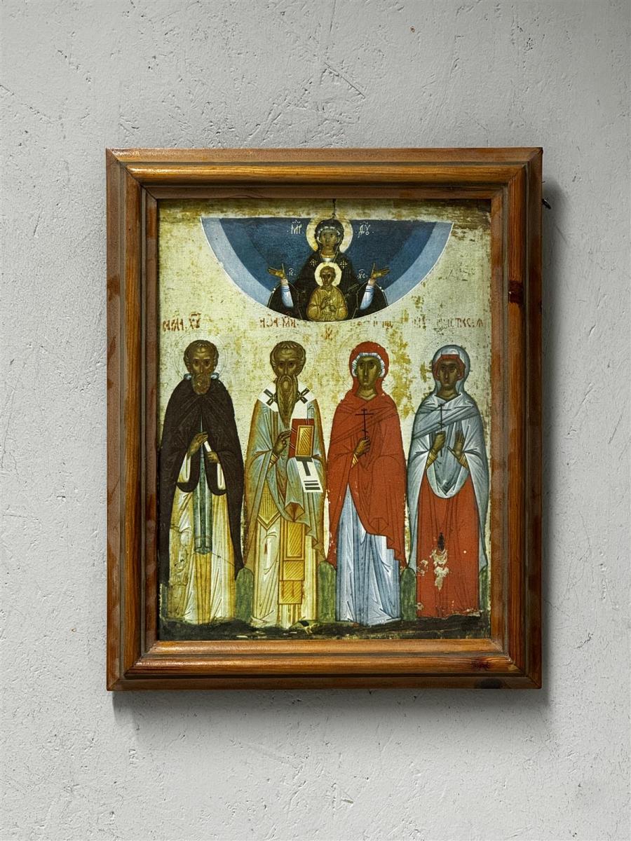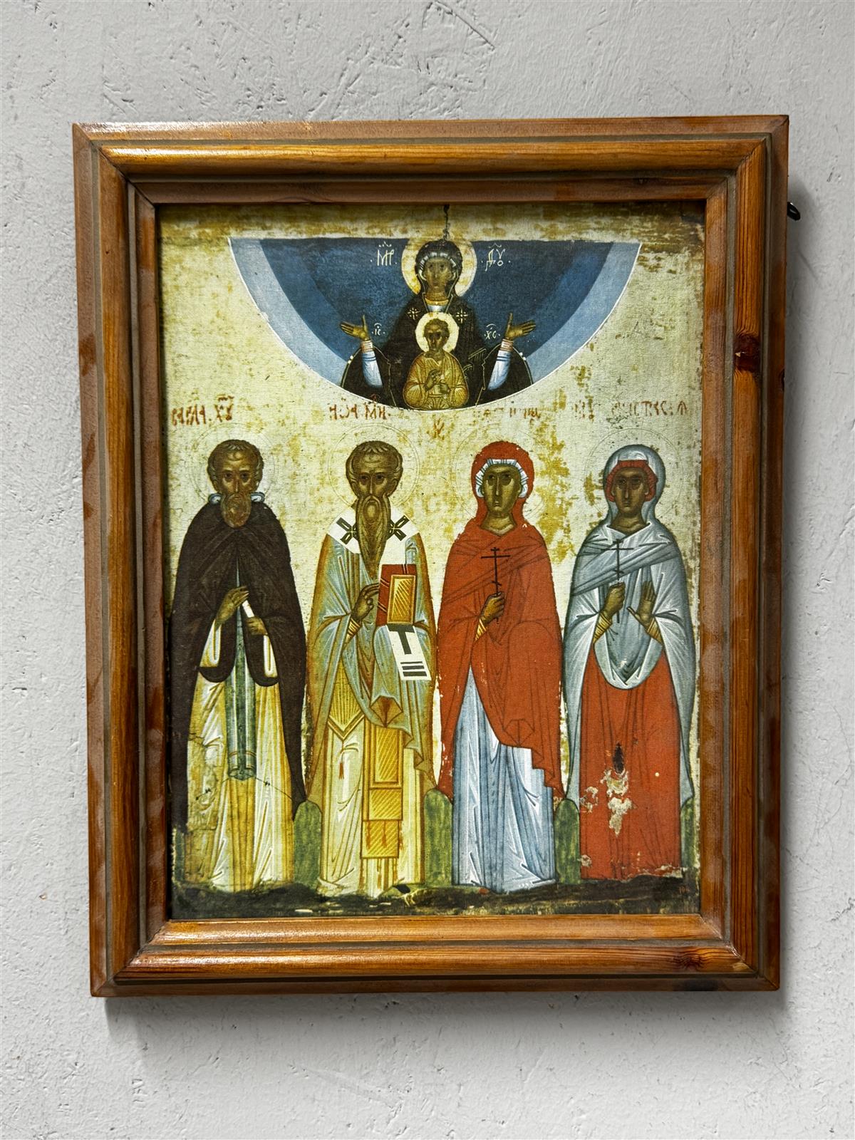 Ikoni, jossa on neljä pyhimystä ja yläosassa Neitsyt Maria ja Jeesus-lapsi. Kehys on puuta ja siinä on kulumaa ja naarmuja, mutta se on edelleen tukeva. Painettu kuva kankaalle. Taustalla on venäjänkielistä tekstiä, joka viittaa ikonien perinteiseen tyyliin ja alkuperään.