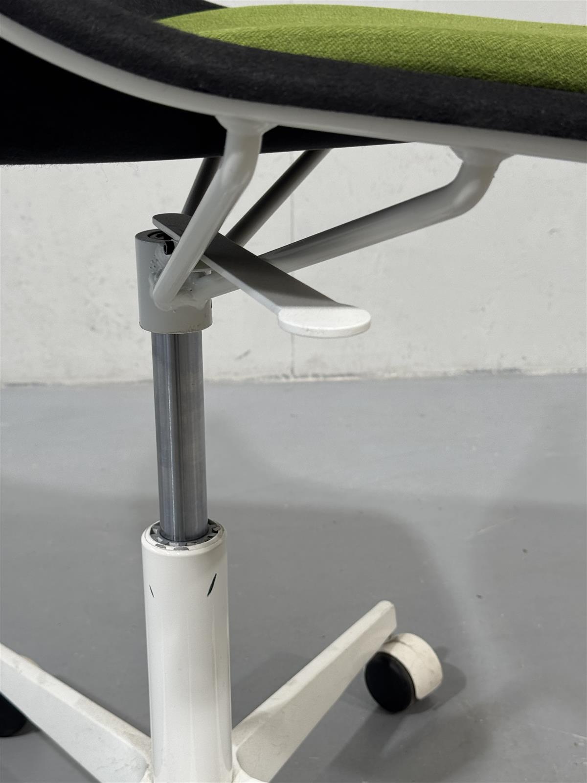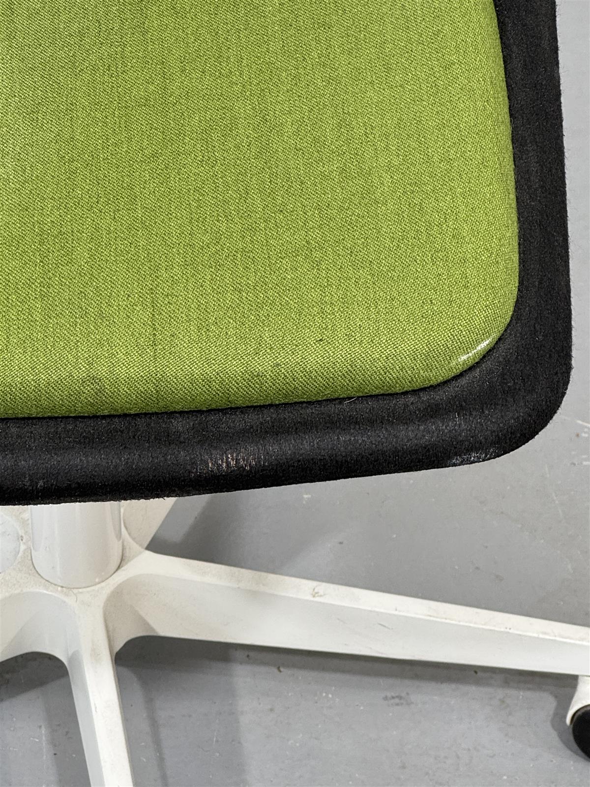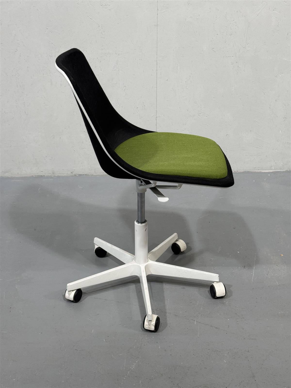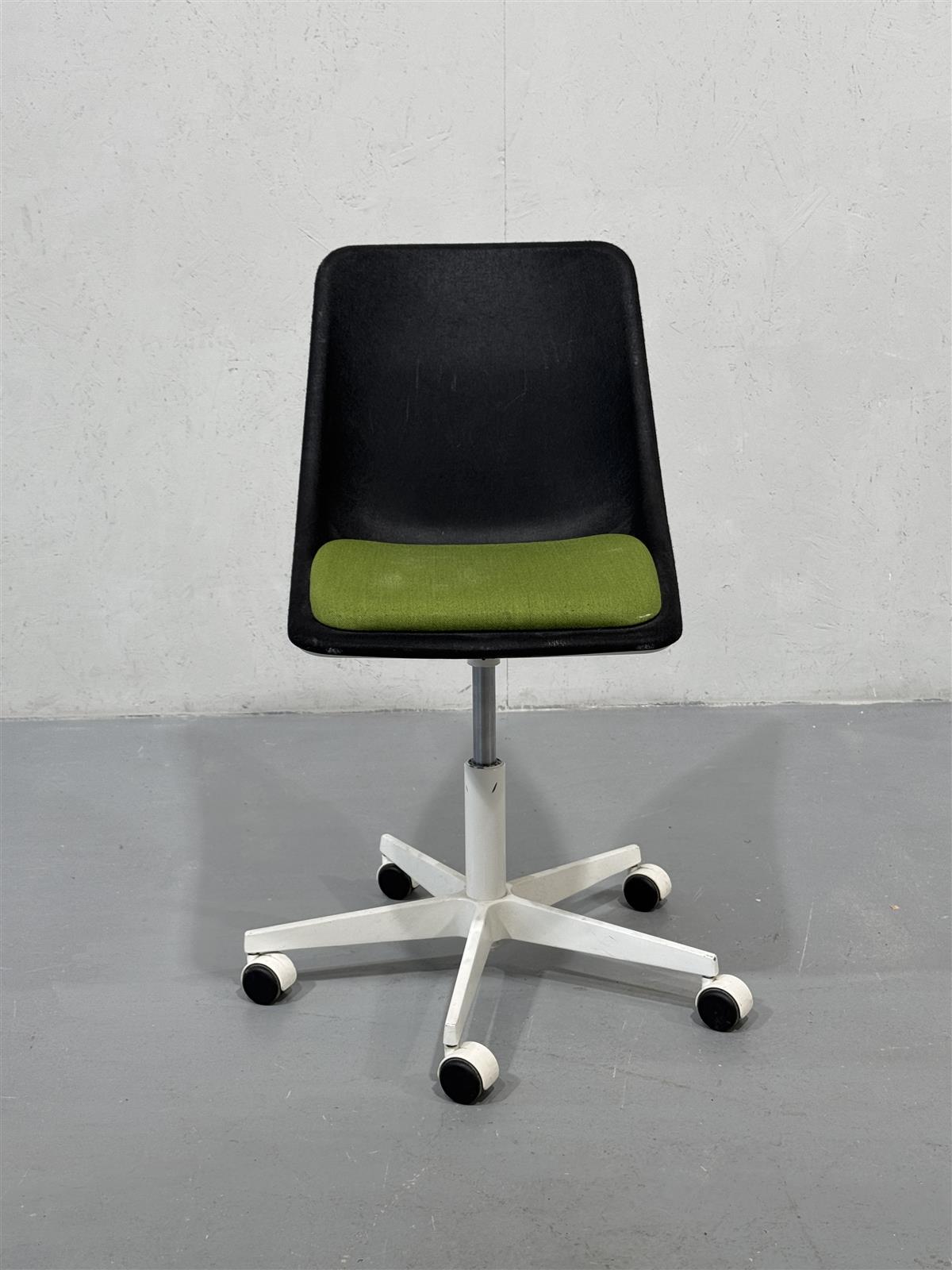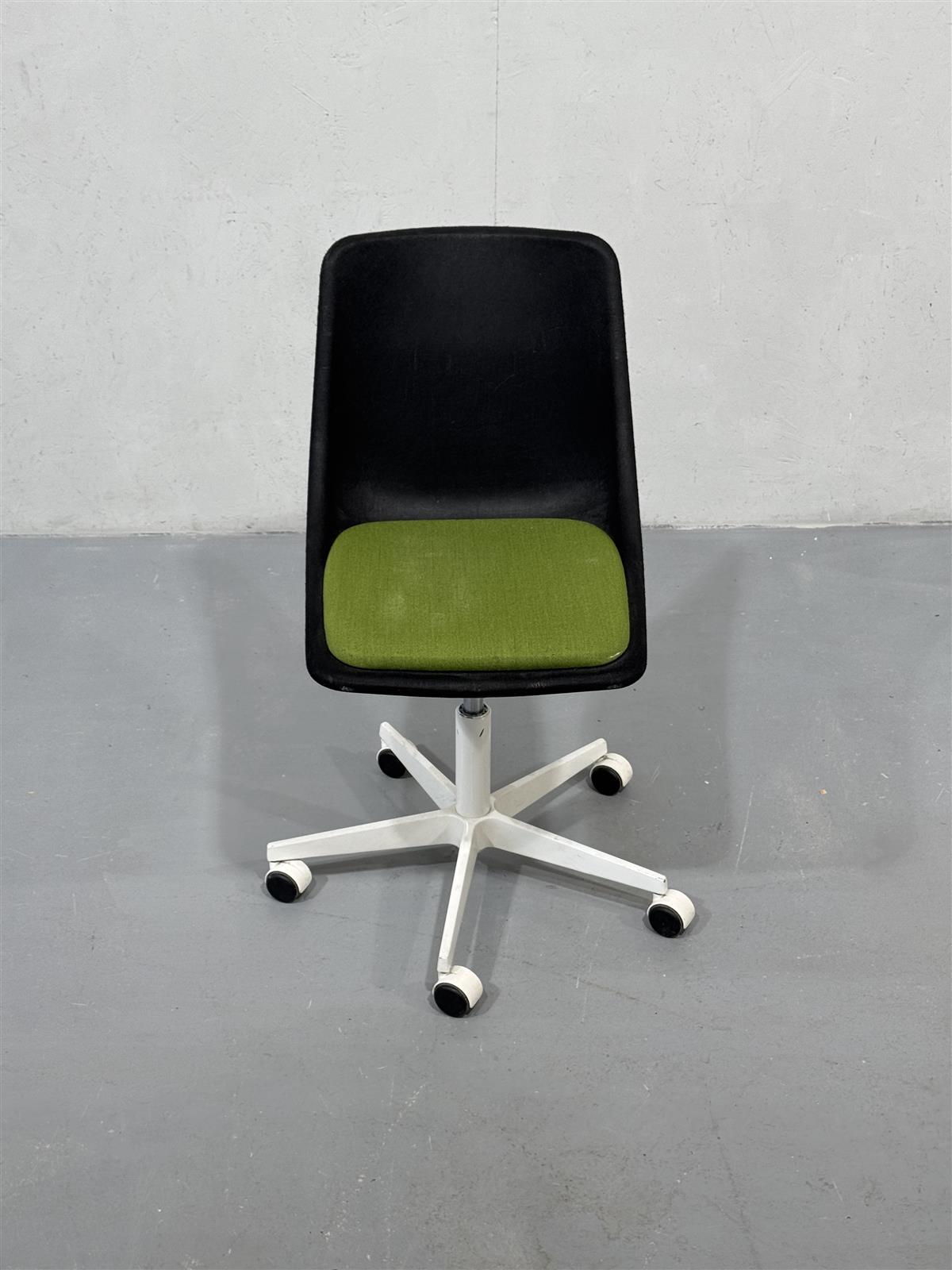 Tyylikäs mustalla istuimella ja vihreällä pehmusteella varustettu moderni työtuoli Inno Kola Stac Z. Alla valkoiset metallijalat ja pyörät, ergonominen valinta kotitoimistoon. Istuin kovamuovi/lasikuitu-pohjainen, verhoiltu mustalla kankaalla.