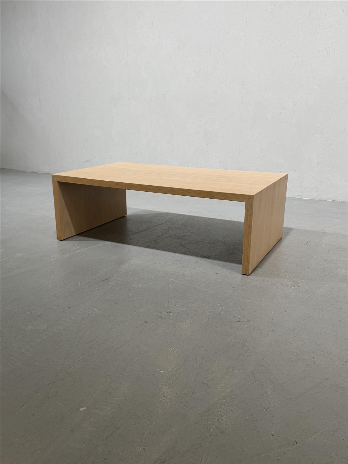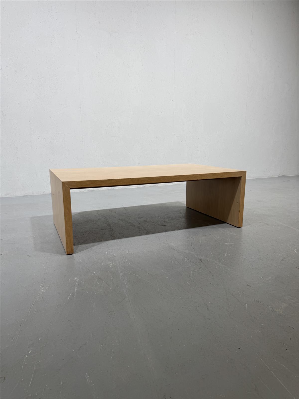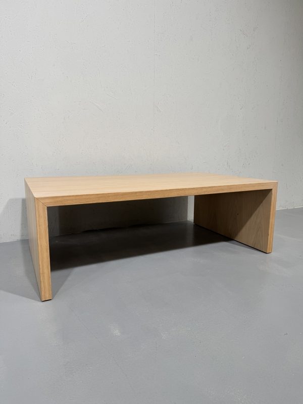 Isku laakajalkainen sohvapöytä. Minimalistinen tyyliltään, valkovahattu pinta ja yksinkertaiset linjat.