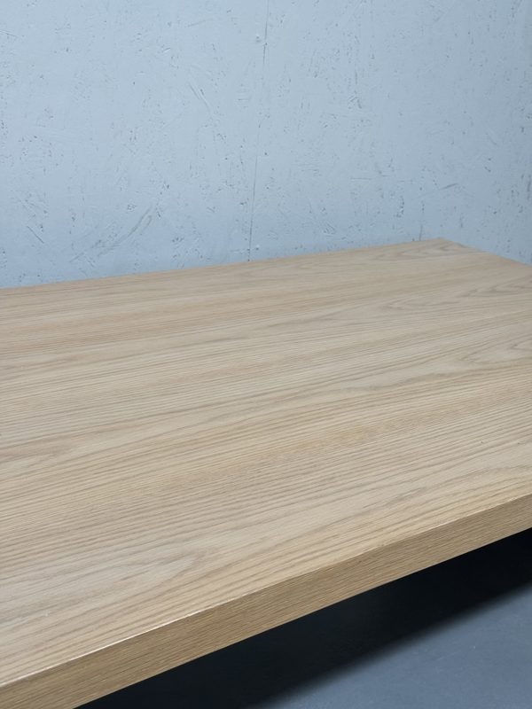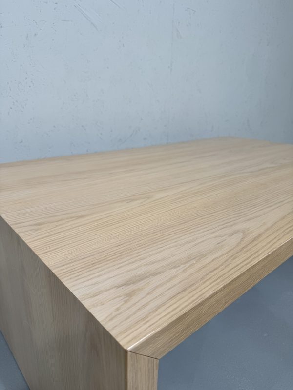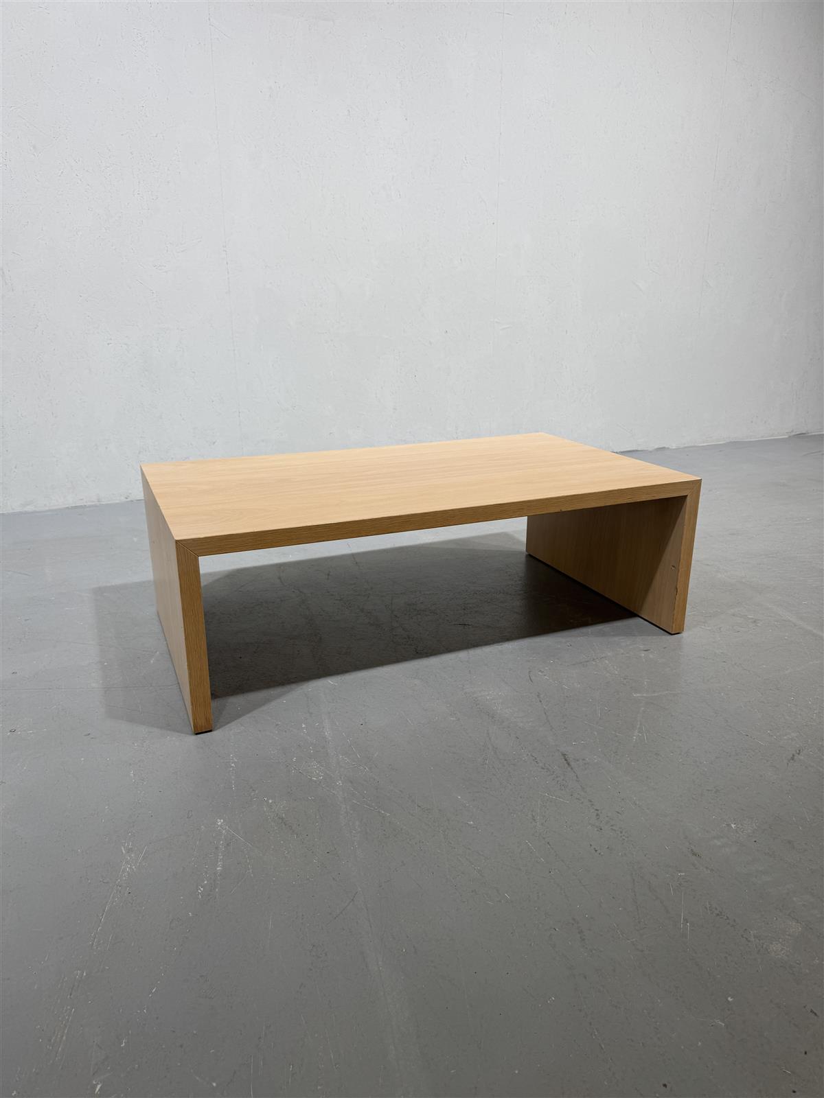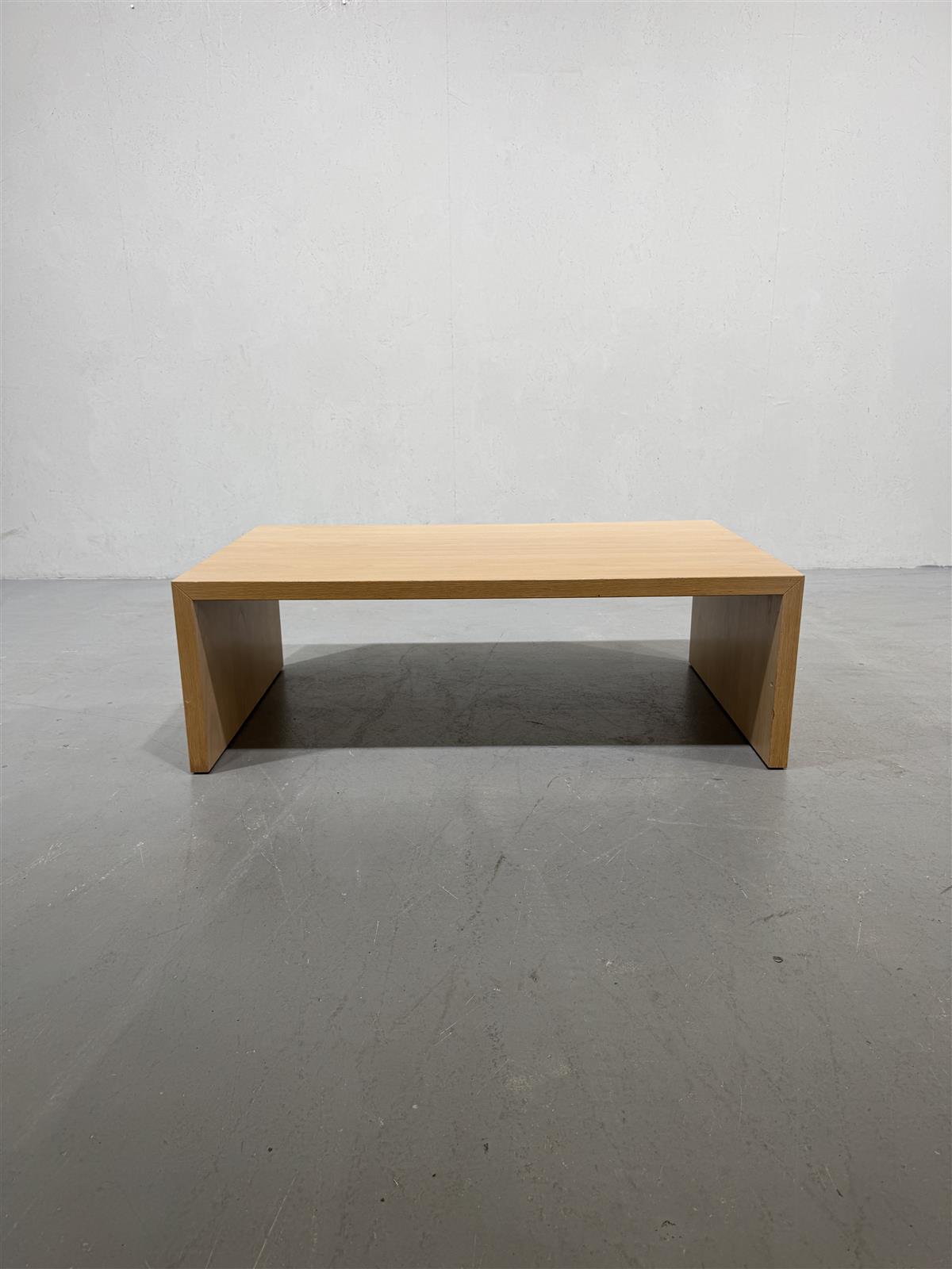 Isku laakajalkainen sohvapöytä. Minimalistinen tyyliltään, valkovahattu pinta ja yksinkertaiset linjat.