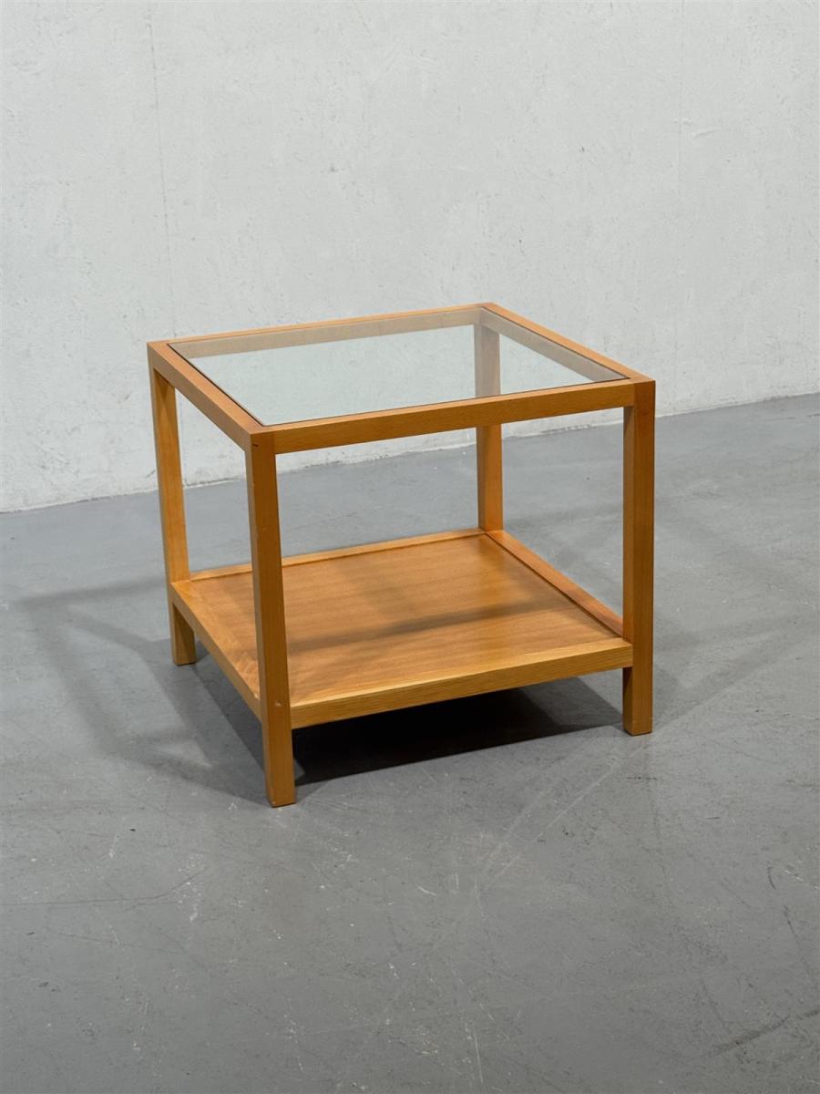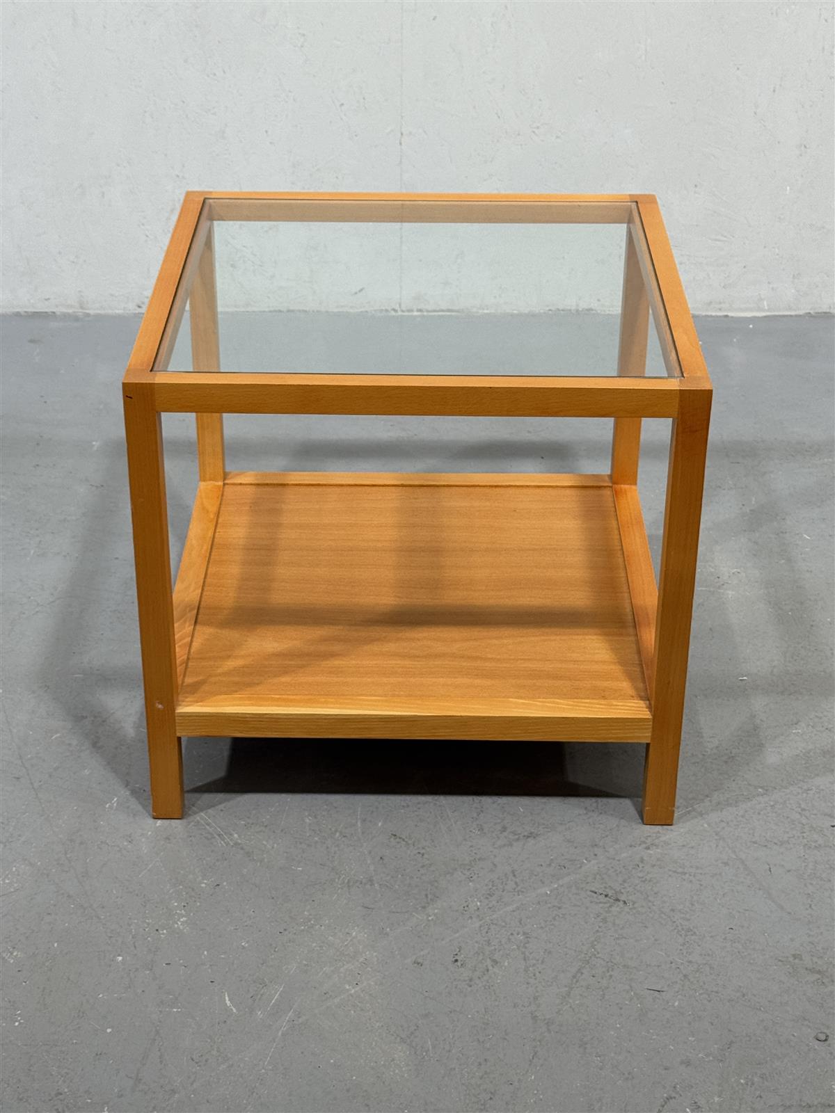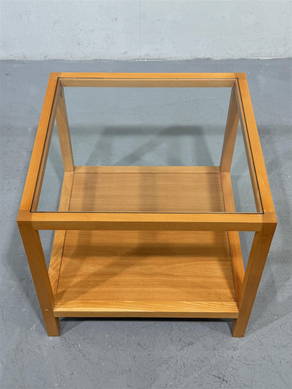 Pöydän kunto on hyvä, mutta puupinnassa on pieniä käytön jälkiä. Lasikansi on ehjä ja kirkas, mikä korostaa pöydän modernia ilmettä.