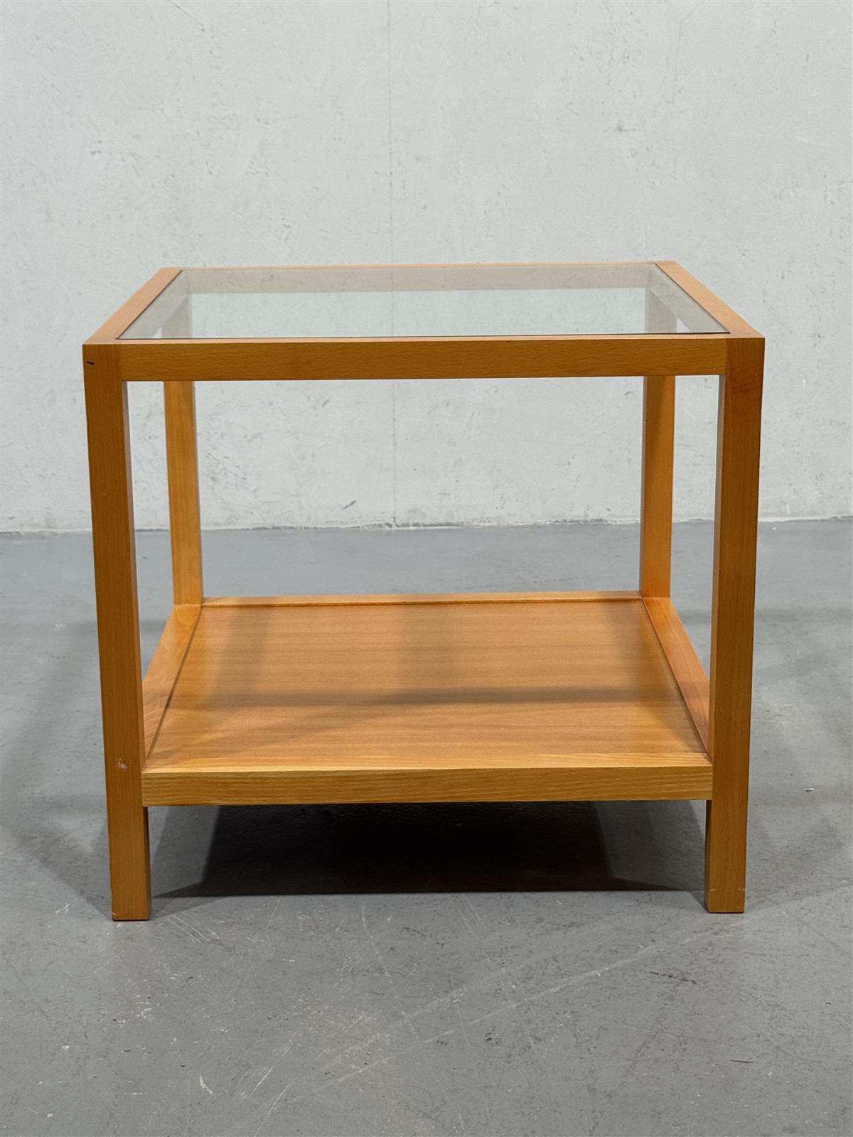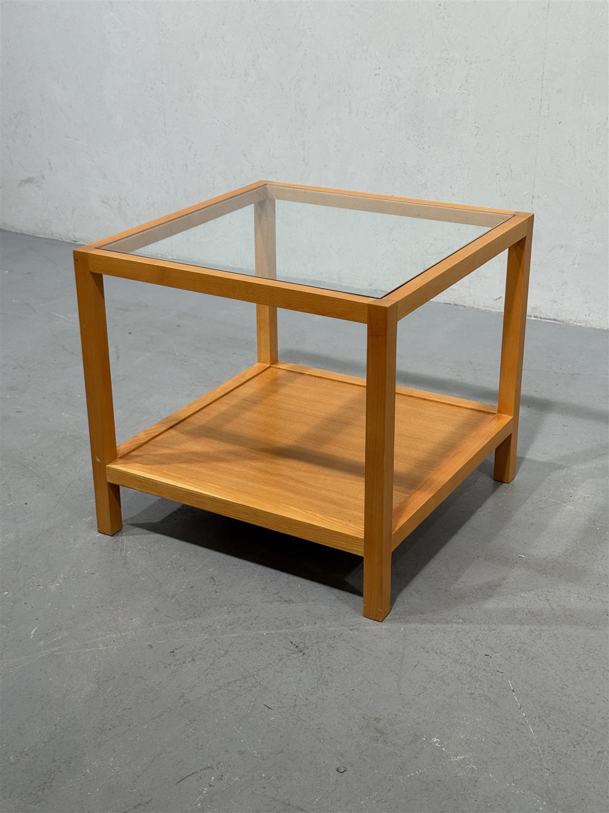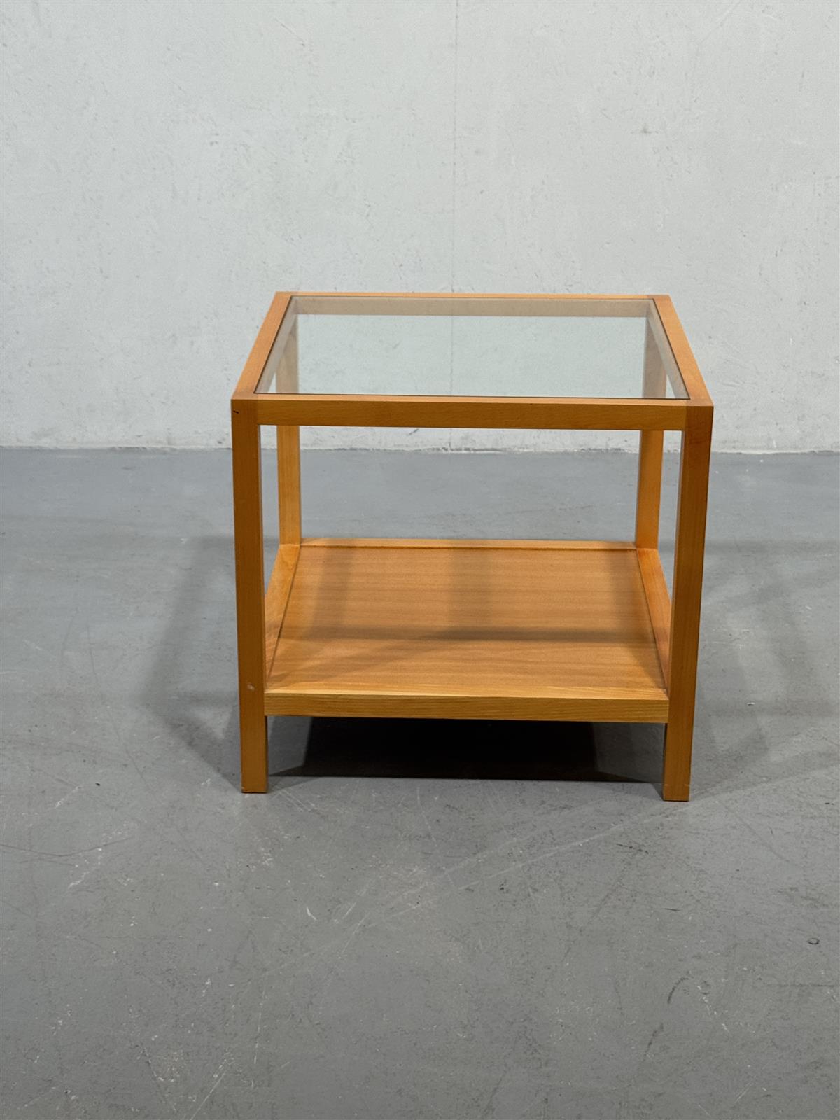 Pöydän kunto on hyvä, mutta puupinnassa on pieniä käytön jälkiä. Lasikansi on ehjä ja kirkas, mikä korostaa pöydän modernia ilmettä.