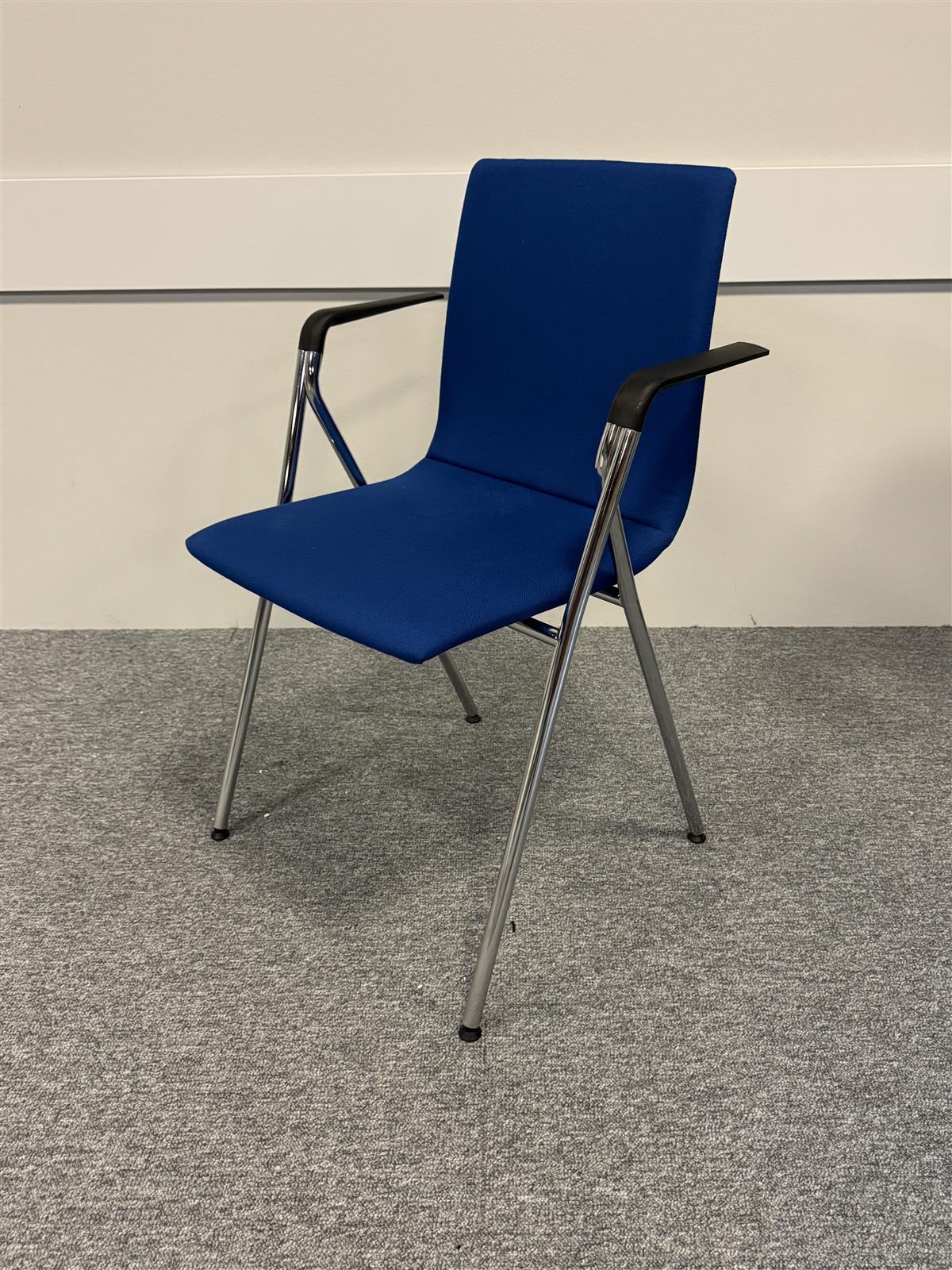 Neljä modernia Isku Rudolf tuolia, joissa on sininen kangasverhoiltu istuinosa ja mustat käsinojat. Tuolien jalat ovat metallia ja niissä on tukeva rakenne, pinottavissa.