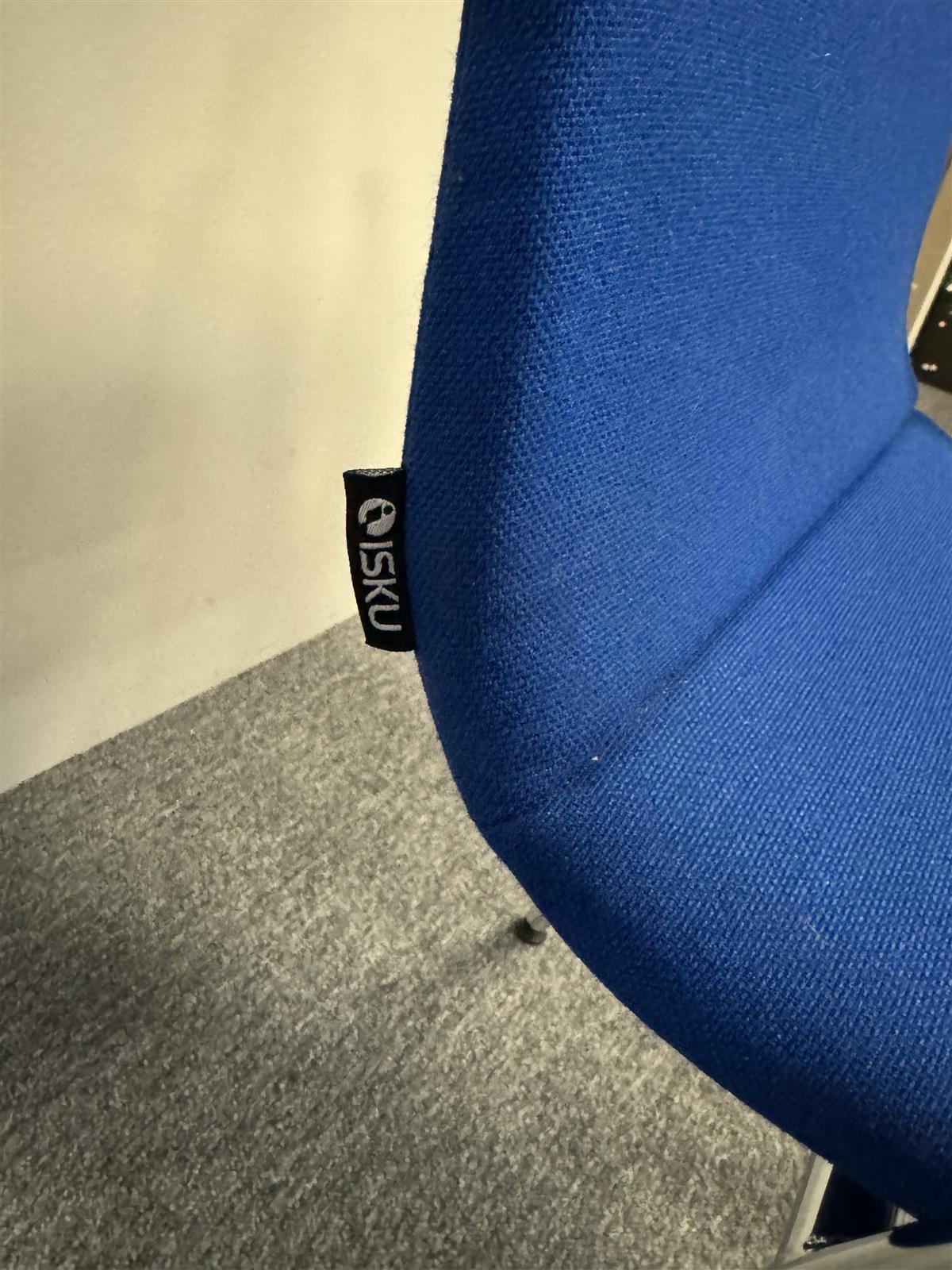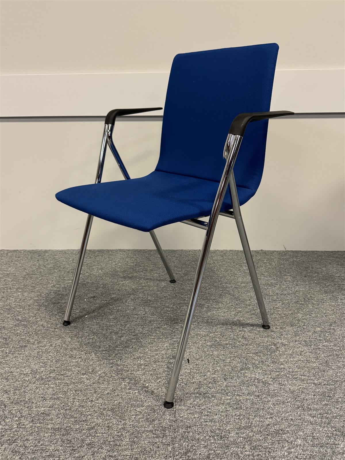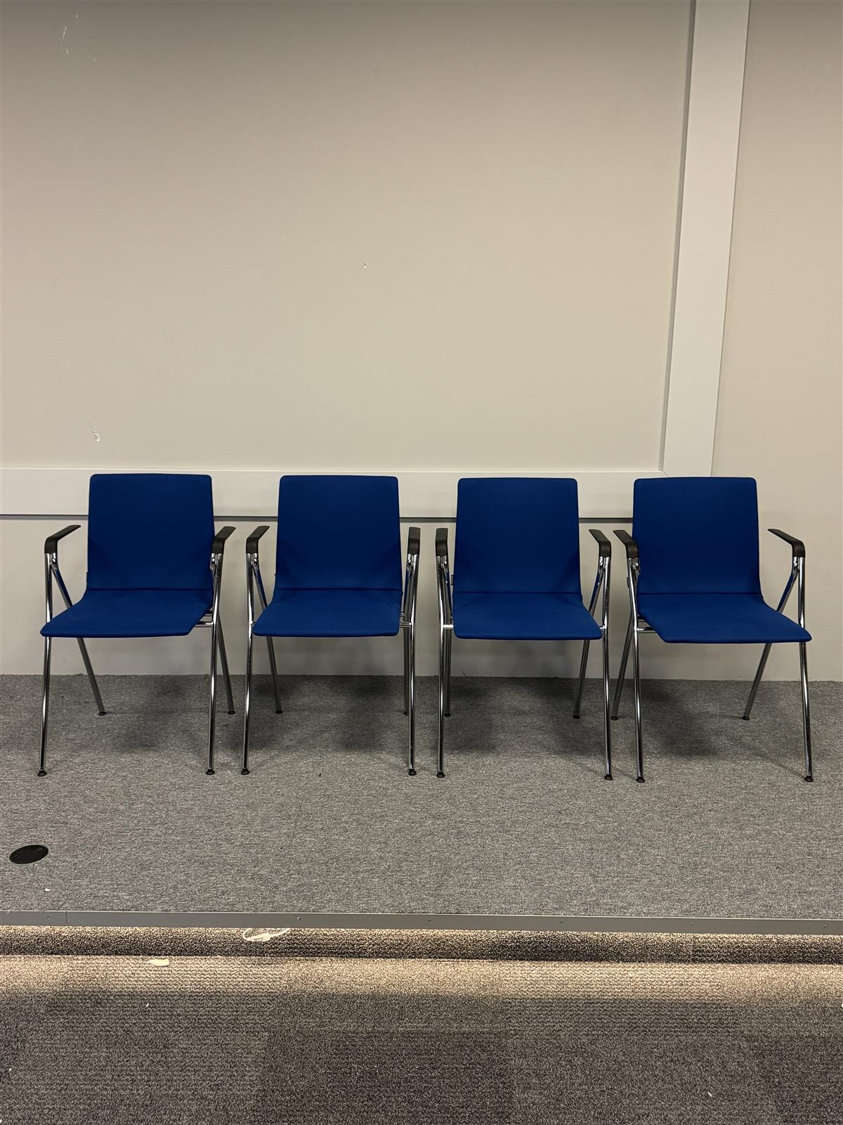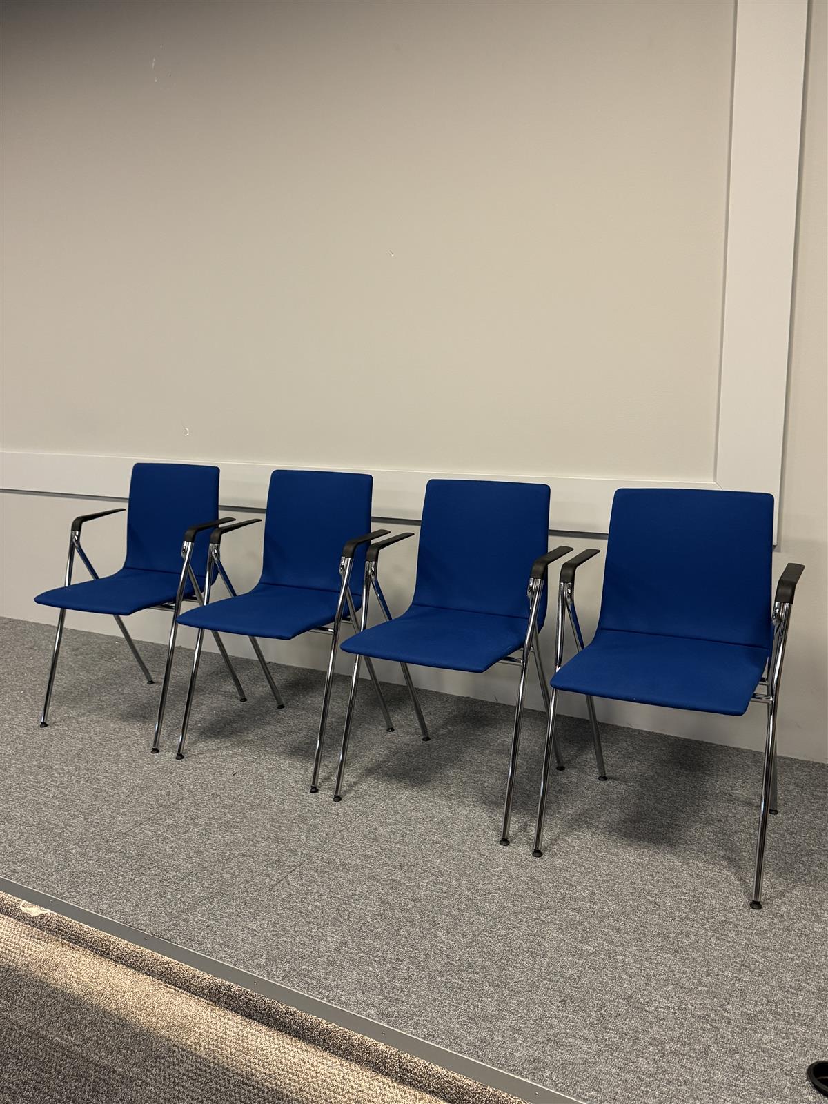 Neljä modernia Isku Rudolf tuolia, joissa on sininen kangasverhoiltu istuinosa ja mustat käsinojat. Tuolien jalat ovat metallia ja niissä on tukeva rakenne, pinottavissa.