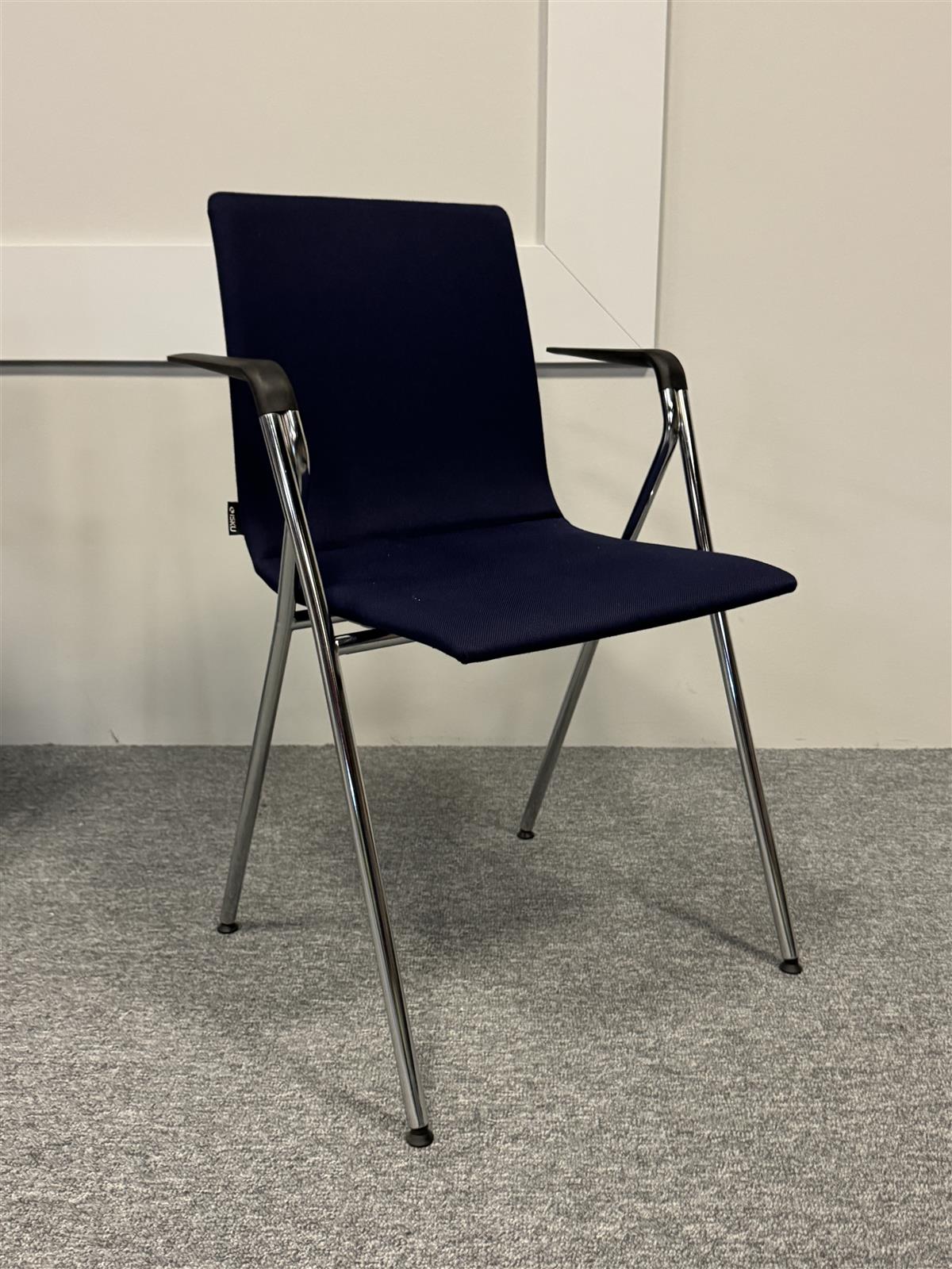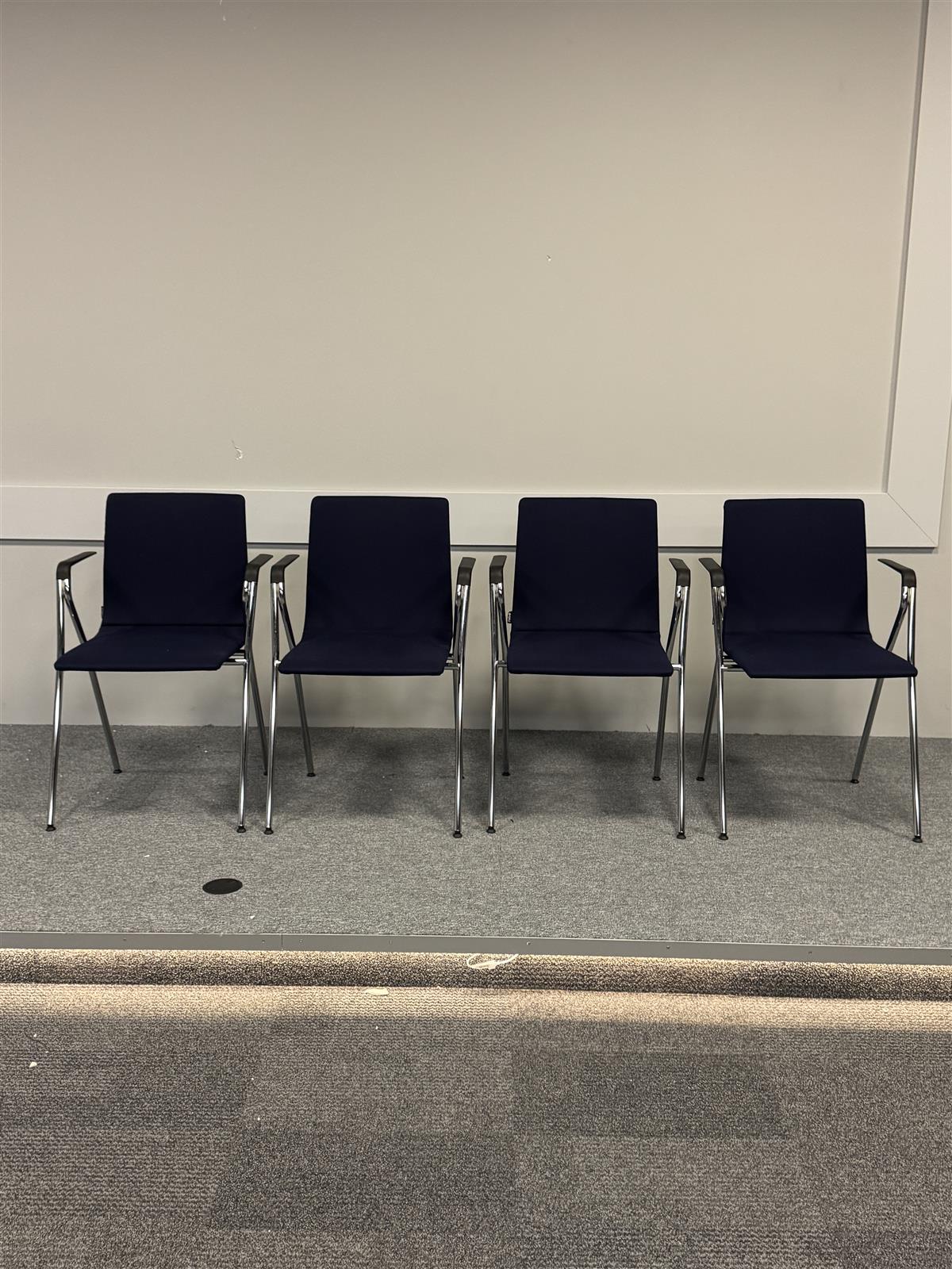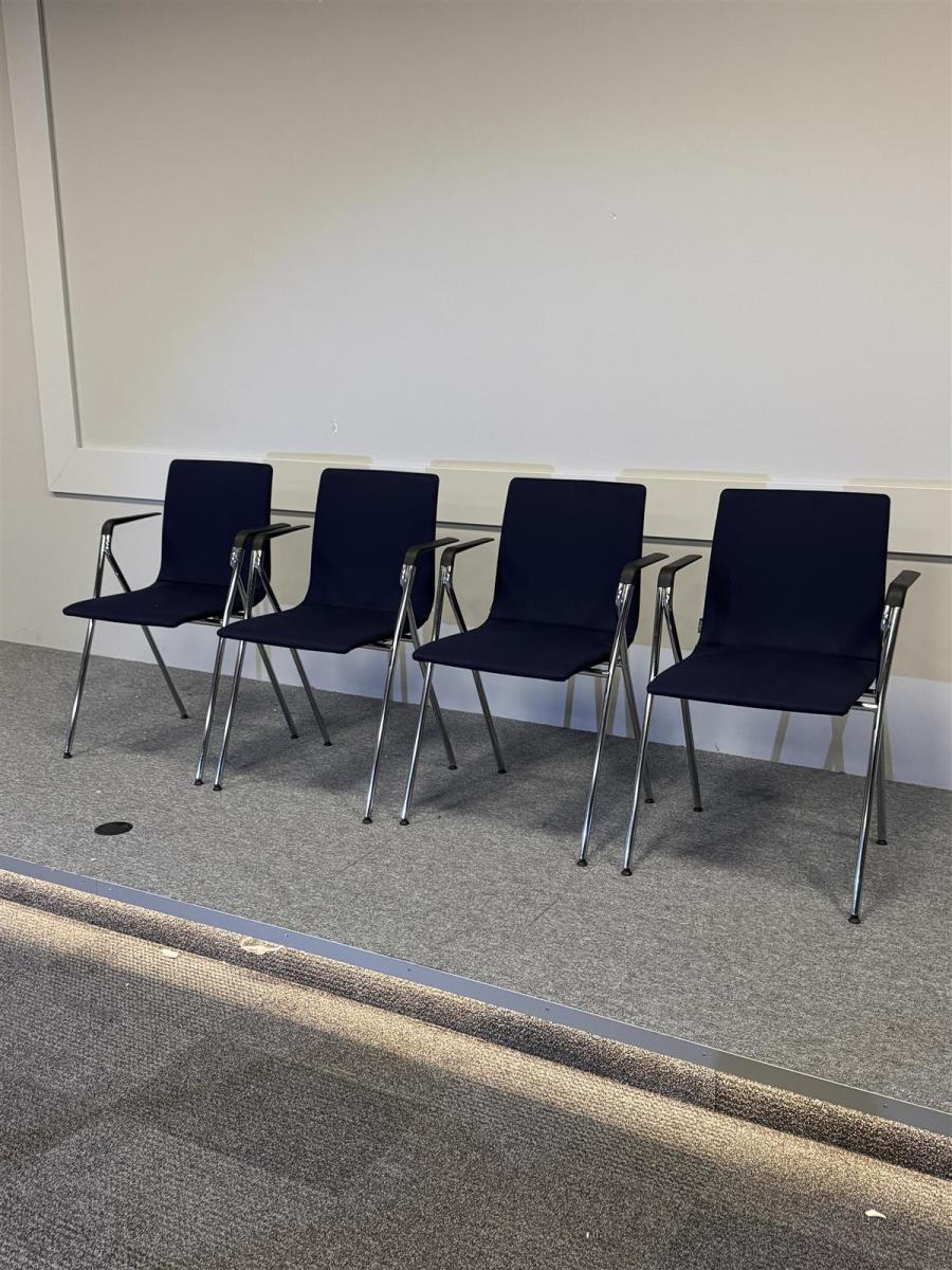 Neljä modernia Isku Rudolf tuolia, joissa on tummansininen kangasverhoiltu istuinosa ja mustat käsinojat. Tuolien jalat ovat metallia ja niissä on tukeva rakenne, pinottavissa.