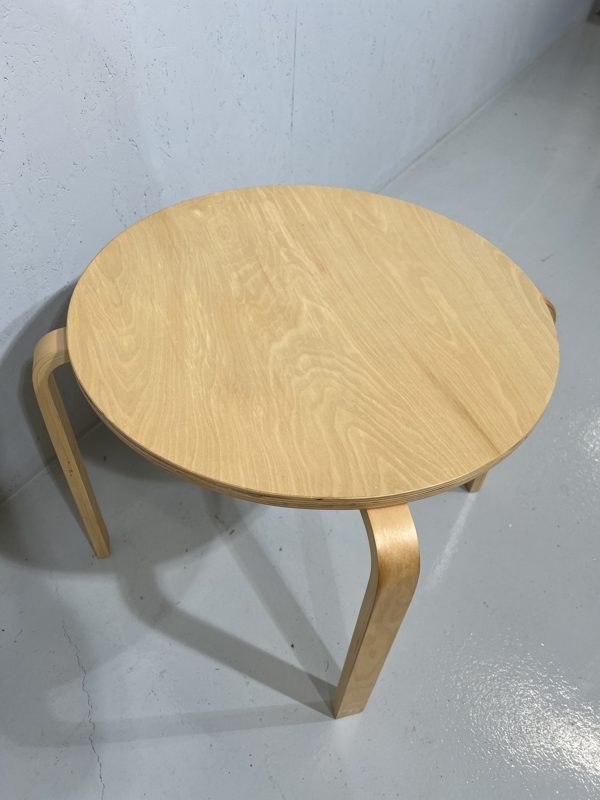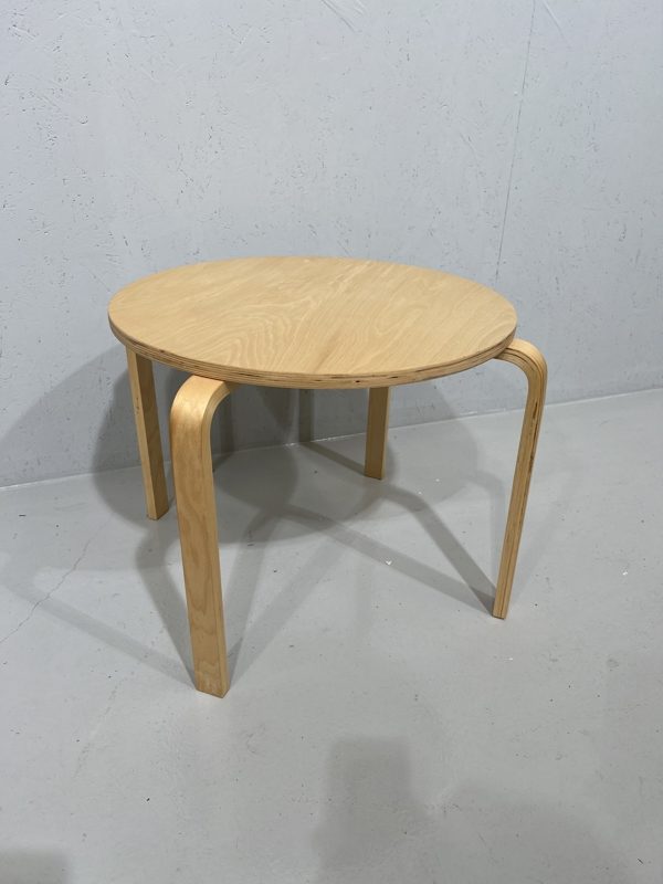 Pyöreä sohvapöytä kaarevilla puu jaloilla.