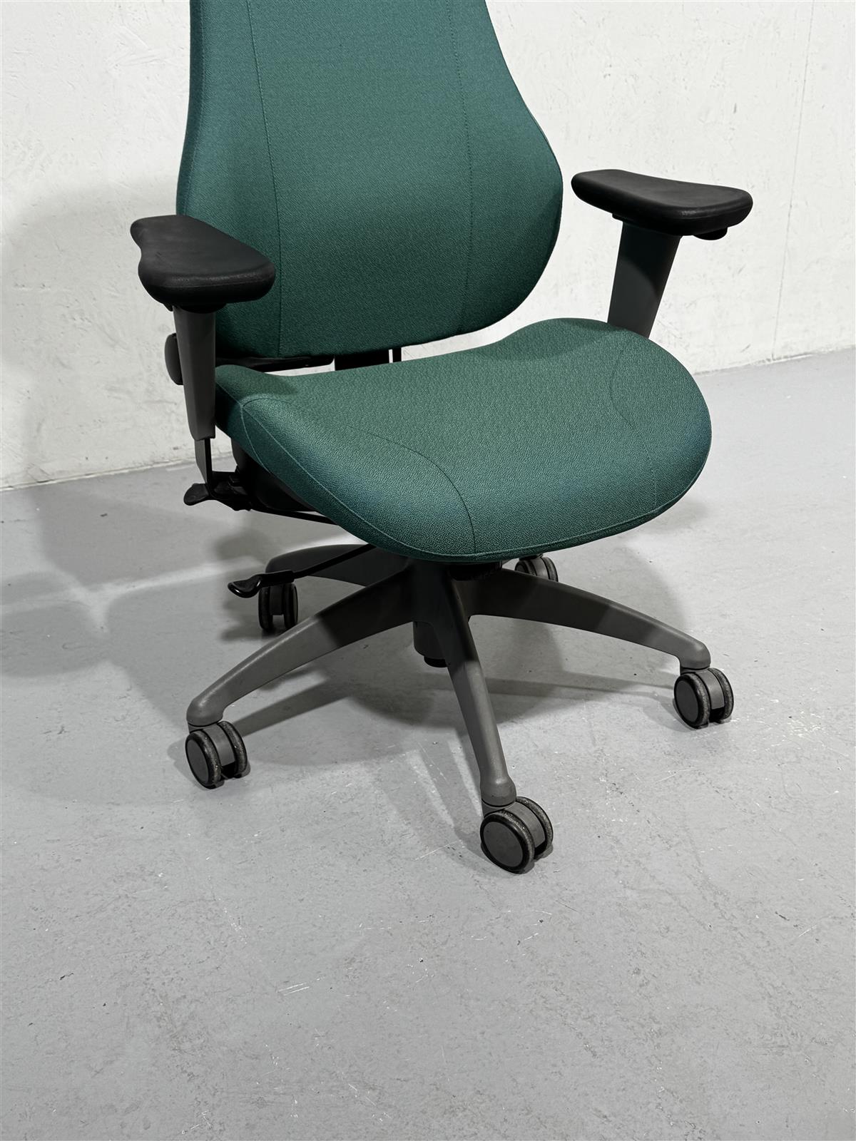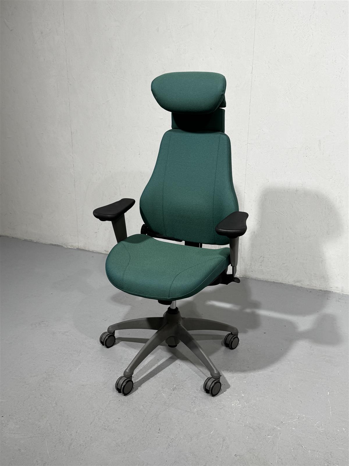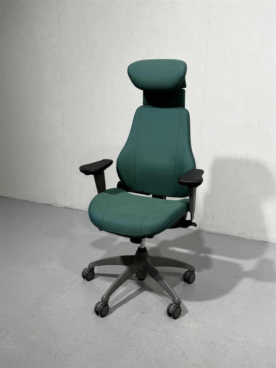 Isku Step merkkinen korkeaselkäinen toimistotuoli, jossa on säädettävä niskatuki ja pyörät. Tuolissa on vihreä verhoilu ja mustat käsinojat.