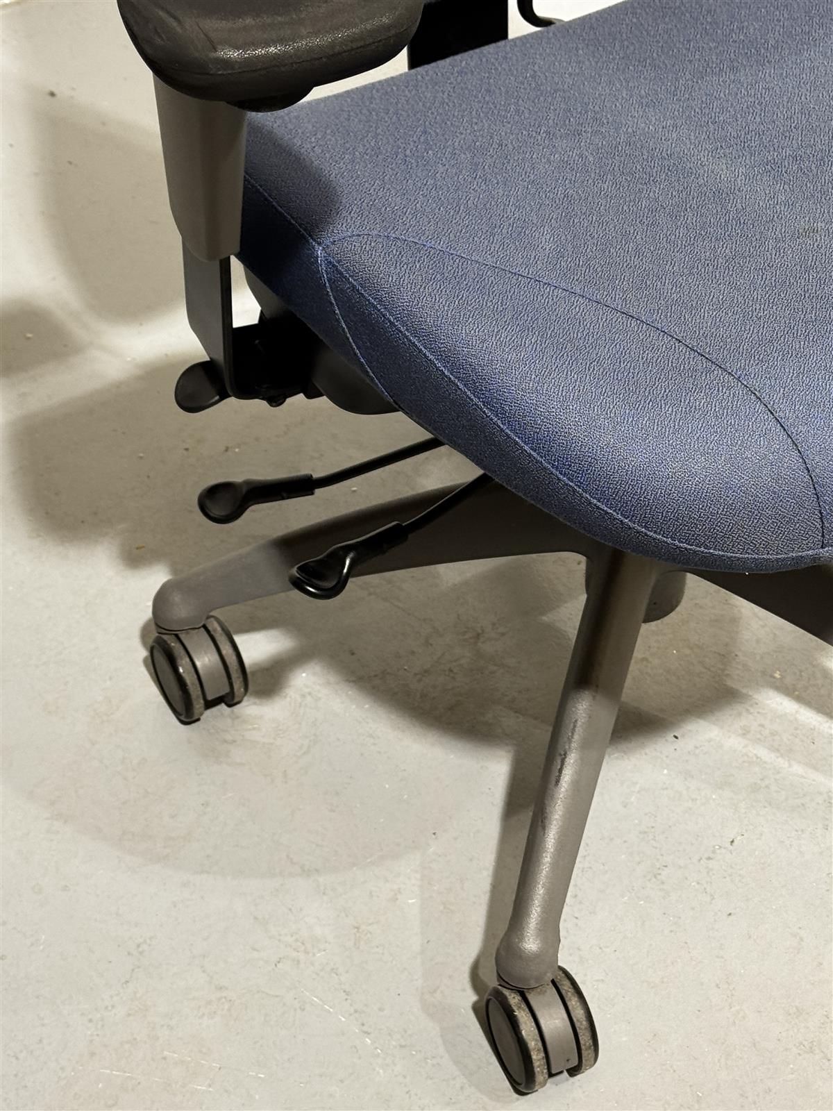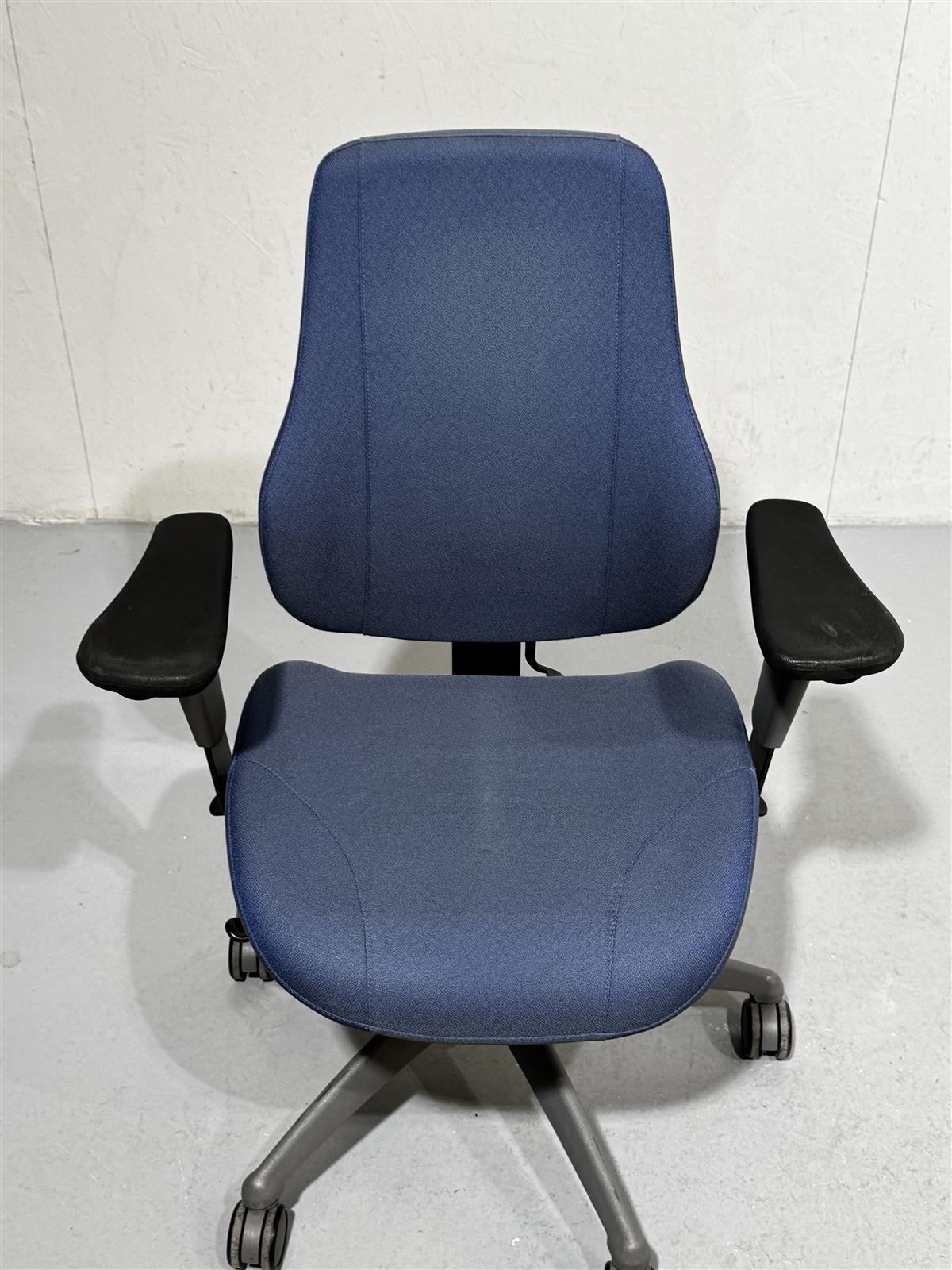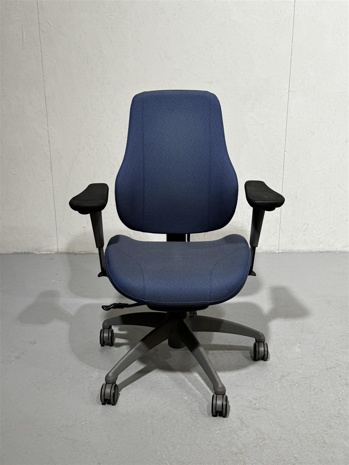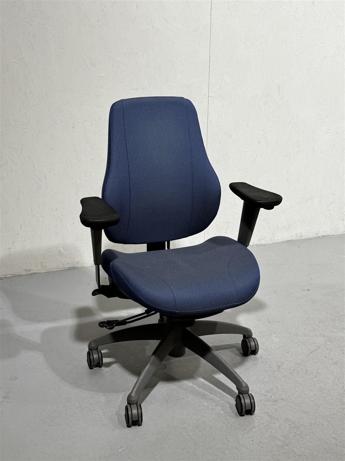 Sininen Isku Step toimistotuoli, jossa on säädettävät käsinojat ja pyörät. Tuolissa on myös korkeussäätö ja kallistustoiminto.