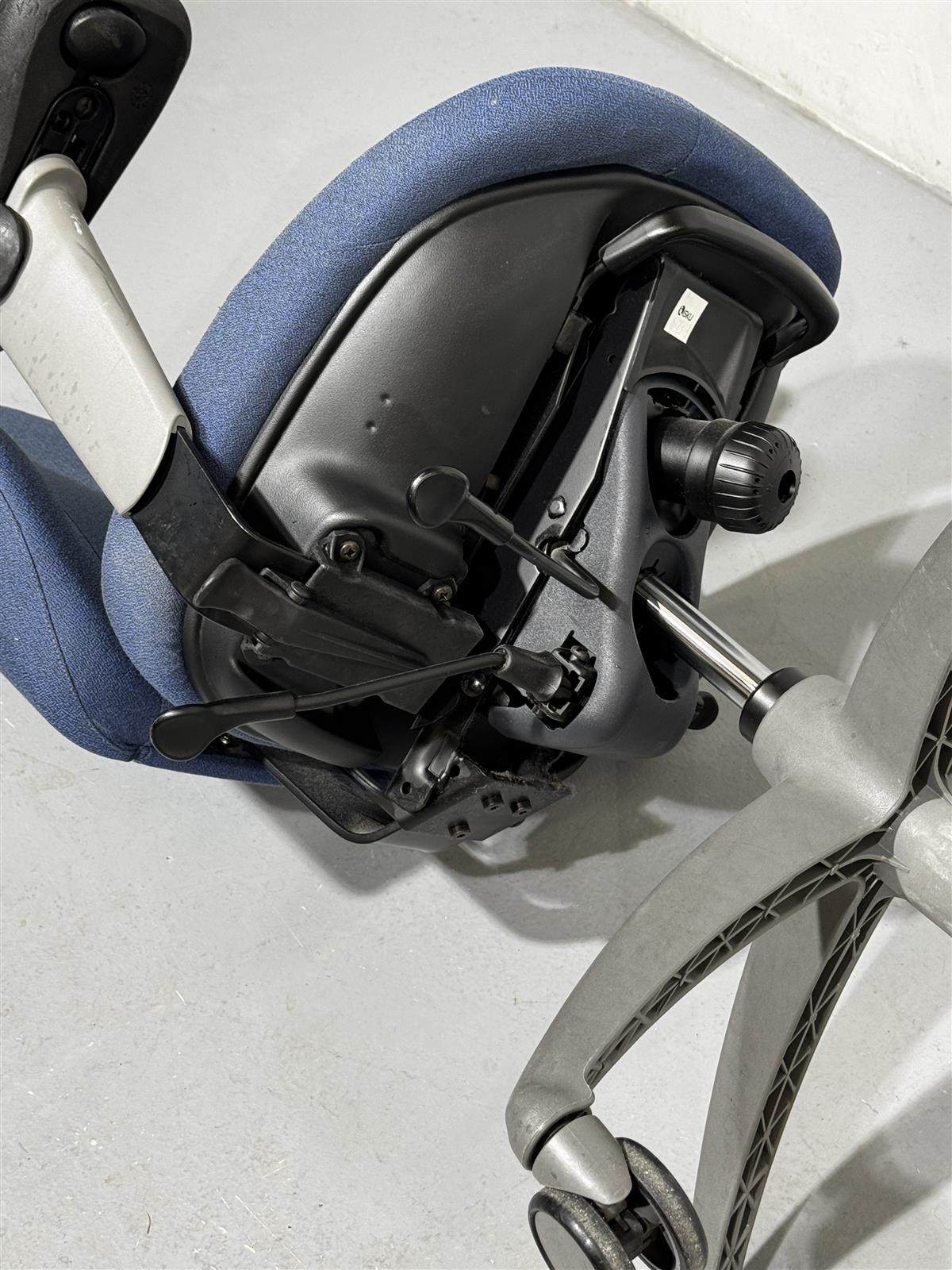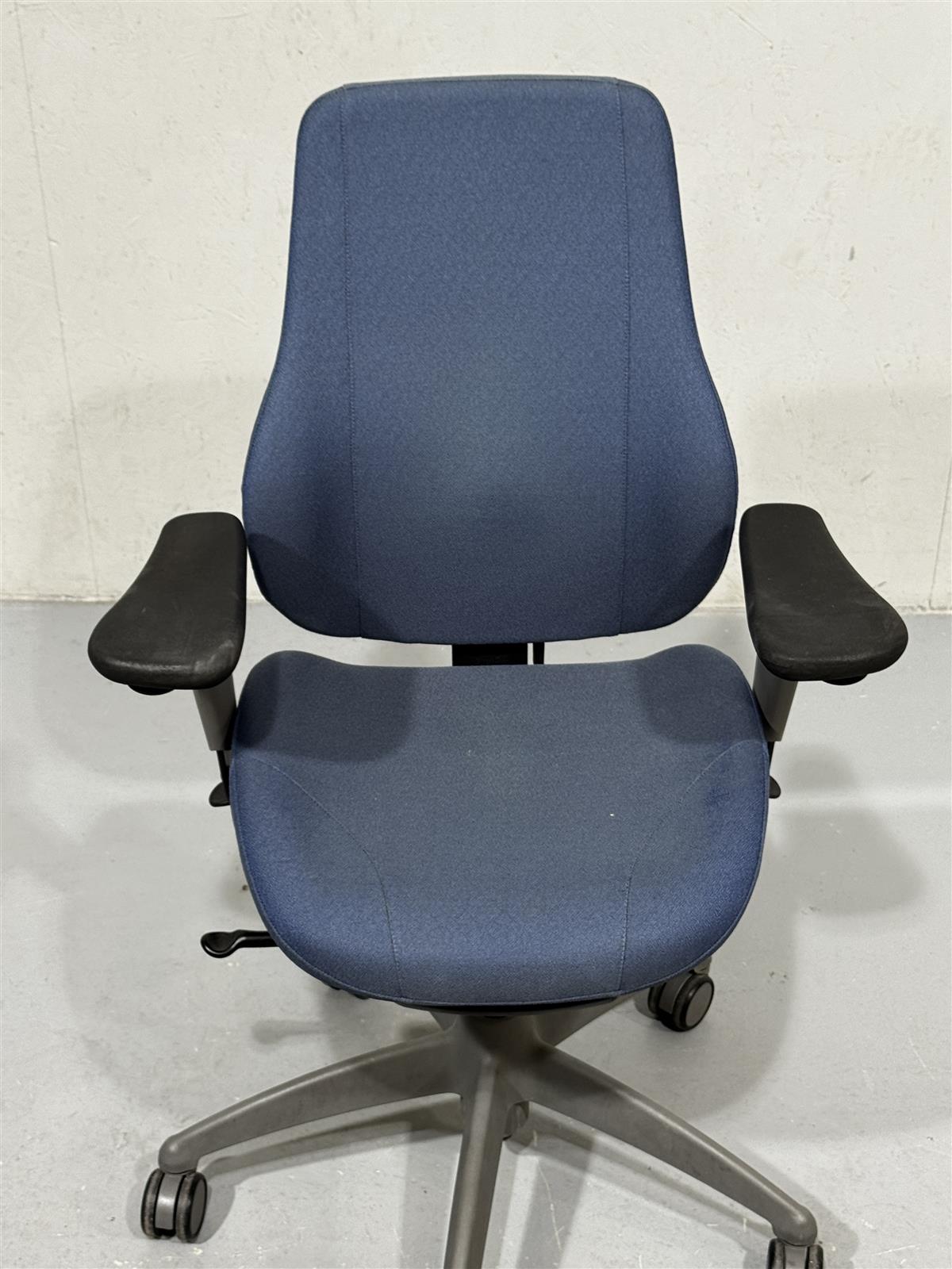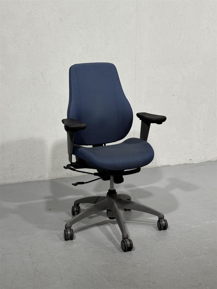 Sininen Isku Step toimistotuoli, jossa on säädettävät käsinojat ja pyörät. Tuolissa on myös korkeussäätö ja kallistustoiminto.