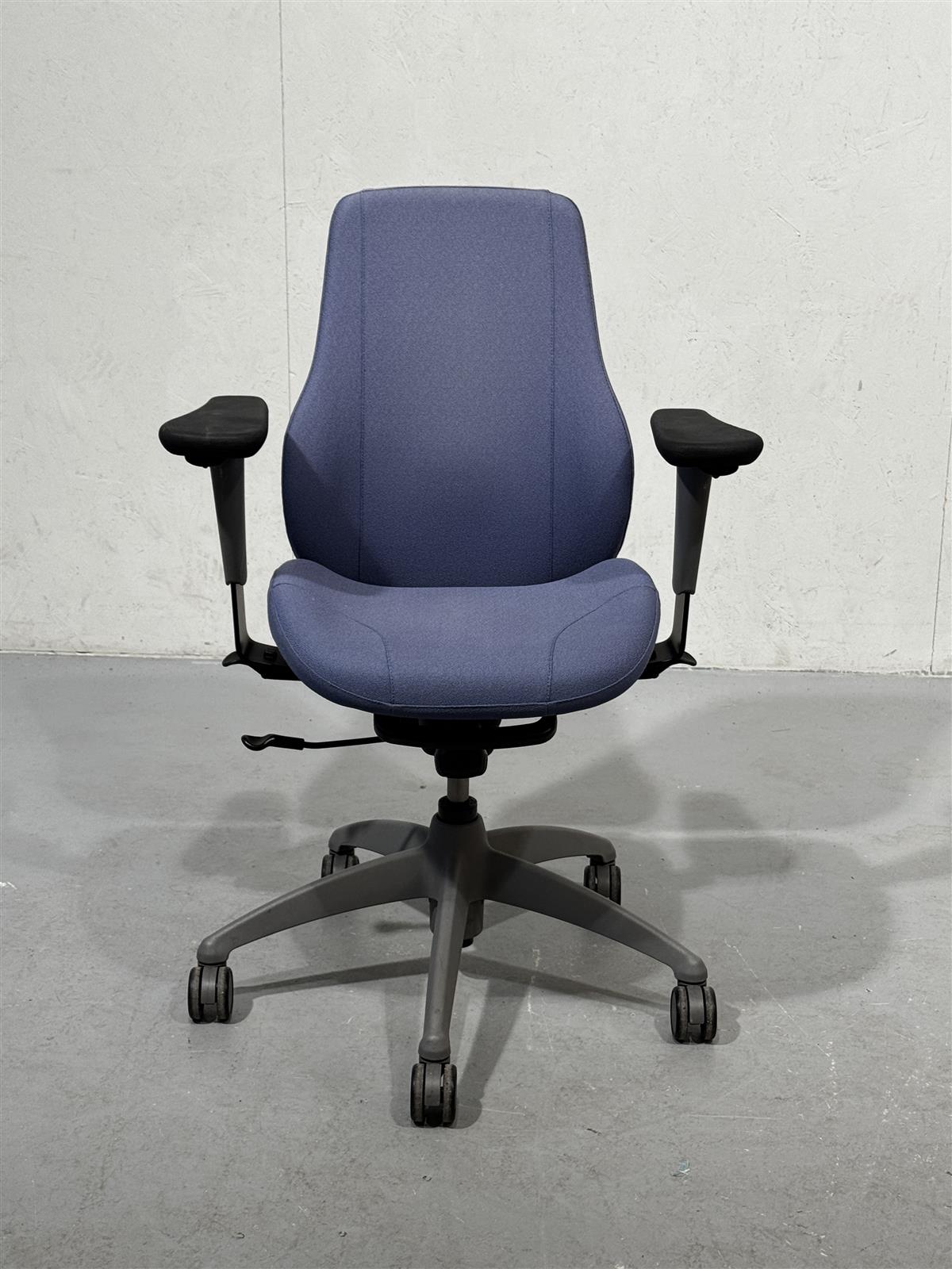 Sininen Isku Step toimistotuoli, jossa on säädettävät käsinojat, selkänoja, istuinkorkeus ja pyörät. Tuolissa on myös korkeussäätö ja kallistustoiminto.