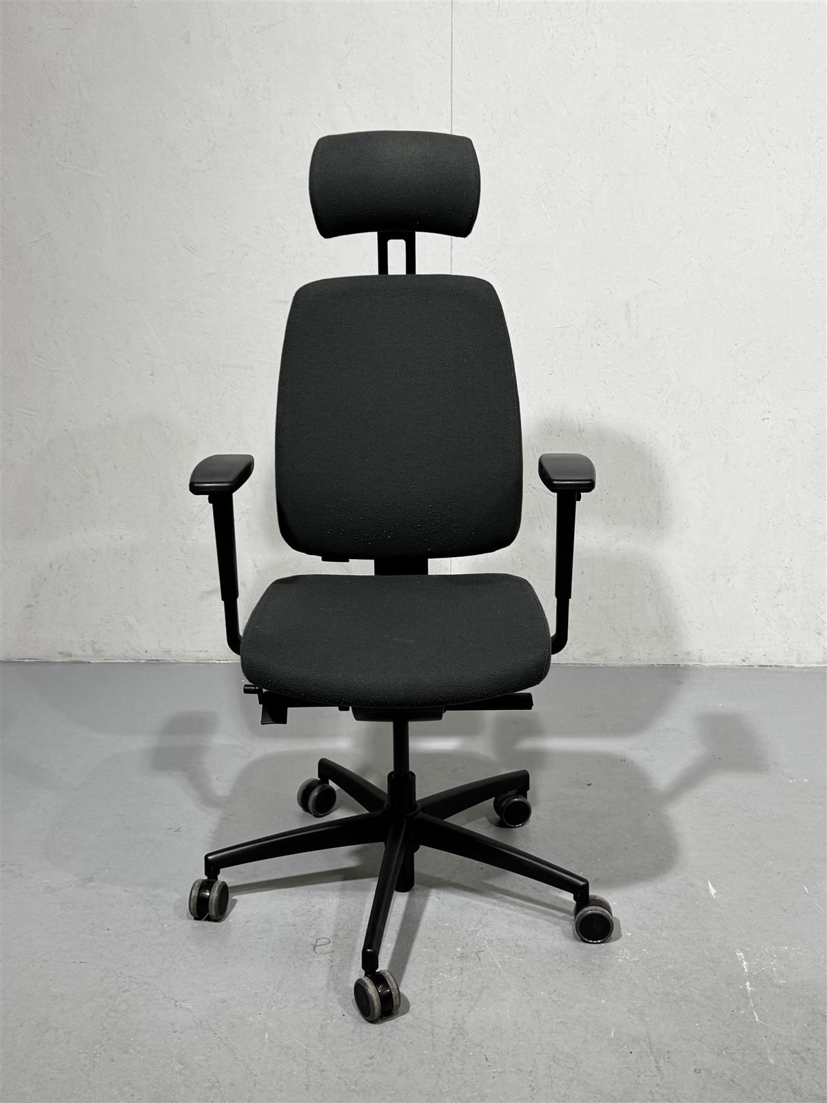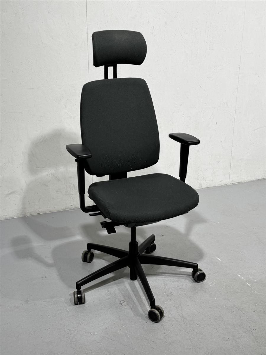 Isku Still-merkkinen musta-harmaa toimistotuoli, jossa on säädettävä niskatuki, istuin ja käsinojat. Tuolissa on pyörät ja se on korkeussäädettävä.