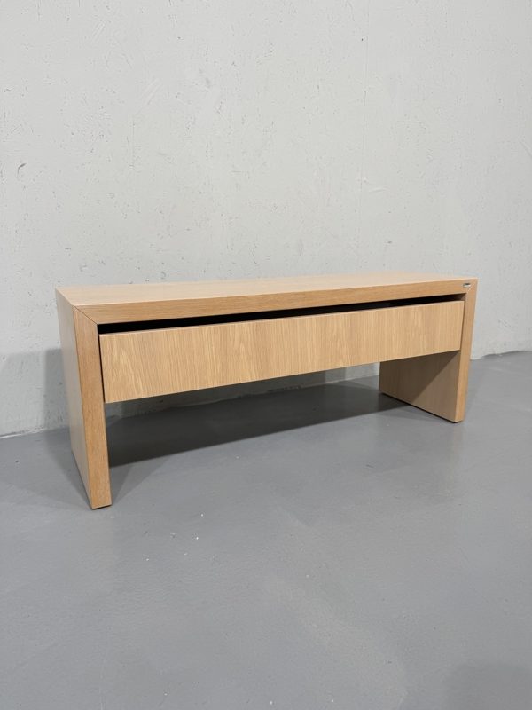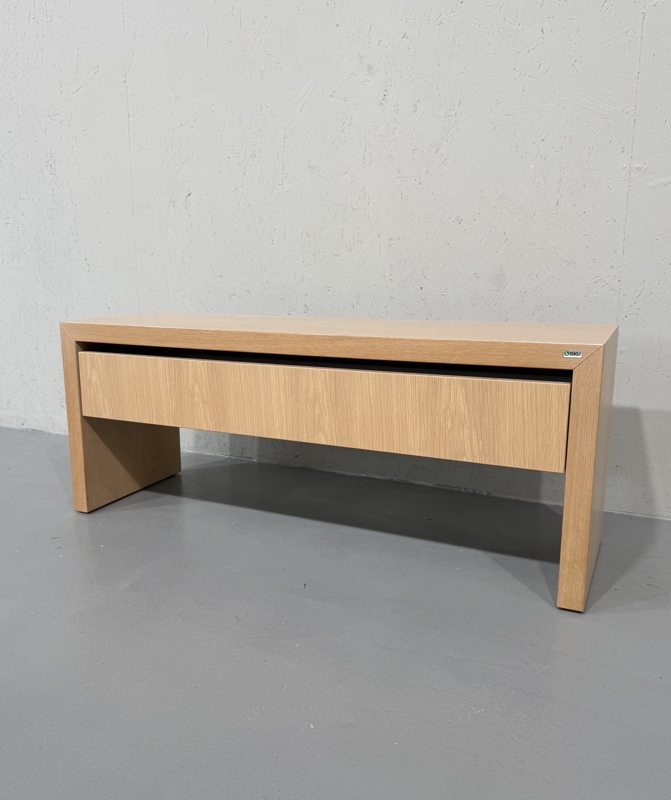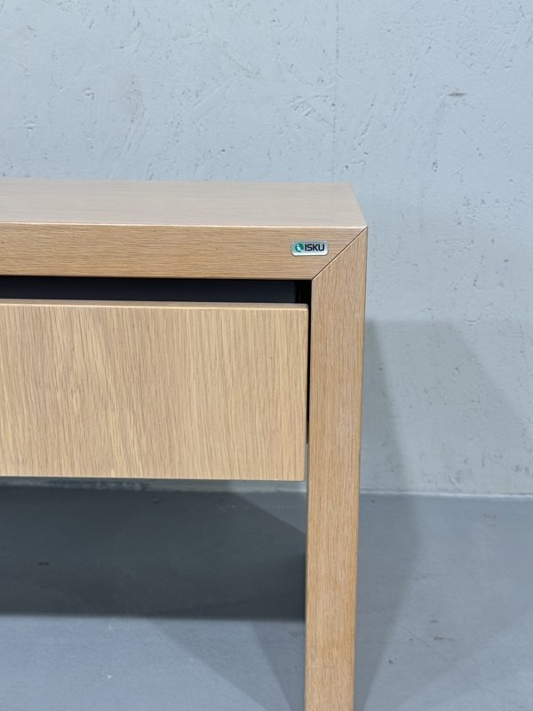Isku laakajalkainen televisiotaso vetolaatikolla. Minimalistinen tyyliltään, valkovahattu pinta ja yksinkertaiset linjat. Runko tukeva ja laadukas, Isku laatua. Vetolaatikossa hidastin.