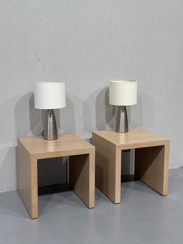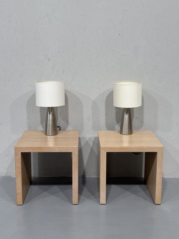 Isku laakajalkainen minimalistinen yöpöytä taso (2 kpl).  Valkovahattu pinta ja yksinkertaiset linjat. Runko tukeva ja laadukas, Isku laatua. Mukana molemmille pöydille Paulmannin pienet pöytävalaisimet valkoisella varjostimella. Valaisin toimii kosketuksella ja valotehoa 3 eri voimakkuutta. Valaisimien varjostimissa käytön kulumaa / jälkeä.