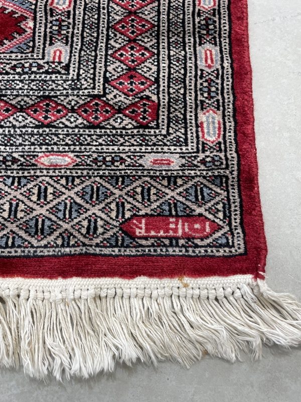 Itämainen, rohkean punainen käsin solmittu matto, jossa tekijän signeeraus alakulmassa.