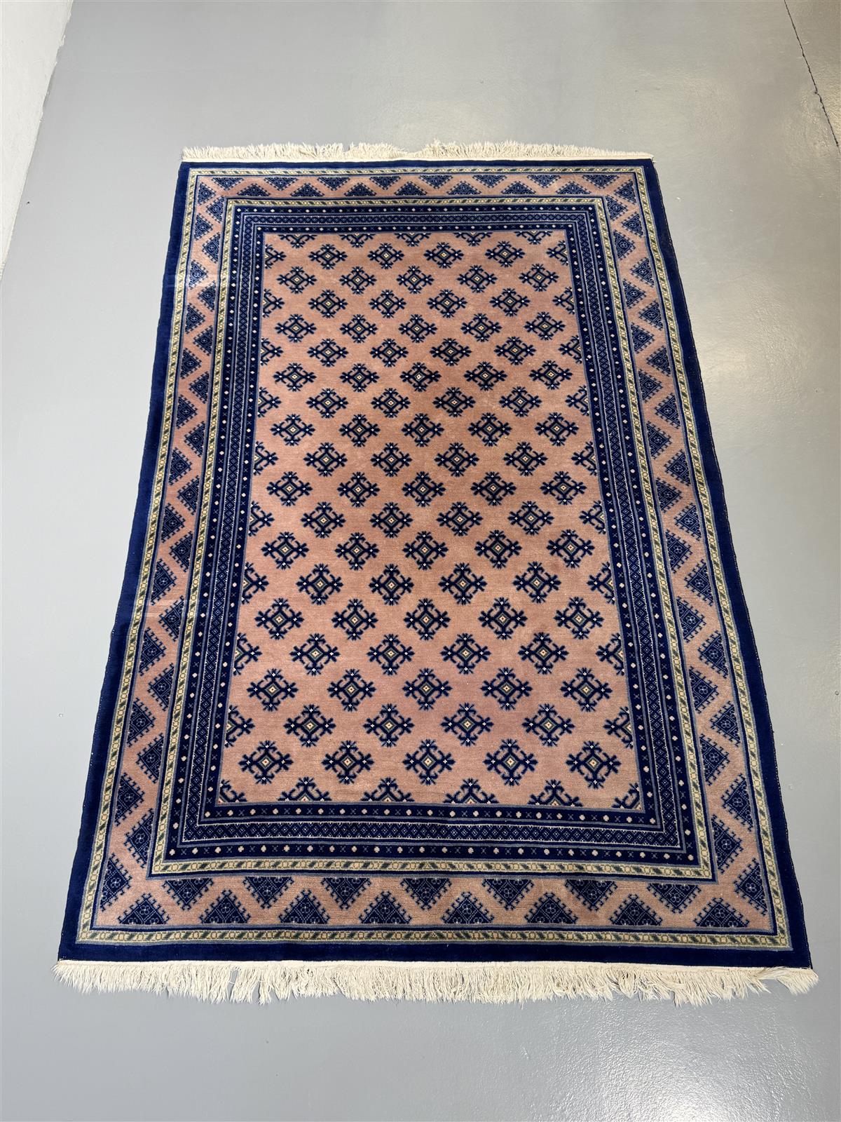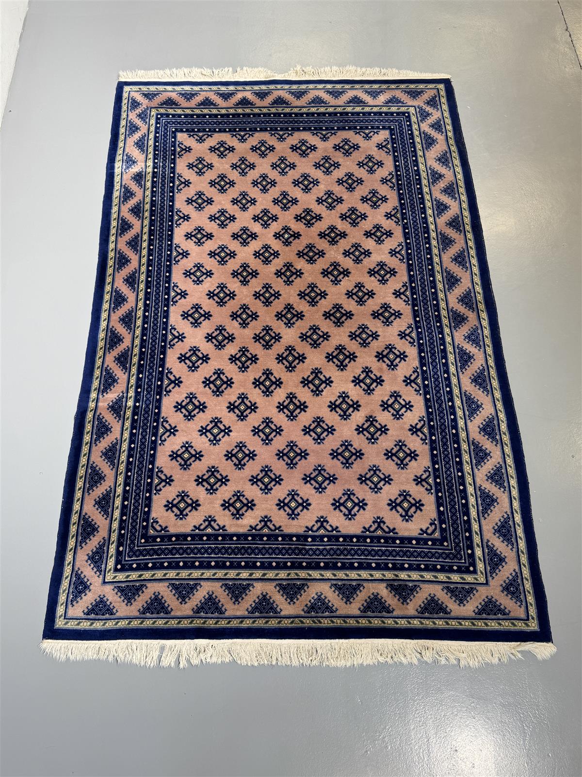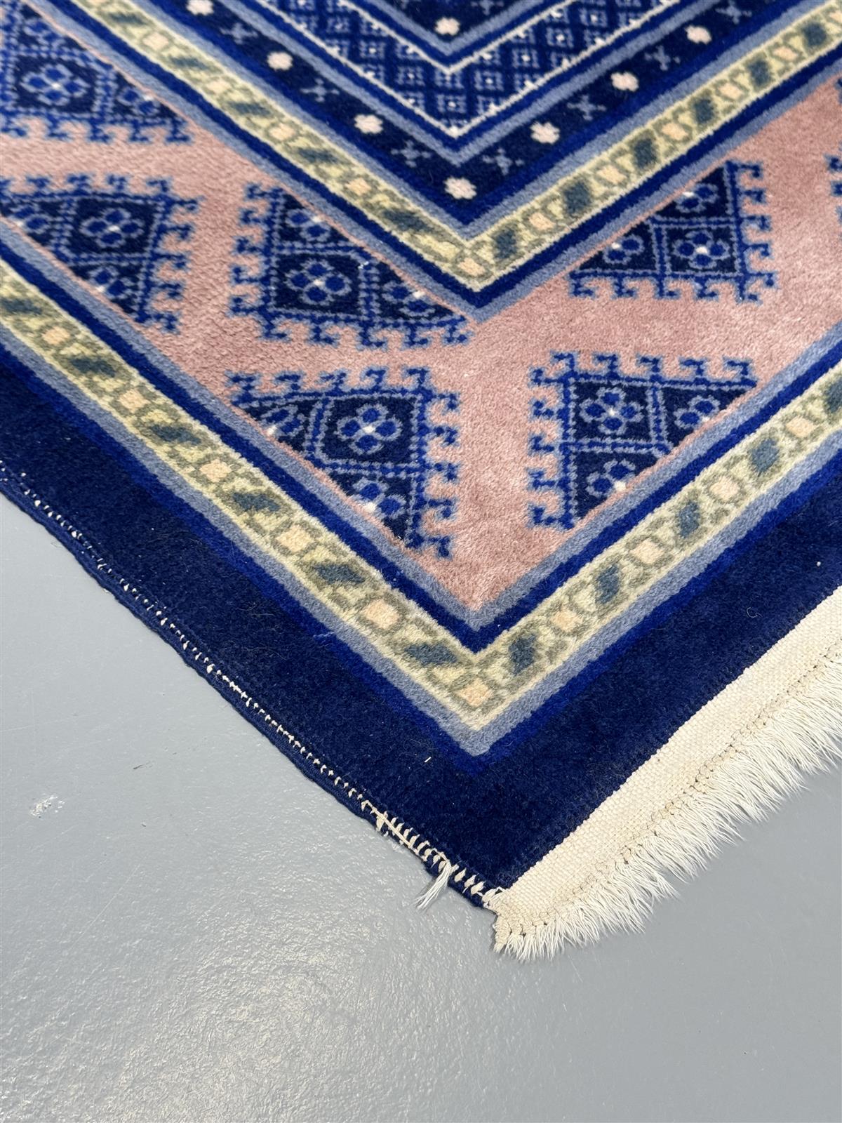 Paksupohjainen, itämainen matto kirkkaalla sinisellä pohjavärillä. Matossa kauniit geometriset kuviot, perussiisti.
