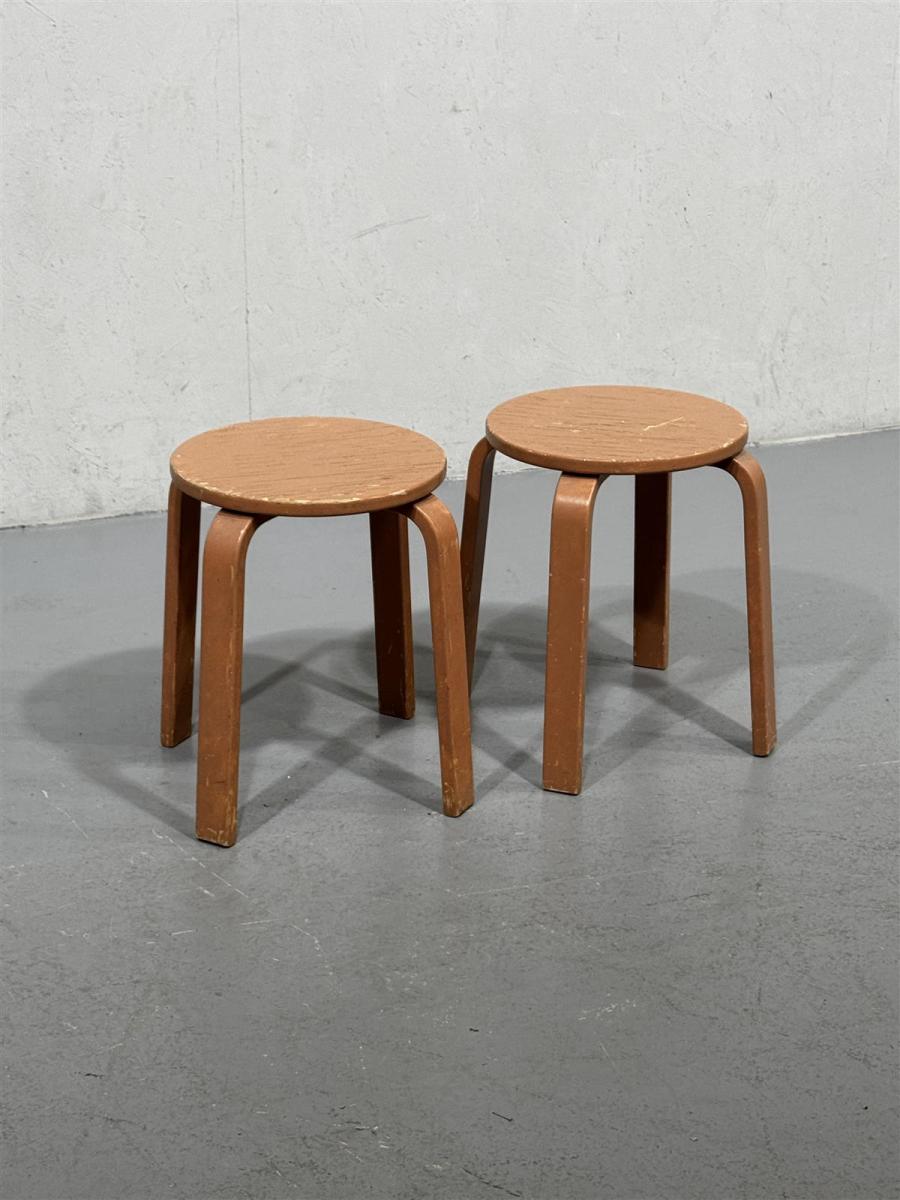 Kaksi vintage-jakkaraa, valmistettu puusta ja maalattu ruskeaksi. Jakkarat ovat yksinkertaisia ja toimivia, sopien monenlaiseen käyttöön ja tilaan. Niissä on neljä jalkaa ja pyöreä istuinosa, mikä tekee niistä helposti pinottavia ja säilytettäviä.