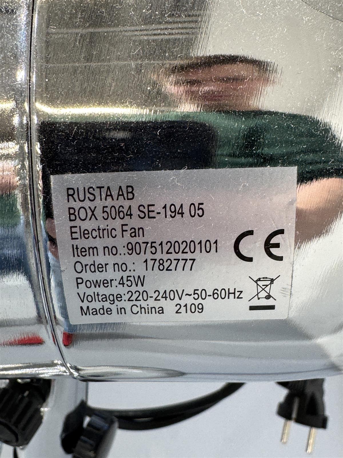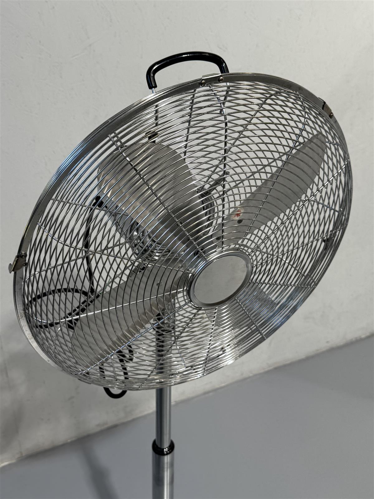 Metallinen lattiatuuletin, jossa on säädettävä korkeus ja kolme nopeusasetusta. Tuuletin on valmistettu kestävästä metallista ja siinä on pyöreä jalusta, joka takaa vakaan asennon käytön aikana. Virtajohto on kiinnitetty tukevasti laitteen runkoon.