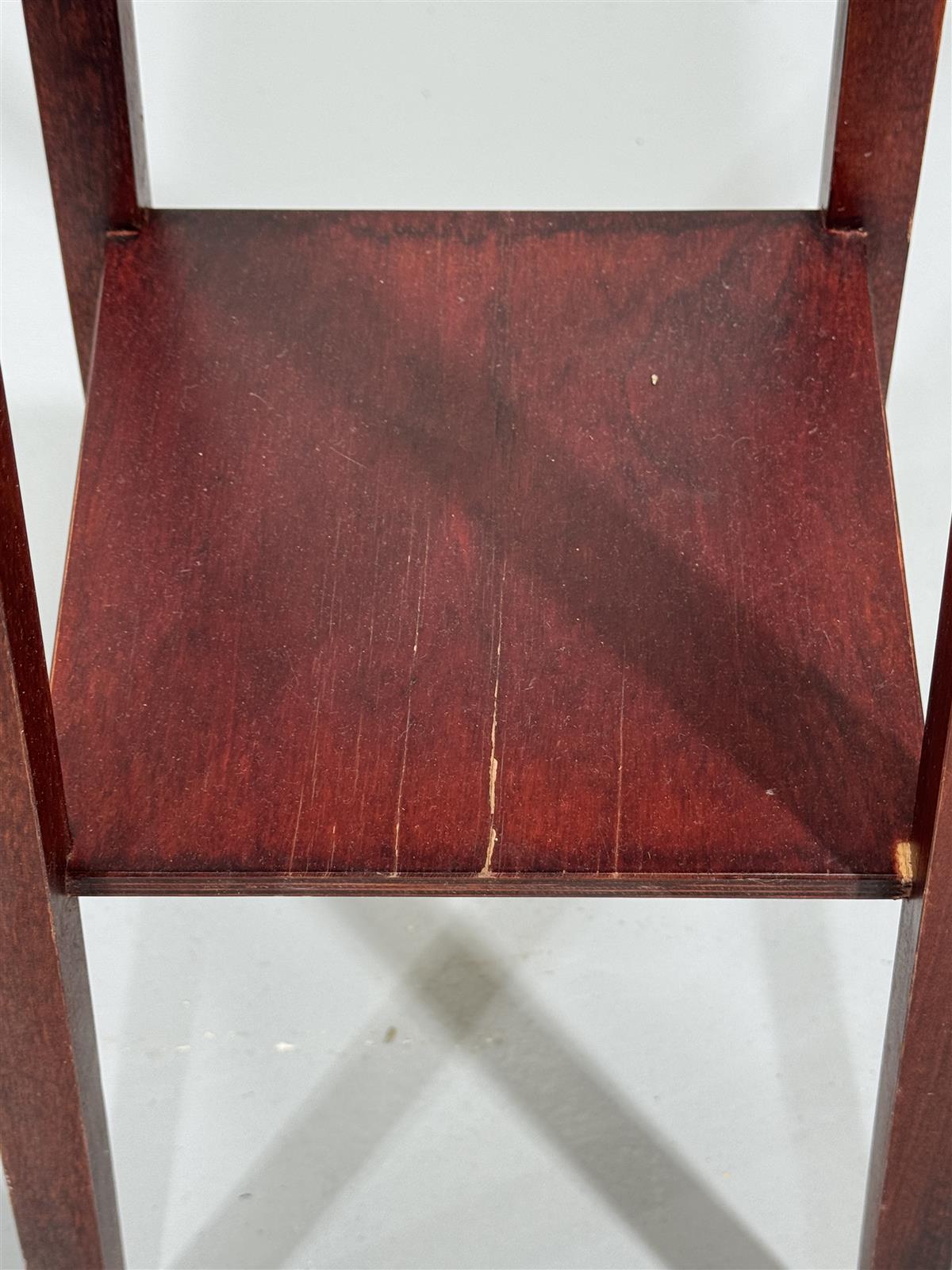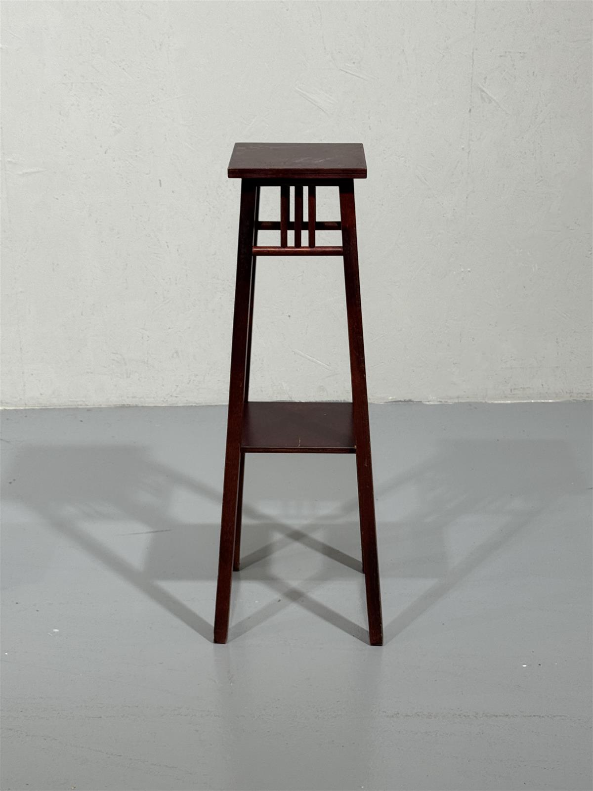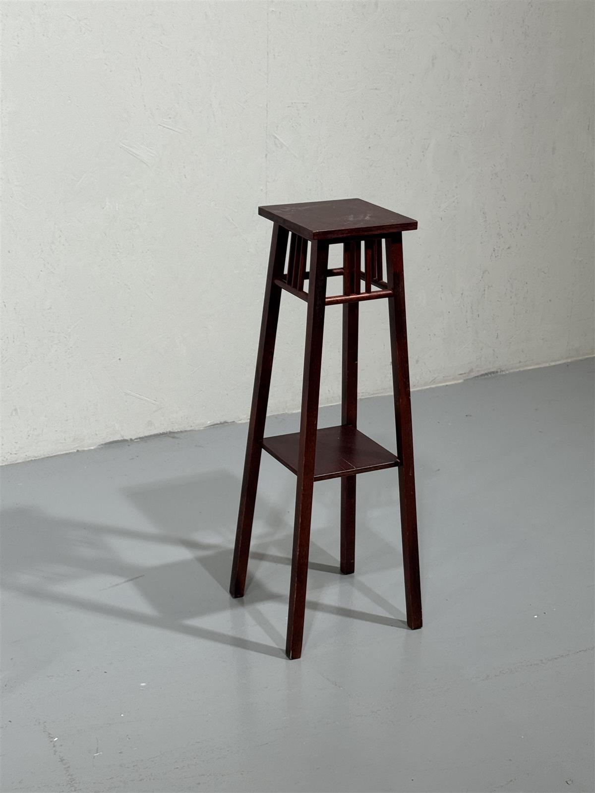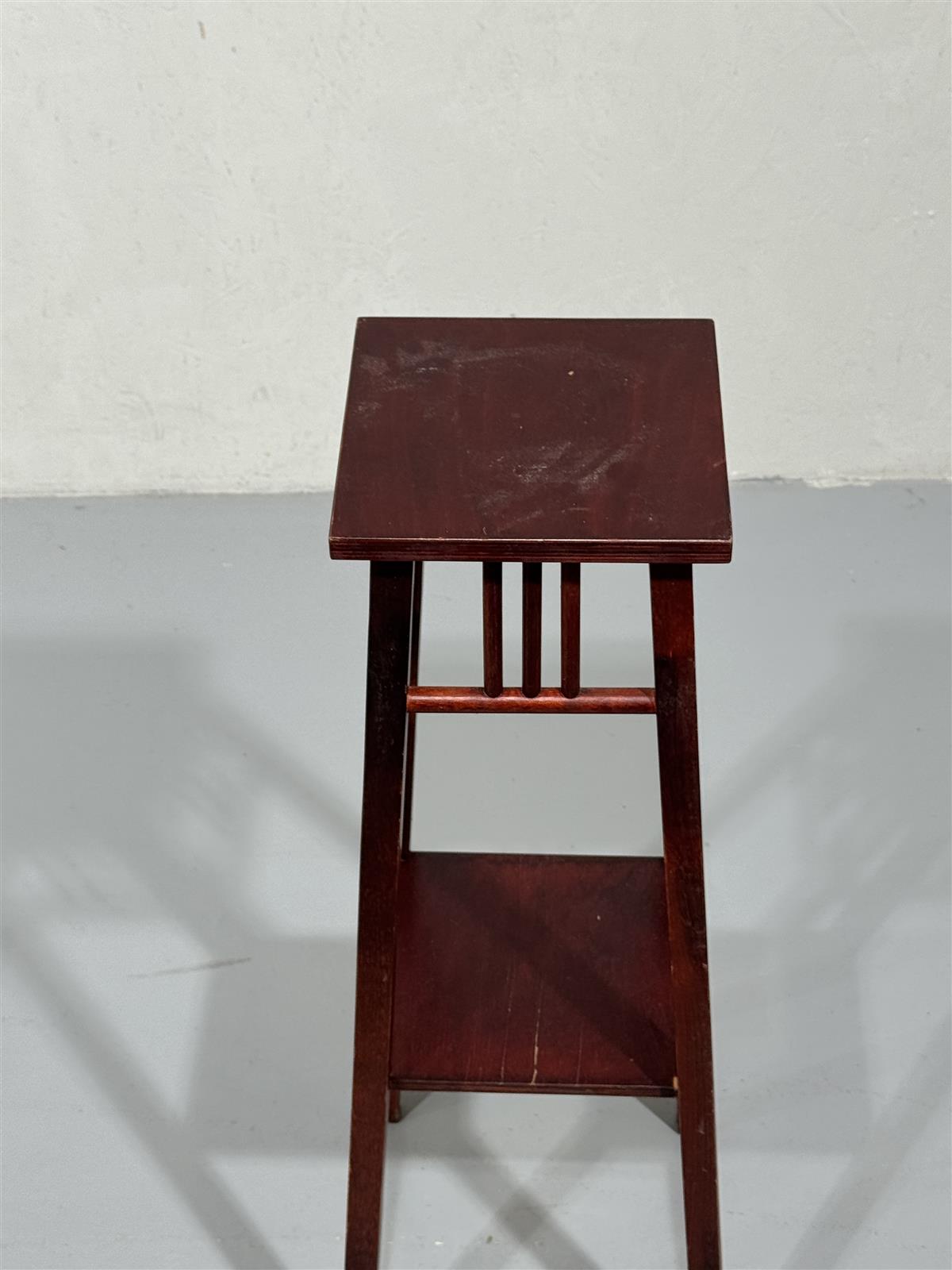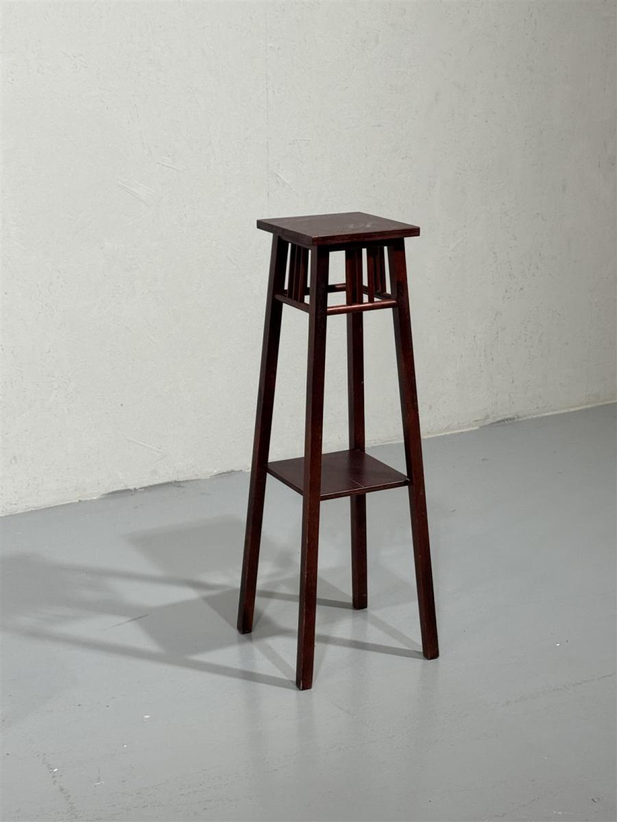 Korkea puinen jalusta, jossa on neljä suoraa jalkaa ja keskellä hylly. Tummanruskea punertava väri antaa sille klassisen ilmeen. Yläosassa on neliönmuotoinen taso, joka soveltuu koriste-esineiden esillepanoon.