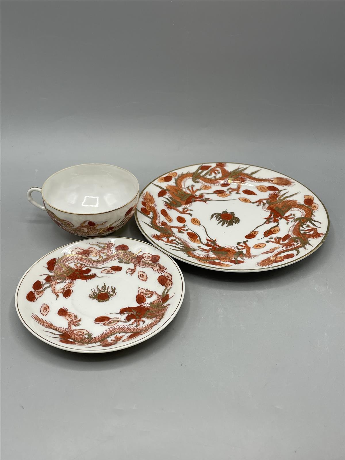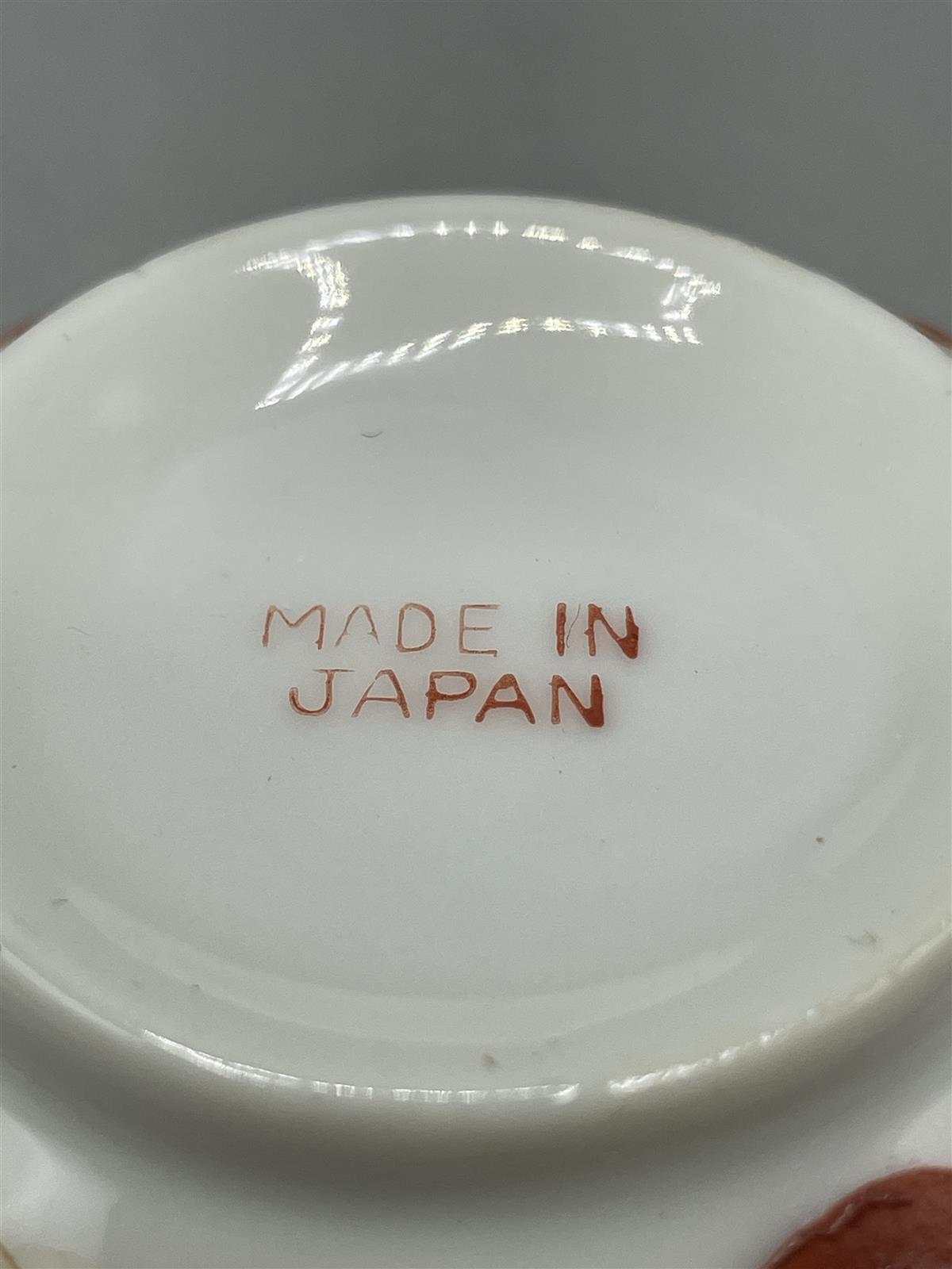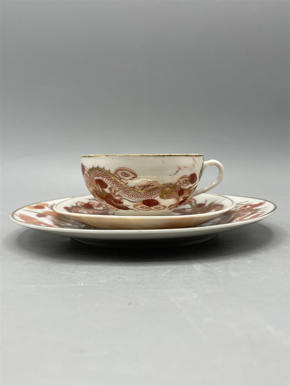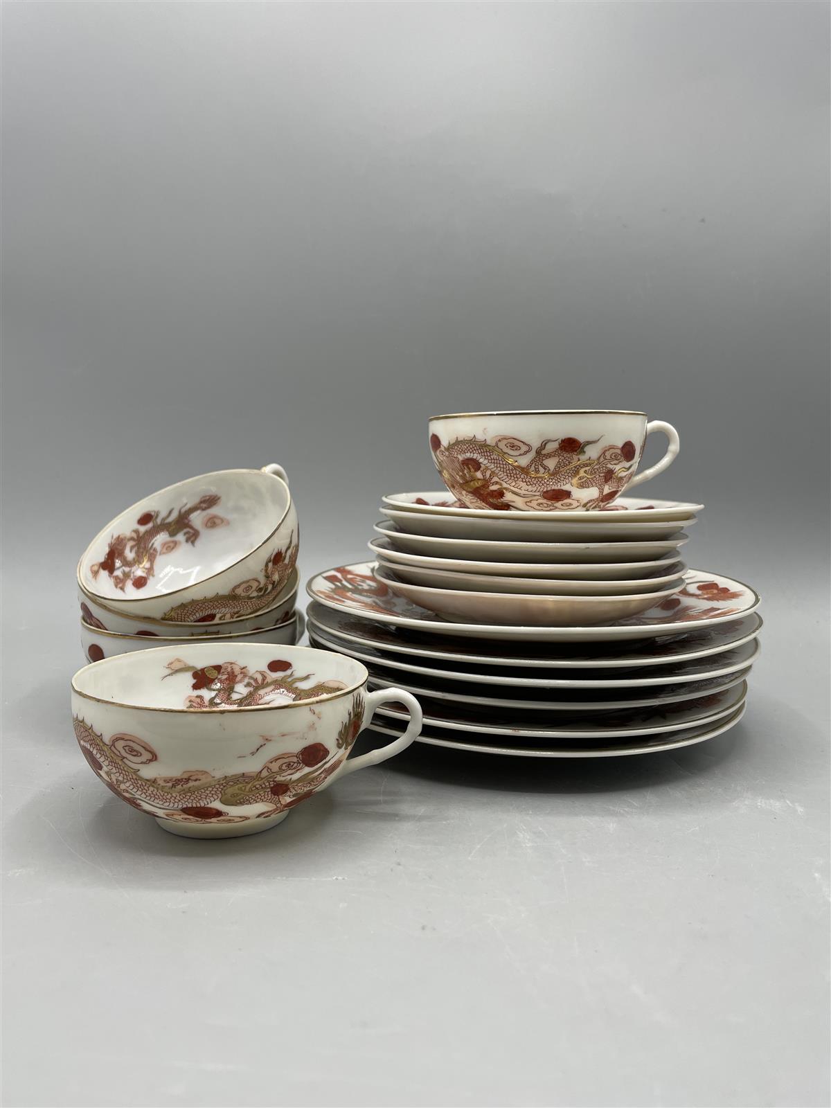 Tyylikäs japanilainen posliini teekuppisetti, jossa on käsinmaalattu kauniit lohikäärmekuvioinnit. Setti sisältää 5kpl kuppi, tassi ja pullalautanen, jotka on koristeltu yksityiskohtaisilla punaisilla ja kultaisilla kuvioilla.