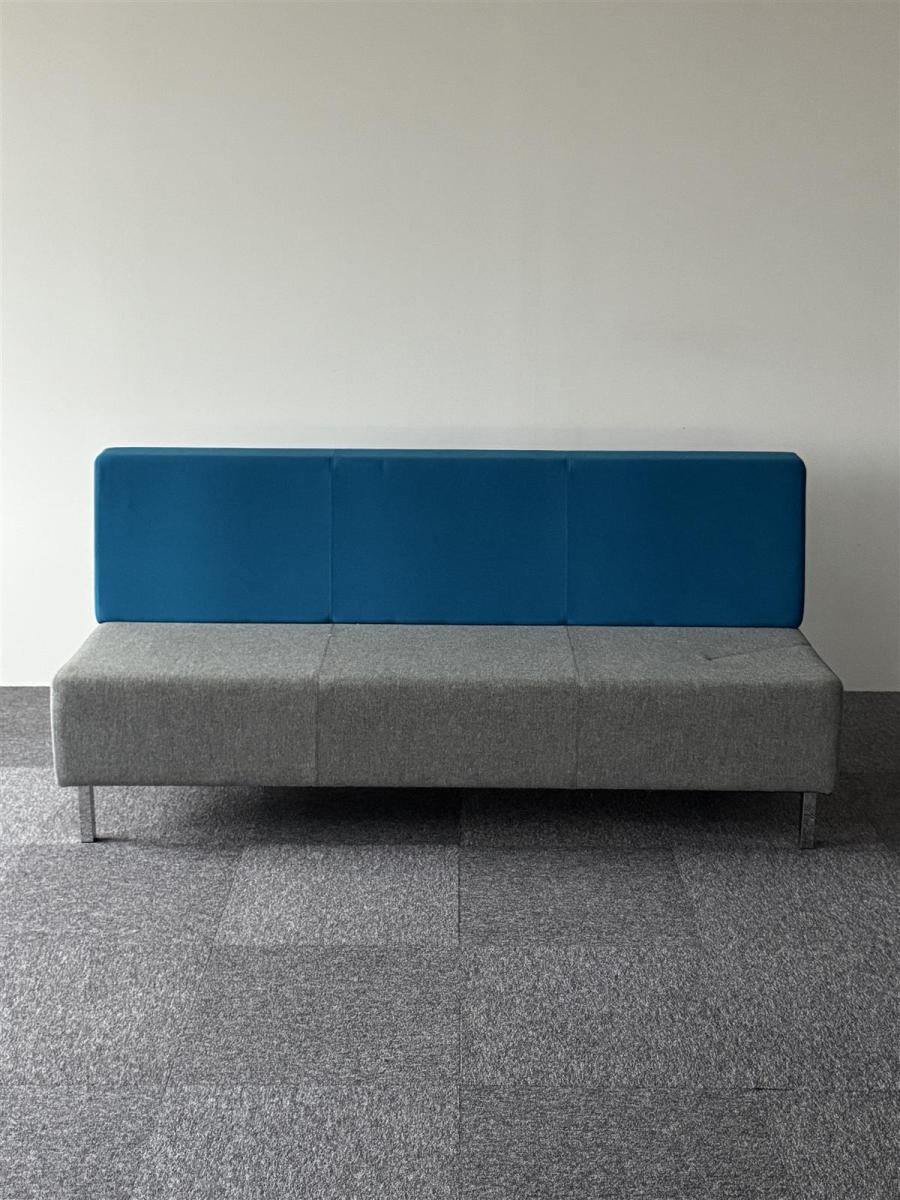Laadukas huopaverhoiltu julkisiin tiloihin sopiva sohva, jossa on sininen selkänoja ja harmaa istuinosa. Valmistaja Johanson on merkitty selkeästi etikettiin.