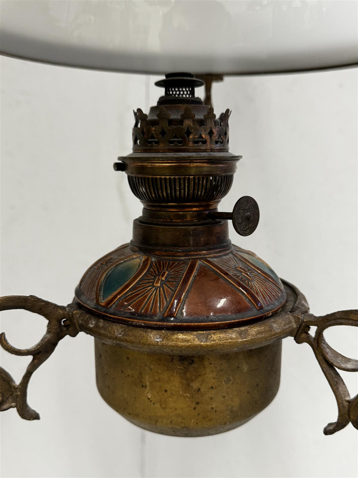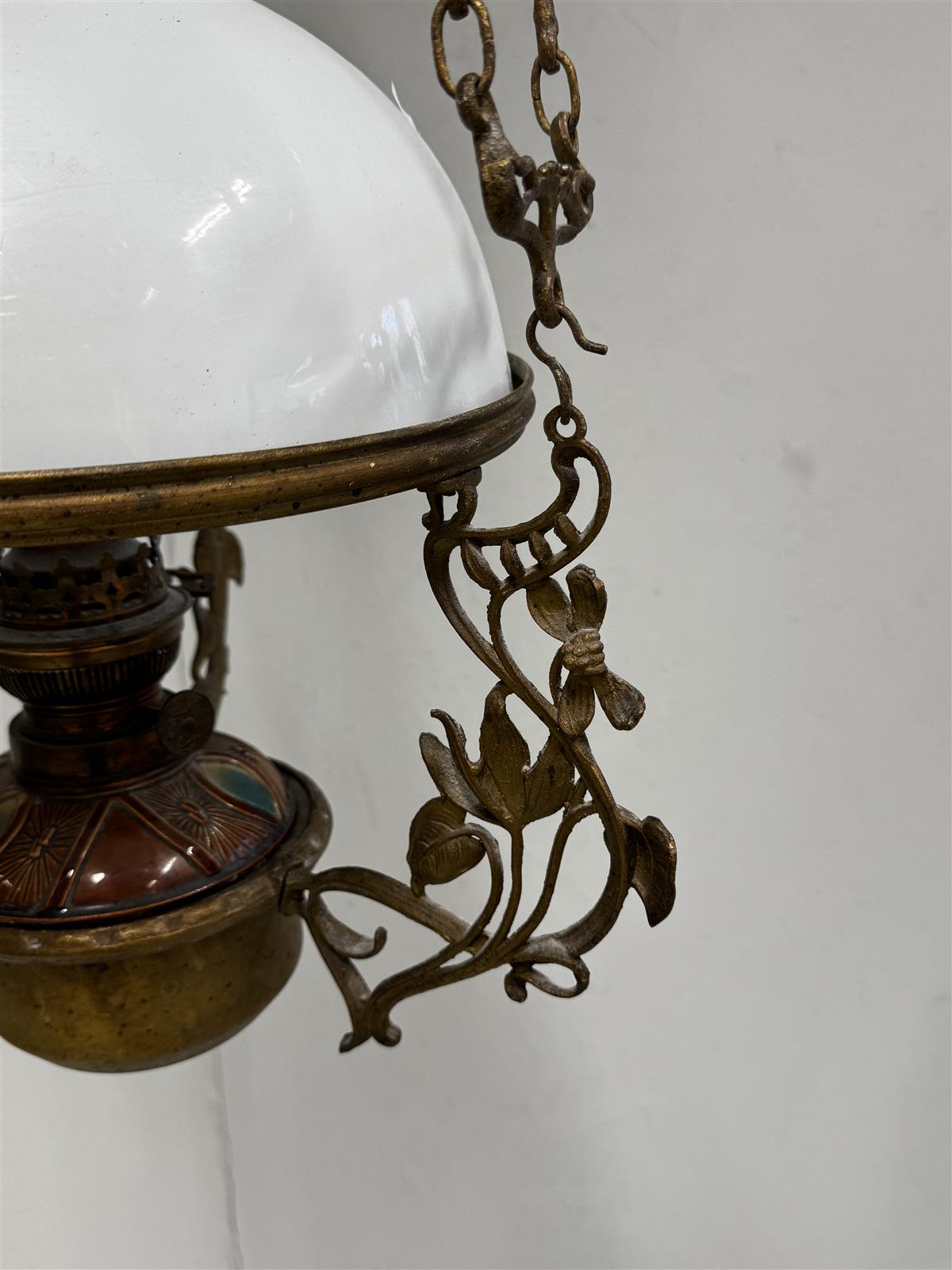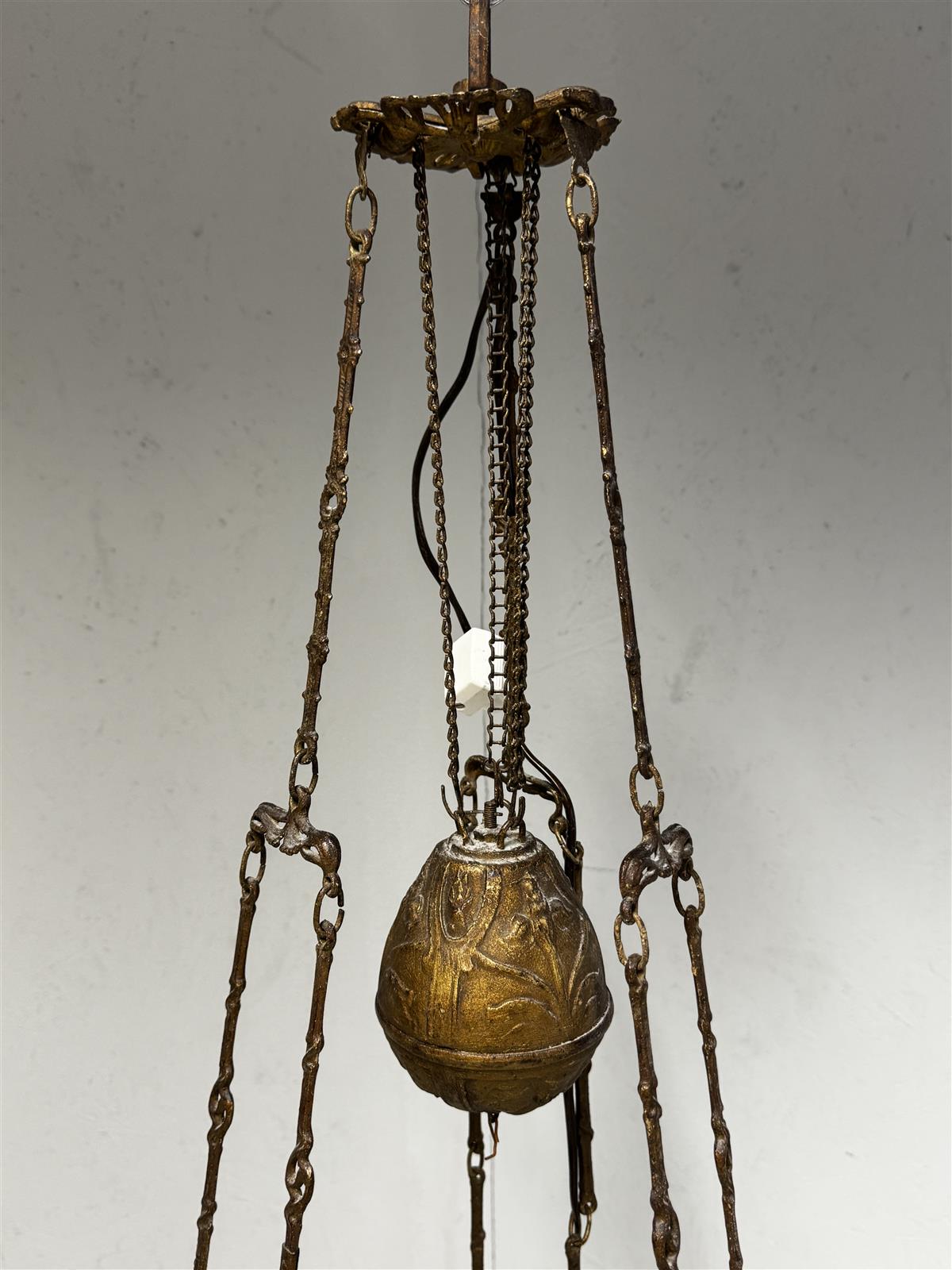 Jugend-tyylinen antiikkinen kattovalaisin, jossa on koristeelliset metalliosat ja valkoinen lasikupu. Valaisimessa on yksityiskohtaisia koristeita ja se on suunniteltu roikkumaan katosta ketjujen ja paino varassa. Mukana alkuperäinen lyhty, mutta myös sähköllä toimiva lamppu.