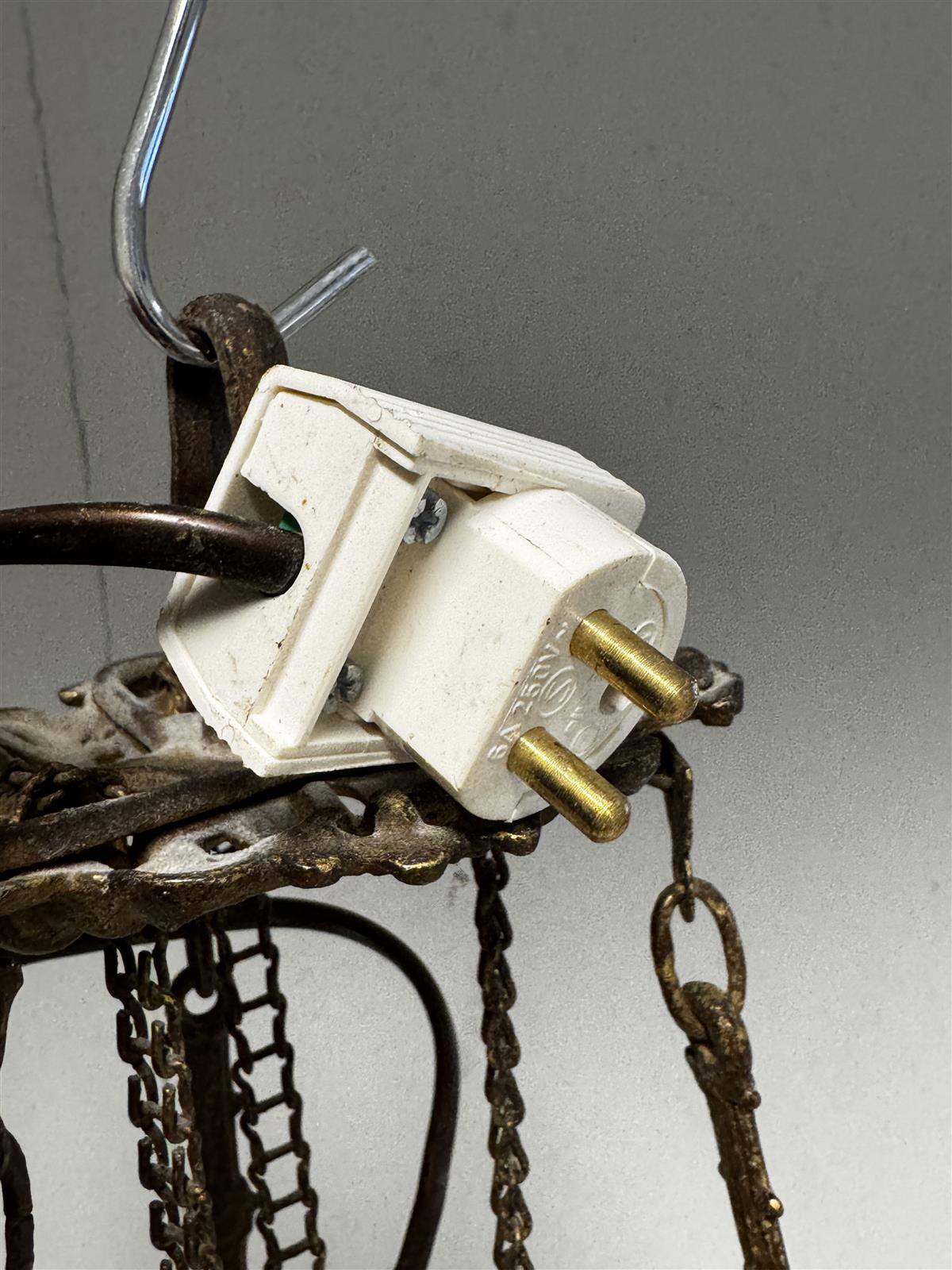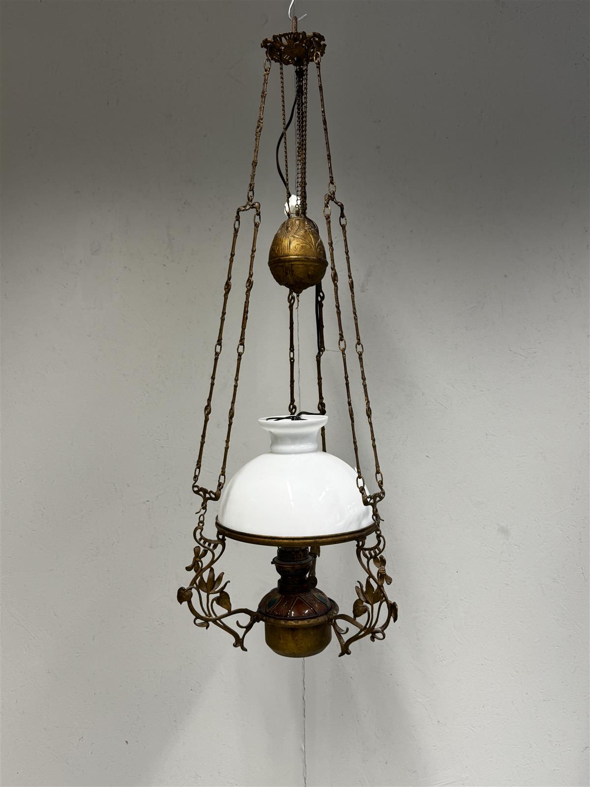 Jugend-tyylinen antiikkinen kattovalaisin, jossa on koristeelliset metalliosat ja valkoinen lasikupu. Valaisimessa on yksityiskohtaisia koristeita ja se on suunniteltu roikkumaan katosta ketjujen ja paino  varassa. Mukana alkuperäinen lyhty, mutta myös sähköllä toimiva lamppu.