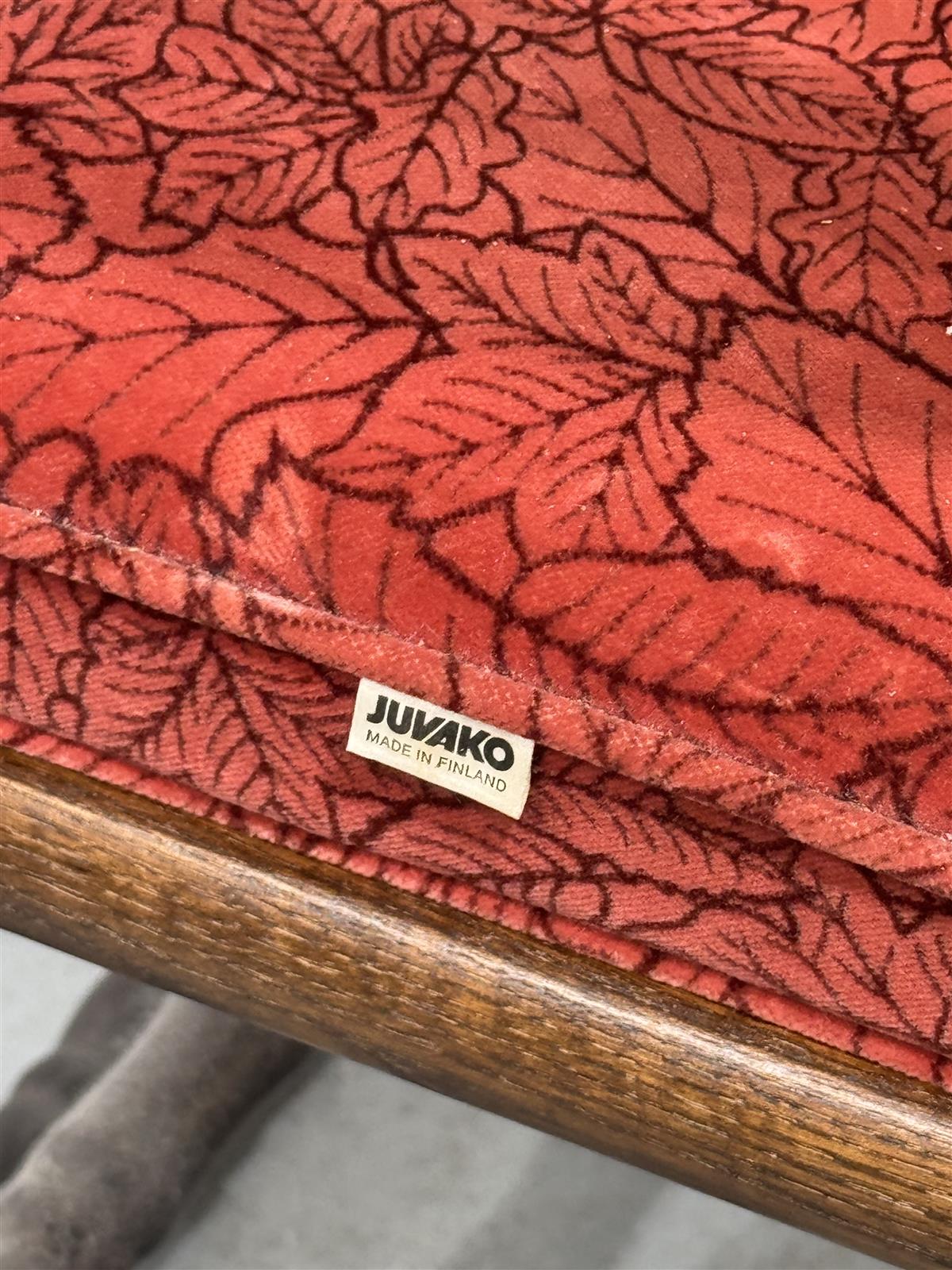 Juvako keinutuoli, jossa on punainen lehtikuvioinen verhoilu. Tuolissa on korkea selkänoja ja käsinojat, ja se on valmistettu Suomessa.