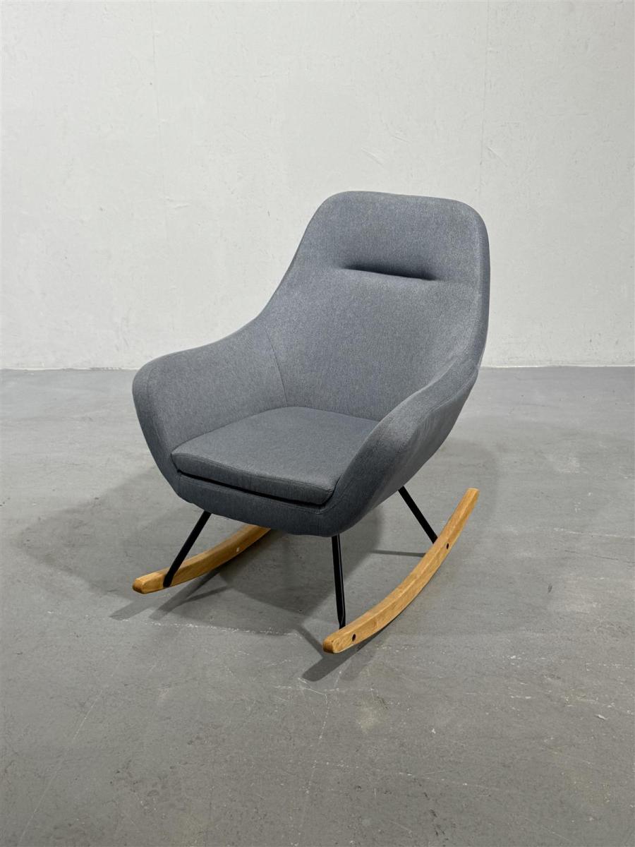 Moderni keinutuoli Jysk Nebel, jossa puiset keinuntajalat metallijaloilla nojatuolimaisen istuimen alla. Mukava keinutella porstualla tai sisällä.