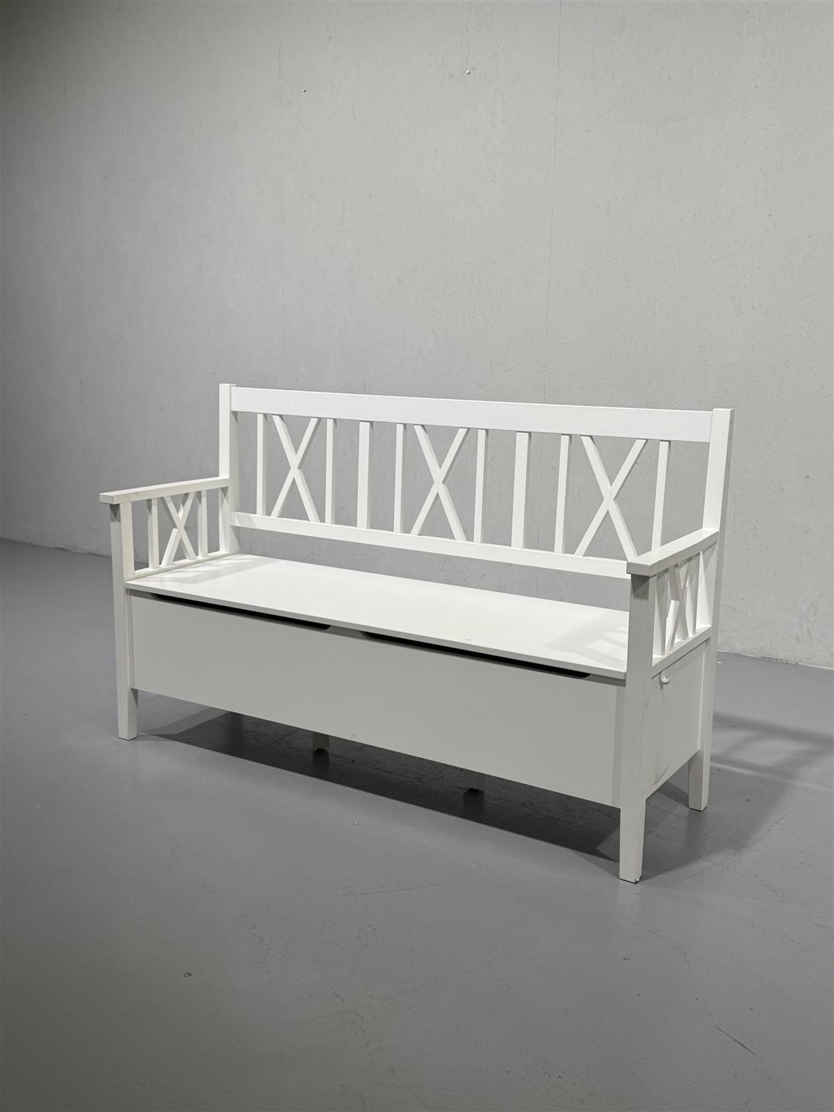 Tyylikäs puinen Jysk Nordby säilytyspenkki, jossa on valkoinen maalipinta ja ristikkäiset selkänojat. Penkissä on kätevä säilytystila istuimen alla, joka avautuu ylös nostamalla. Tämä penkki sopii hyvin eteiseen tai olohuoneeseen lisäsäilytystilaksi ja istuimeksi. Istuinkorkeus 44cm, ovh 299 euroa