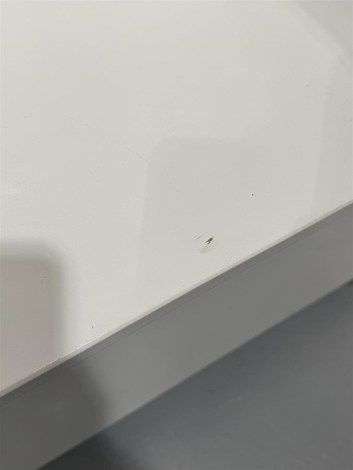 Penkissä on muutamia pieniä tummia jälkiä ja kulumia. Maalipinta on pääosin hyvässä kunnossa, mutta joitakin pieniä kolhuja on havaittavissa. Säilytystilan saranat toimivat moitteettomasti.