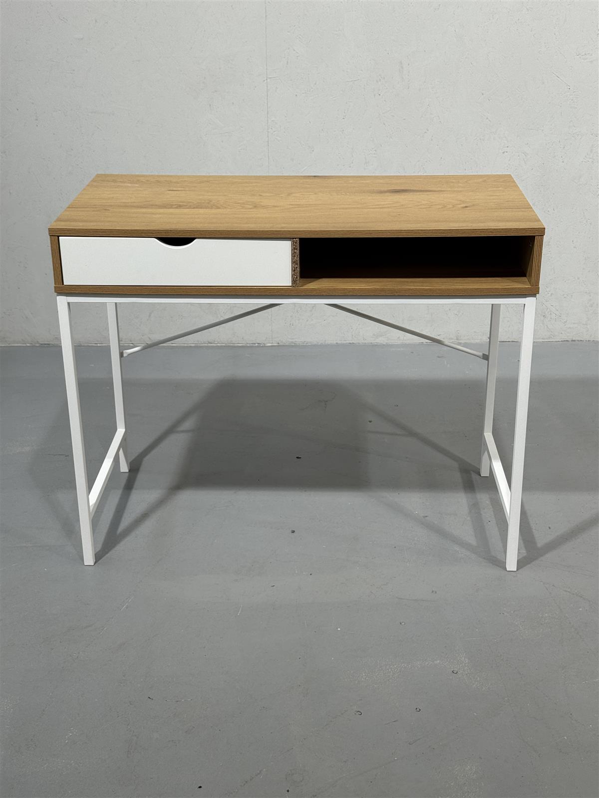 Moderni Jysk Trappedal kirjoituspöytä, jossa on yksinkertainen ja tyylikäs muotoilu. Pöydässä on yksi valkoinen laatikko ja avoin hylly, jotka tarjoavat käytännöllistä säilytystilaa. Valkoiset metallijalat tukevat pöytää ja antavat sille kevyen ilmeen. Pöytälevy on valmistettu lastulevystä, joka on päällystetty puunvärisellä viilulla. Erittäin siistikuntoinen ja valmiiksi kasattu.