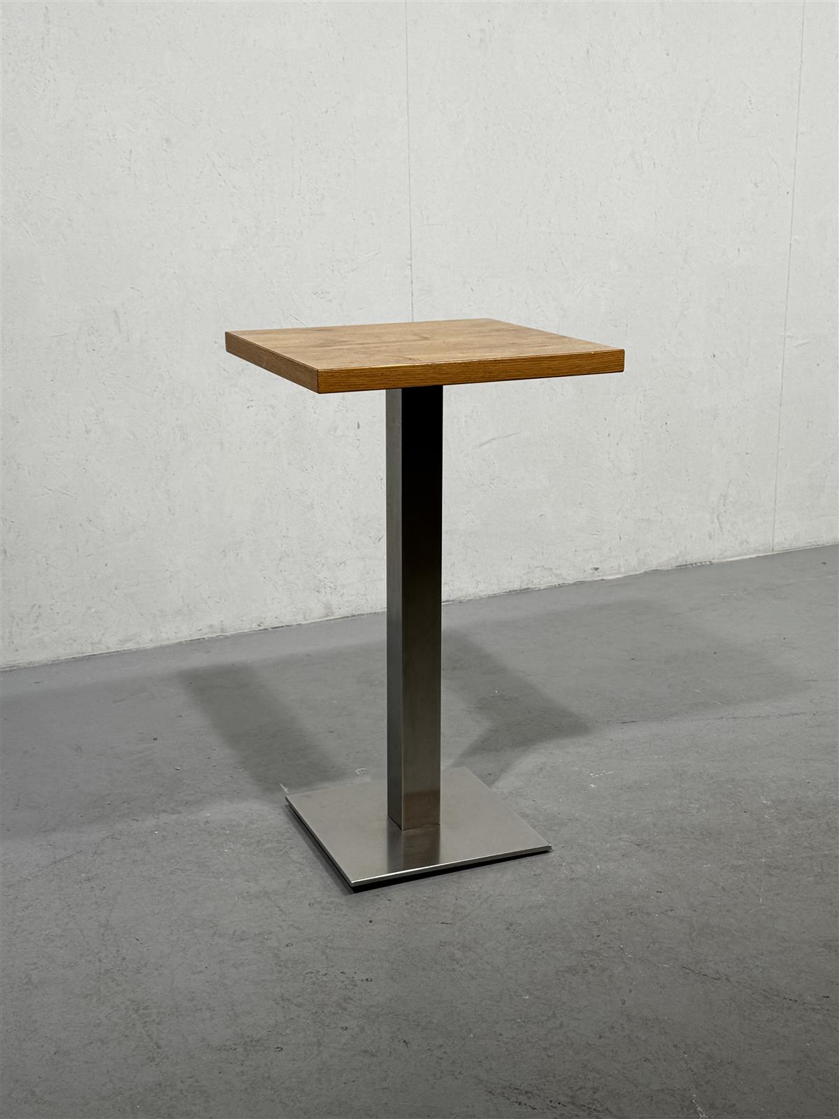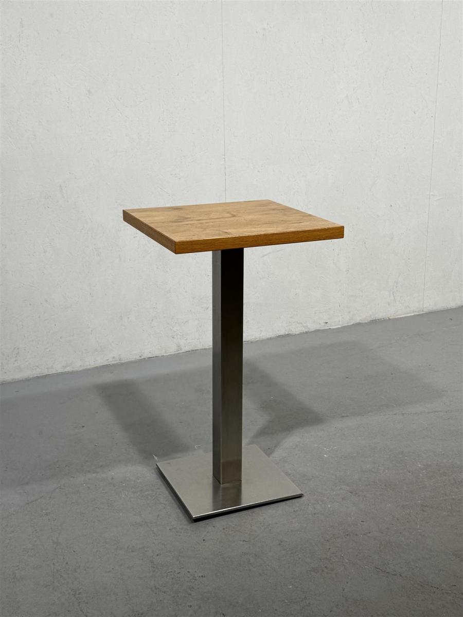 Neliönmuotoinen kahvilapöytä, jossa on pun värinen laminoitu, helppohoitoinen pöytälevy ja metallinen tukeva jalka, jonka alla säätöruuvit. Pöydän koko on 55×55 cm ja korkeus 95 cm.
