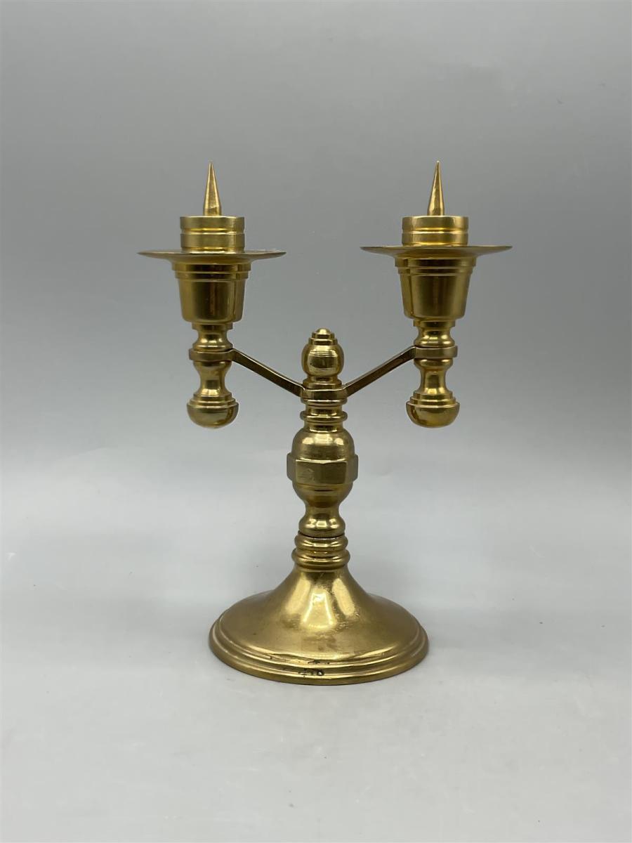 Kaksihaarainen kynttilänjalka, joka on valmistettu kiiltävästä messingistä.