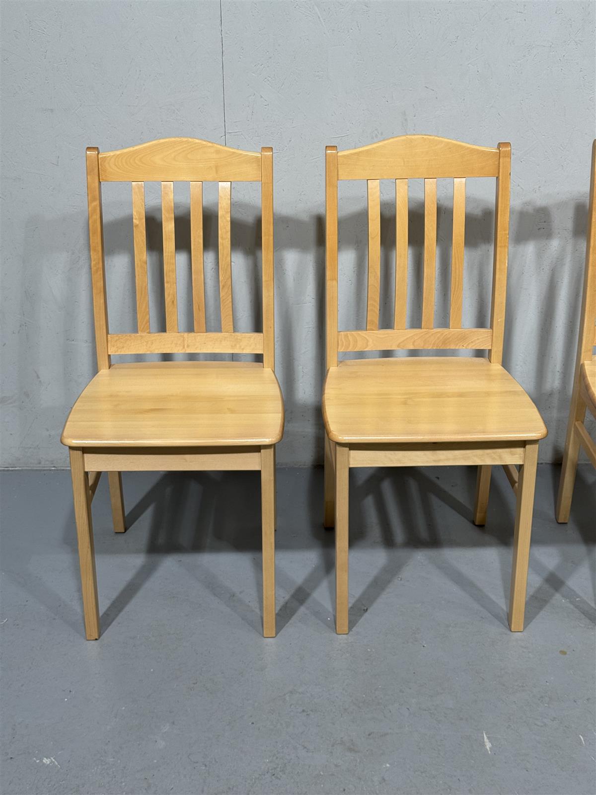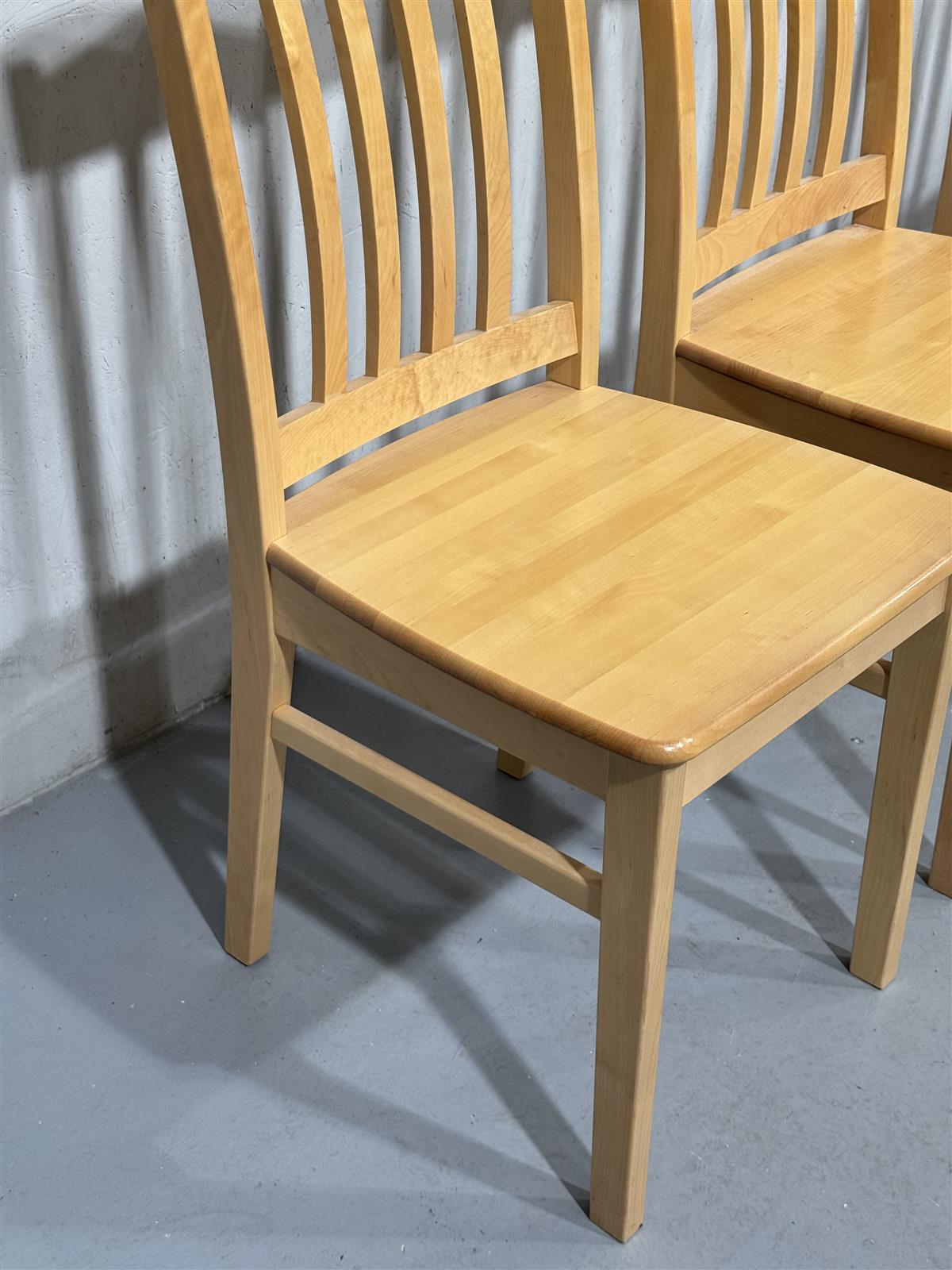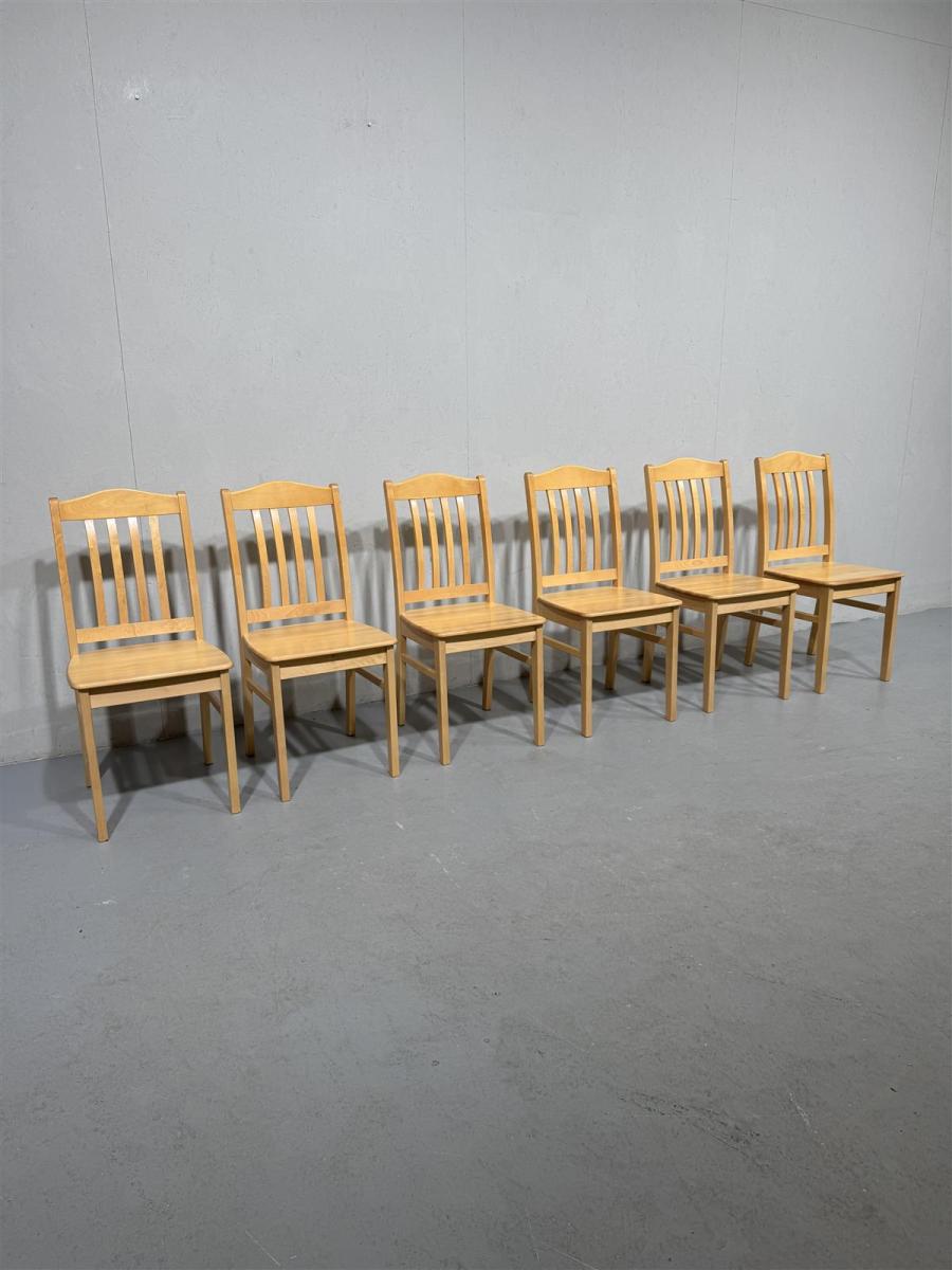 Kuusi tuolia, joissa on pystysuorat selkänojan pinnat ja vaalea puupinta. Valmistaja on Kaluste-Simola, ja tuolit on valmistettu vuonna 2005.