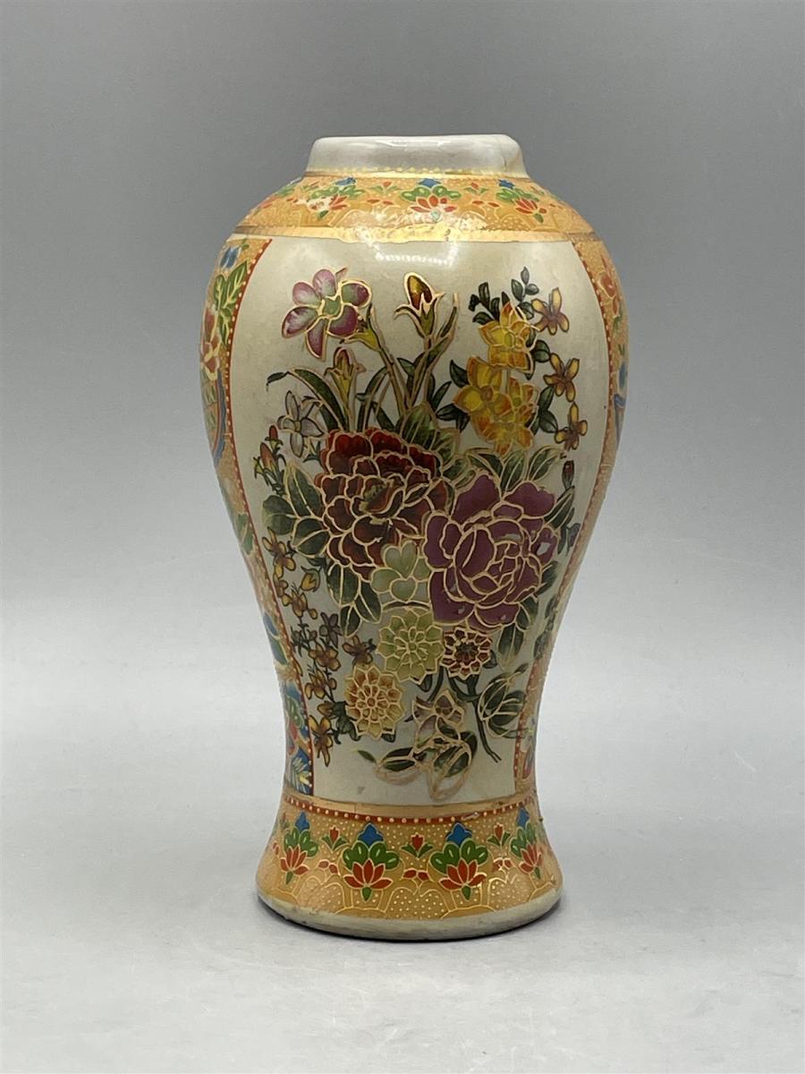 Käsinmaalattu Vaasi, jossa on monivärinen kukkakuviointi. Koristeelliset yksityiskohdat ja kultaiset reunukset korostavat sen ulkonäköä.