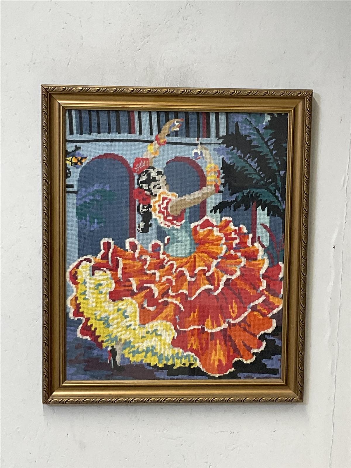 Värikäs flamencoaiheinen ristipistotyö, jossa tanssija esittää perinteistä espanjalaista tanssia. Kehystetty kultaisella kehyksellä, joka korostaa teoksen eloisia värejä.