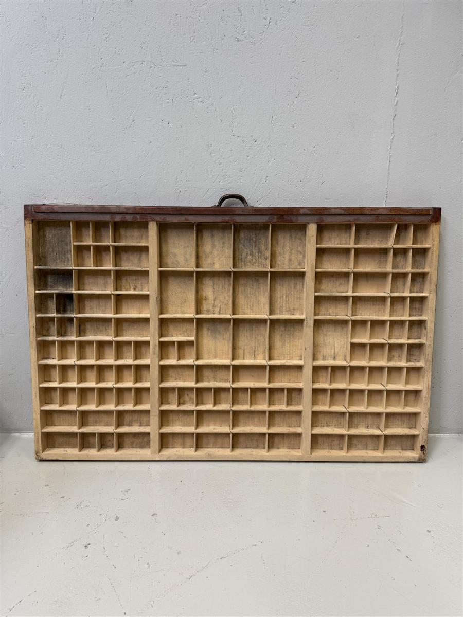 Vanhasta Kirjapainon kastin vetolaatikko, josta saat pienellä työllä vintage tyylin seinälokerikon. Sopii esimerkiksi koristeille. Tummentumaa yläkulman lokeroissa musteesta.