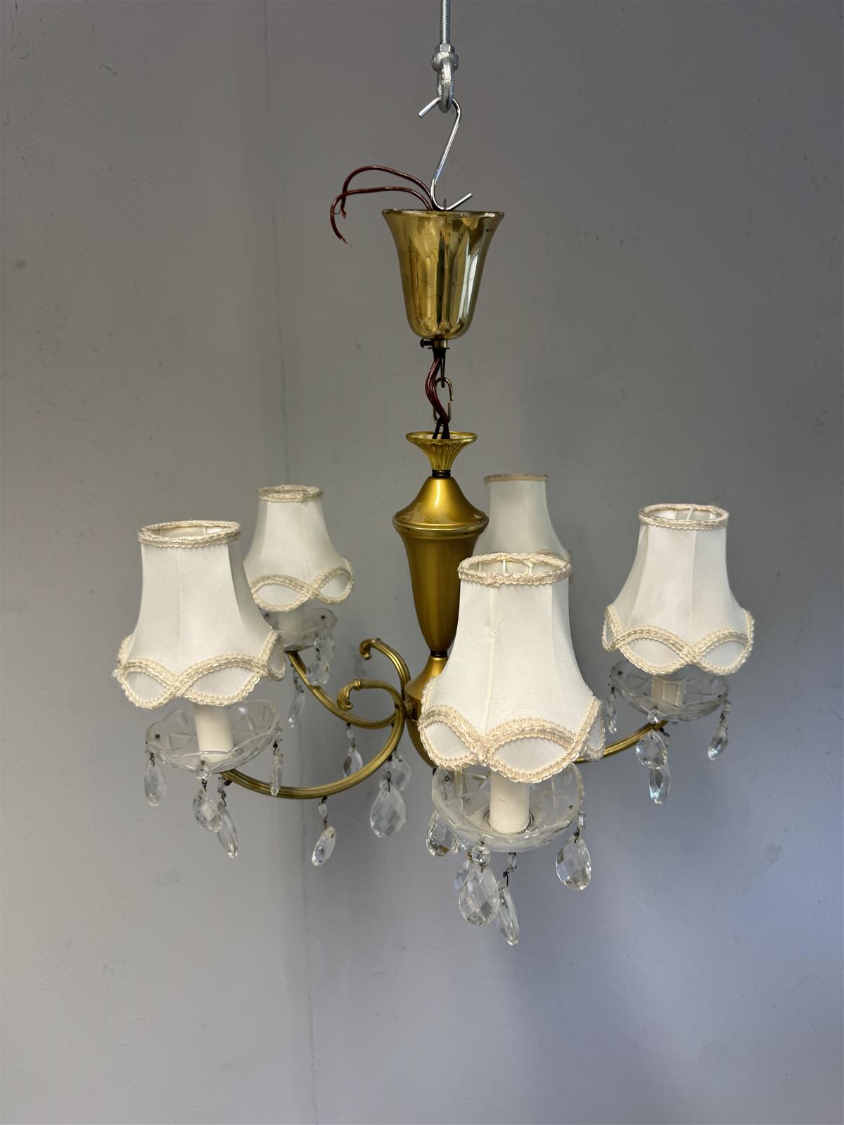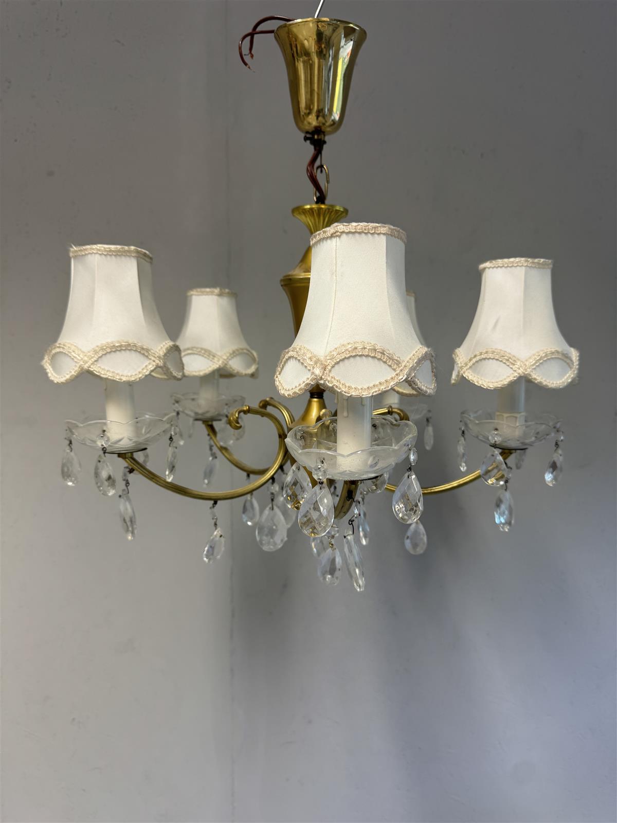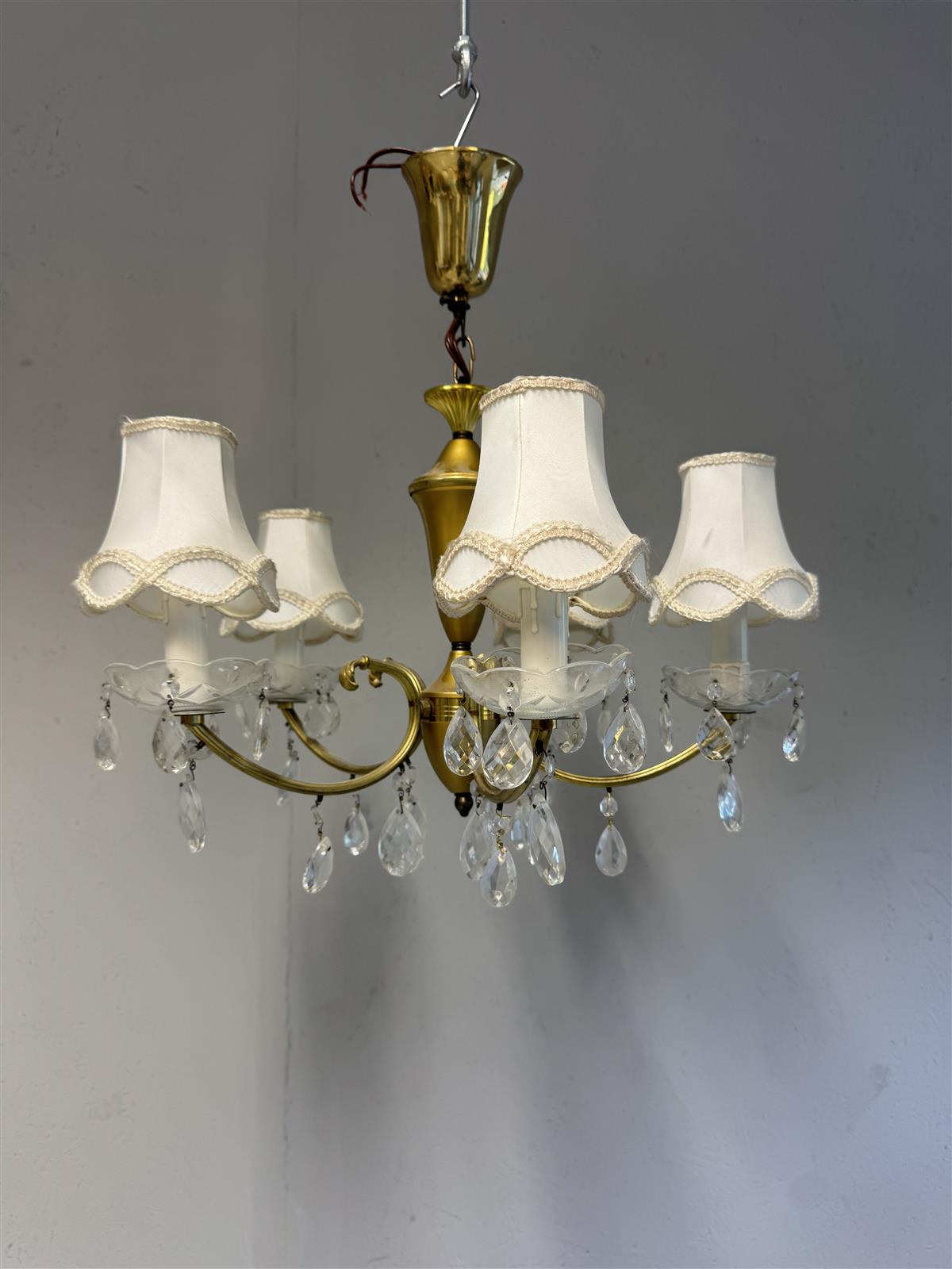 Kattokruunu, jossa on viisi valkoista varjostinta ja kristallikoristeita. Varjostimet ovat kangasta ja niissä on koristeelliset reunukset. Kristallit roikkuvat kauniisti valaisimen alaosassa, tuoden ylellistä ilmettä tilaan.