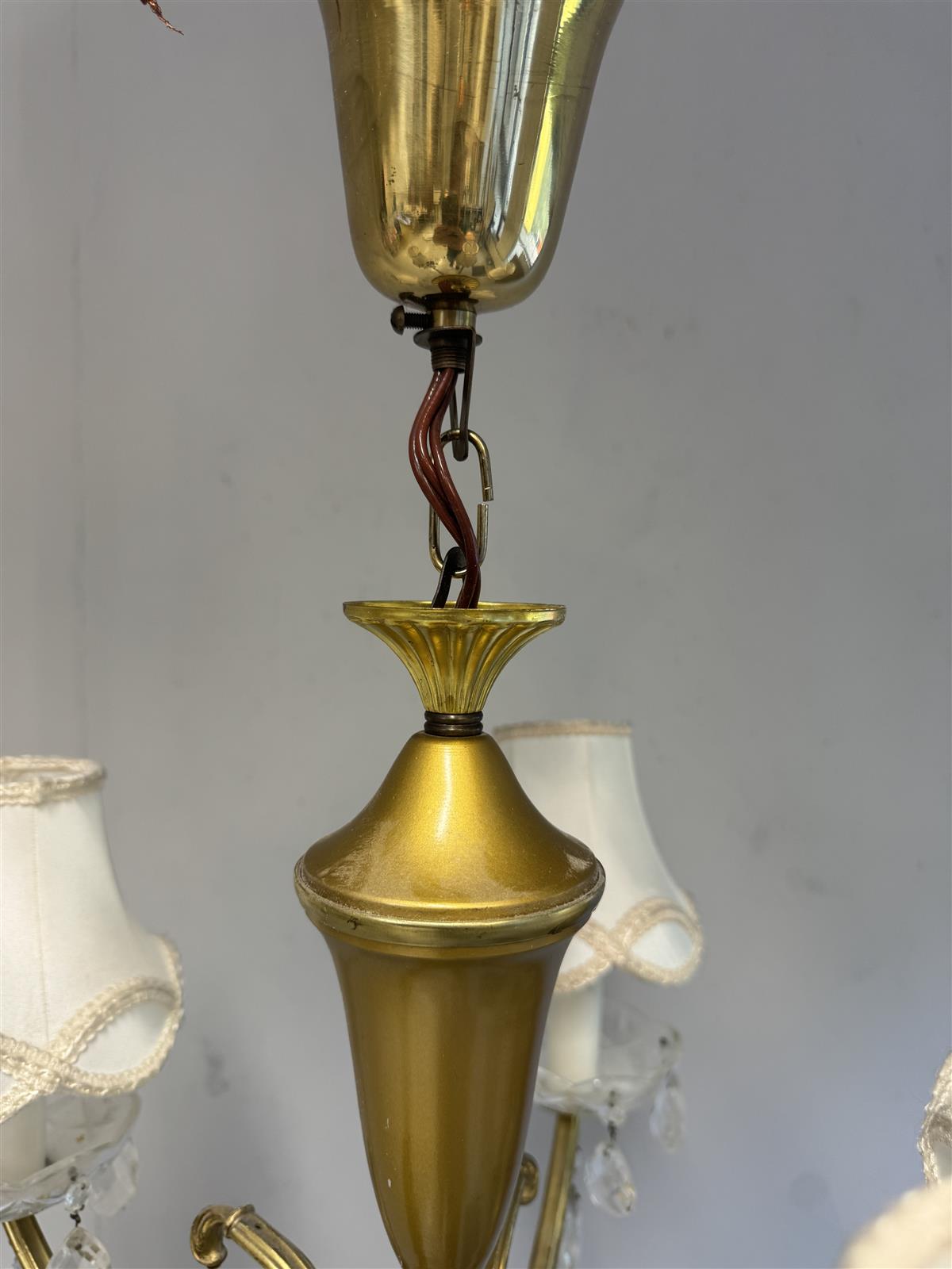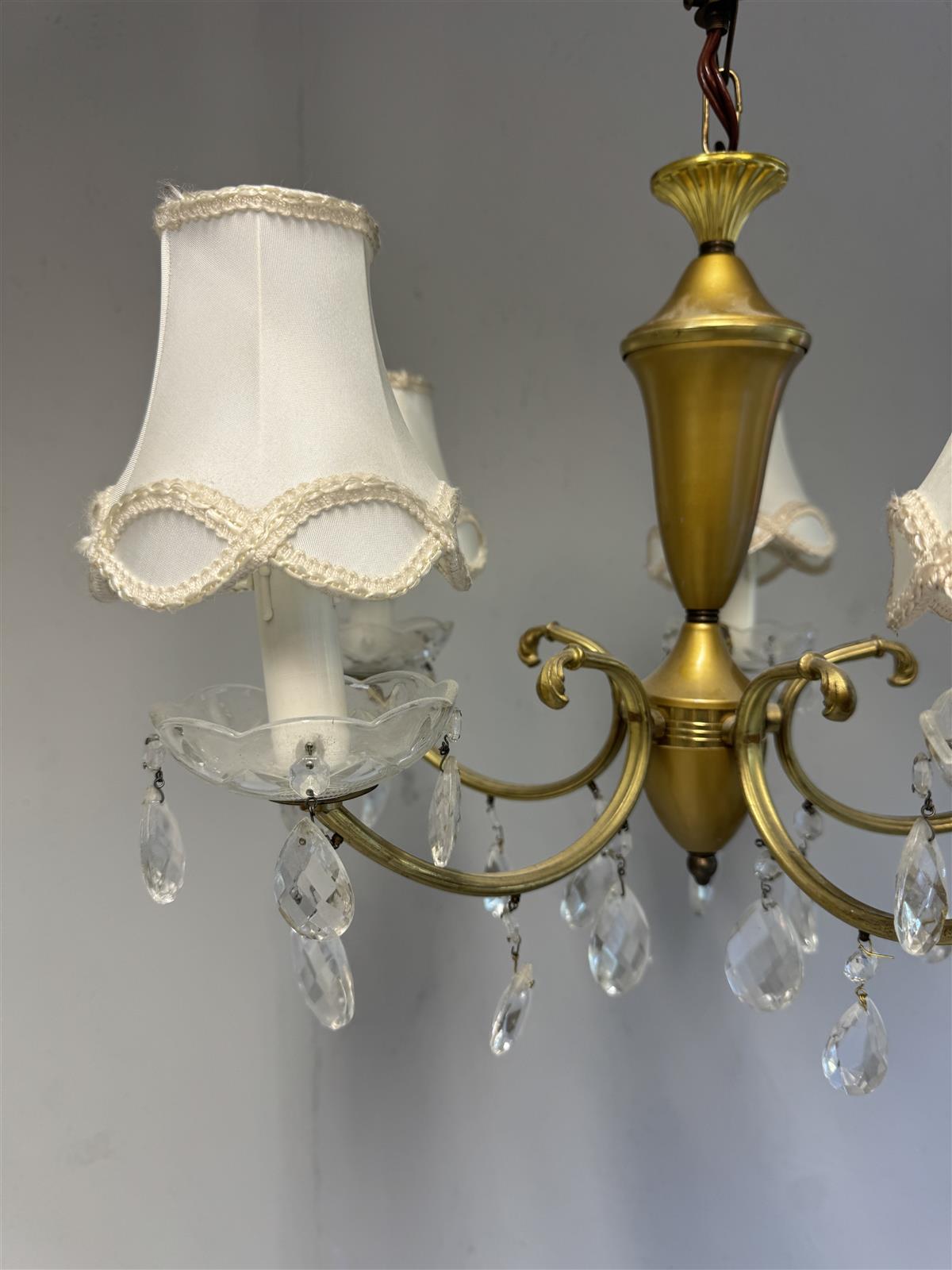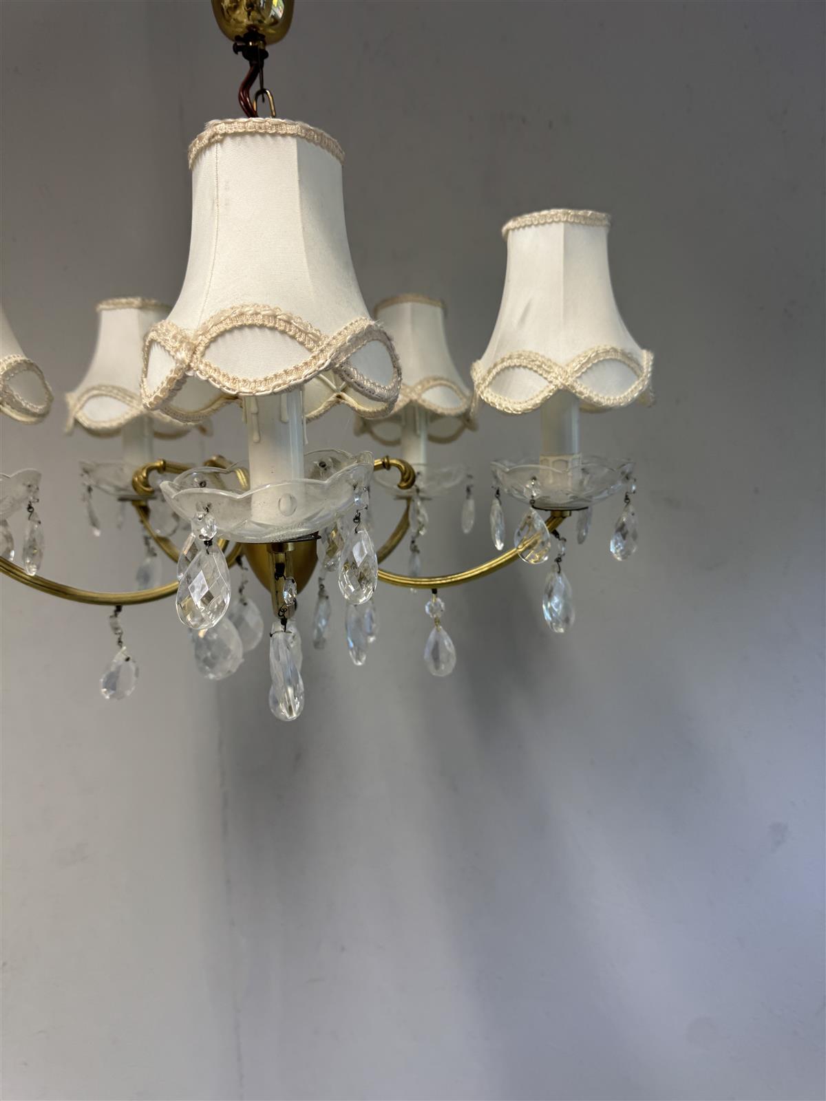 Kattokruunu, jossa on viisi valkoista varjostinta ja kristallikoristeita. Varjostimet ovat kangasta ja niissä on koristeelliset reunukset. Kristallit roikkuvat kauniisti valaisimen alaosassa, tuoden ylellistä ilmettä tilaan.