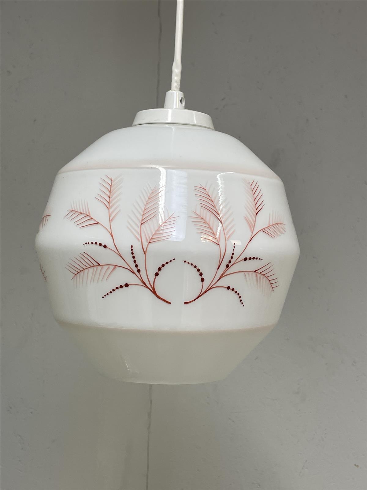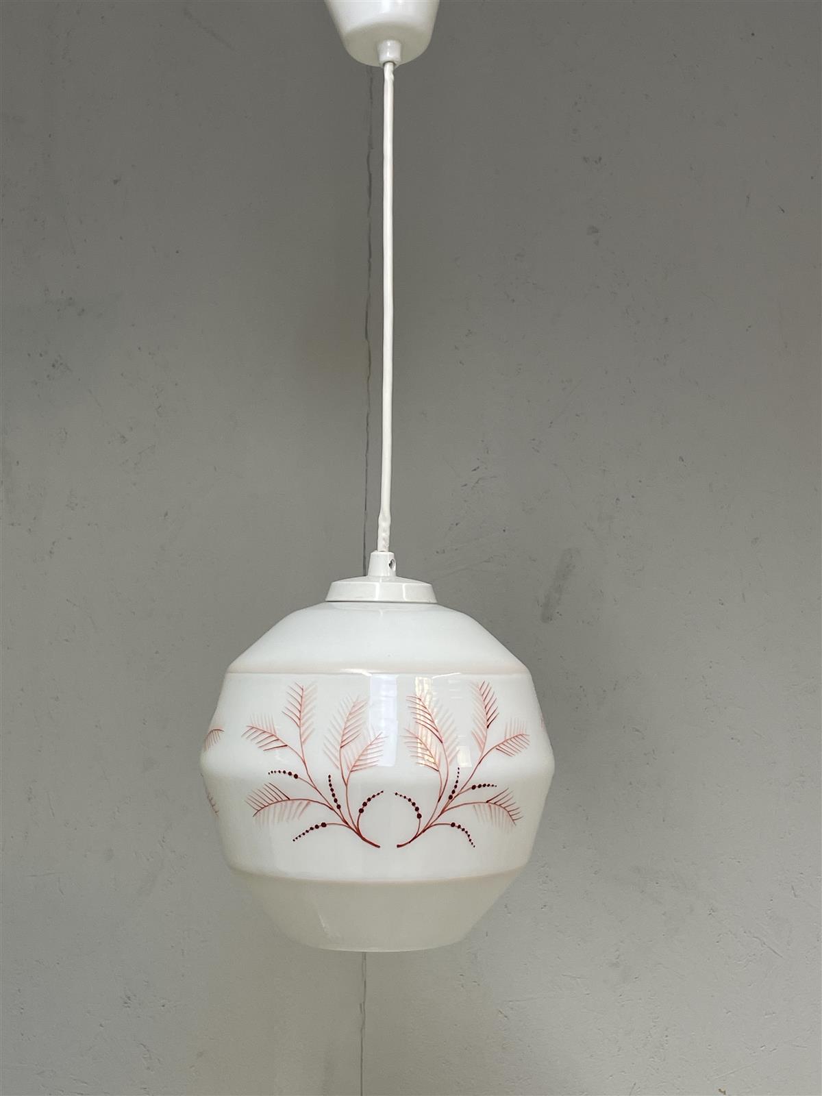 Kattovalaisin, jossa on kaunis lasinen kupu. Valkoinen lasi on koristeltu hienovaraisilla punaisilla kuvioilla.
