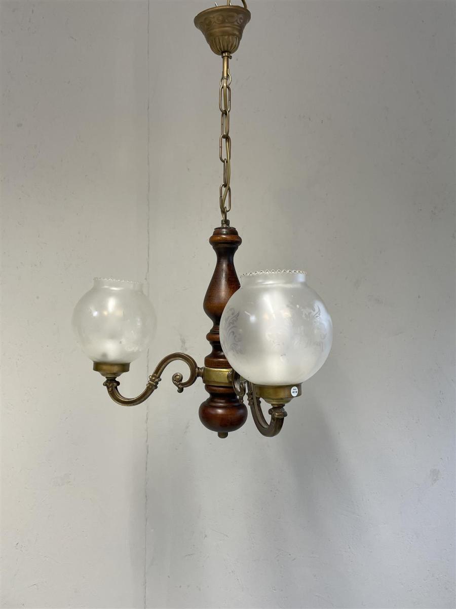 Kattovalaisin, jossa on kolme valopistettä koristeellisilla lasikuvuilla. ja koristeelliset metallivarret. Valaisimen runko on puuta ja messinkiä.