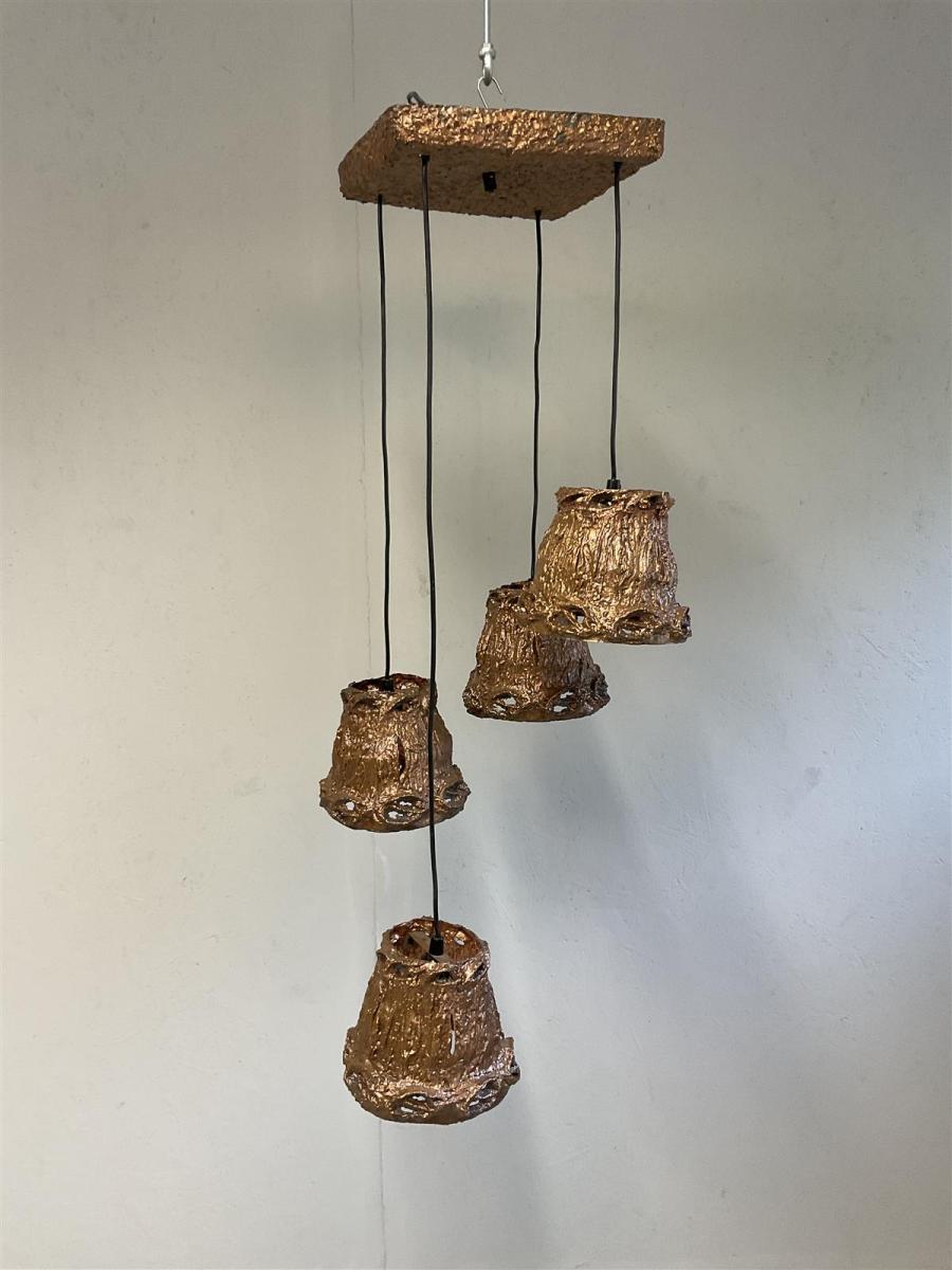 Kuparinen kattovalaisin, Aimo Tukiainen tyylinen, jossa on neljä erillistä varjostinta. Valaisimen pinta on karkea ja kuparinvärinen, mikä antaa sille ainutlaatuisen ilmeen. Jokainen varjostin roikkuu omalla johdollaan, luoden mielenkiintoisen ja epäsymmetrisen kokonaisuuden.