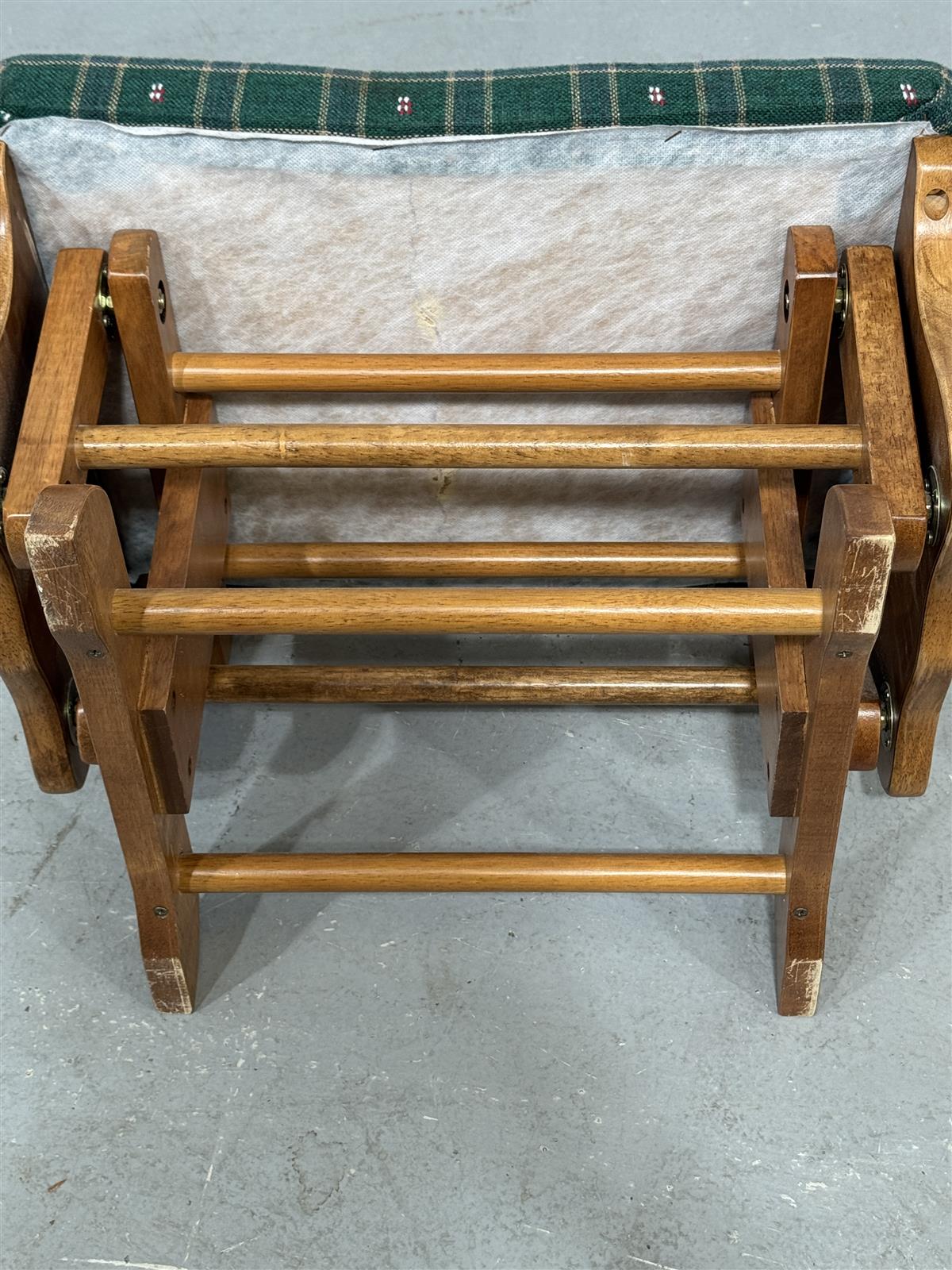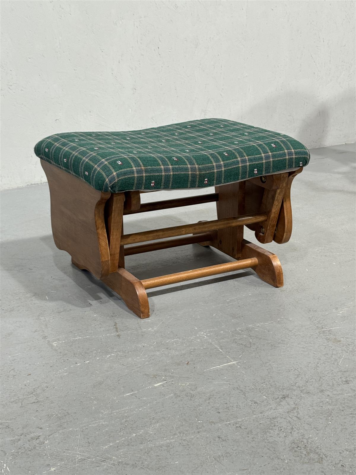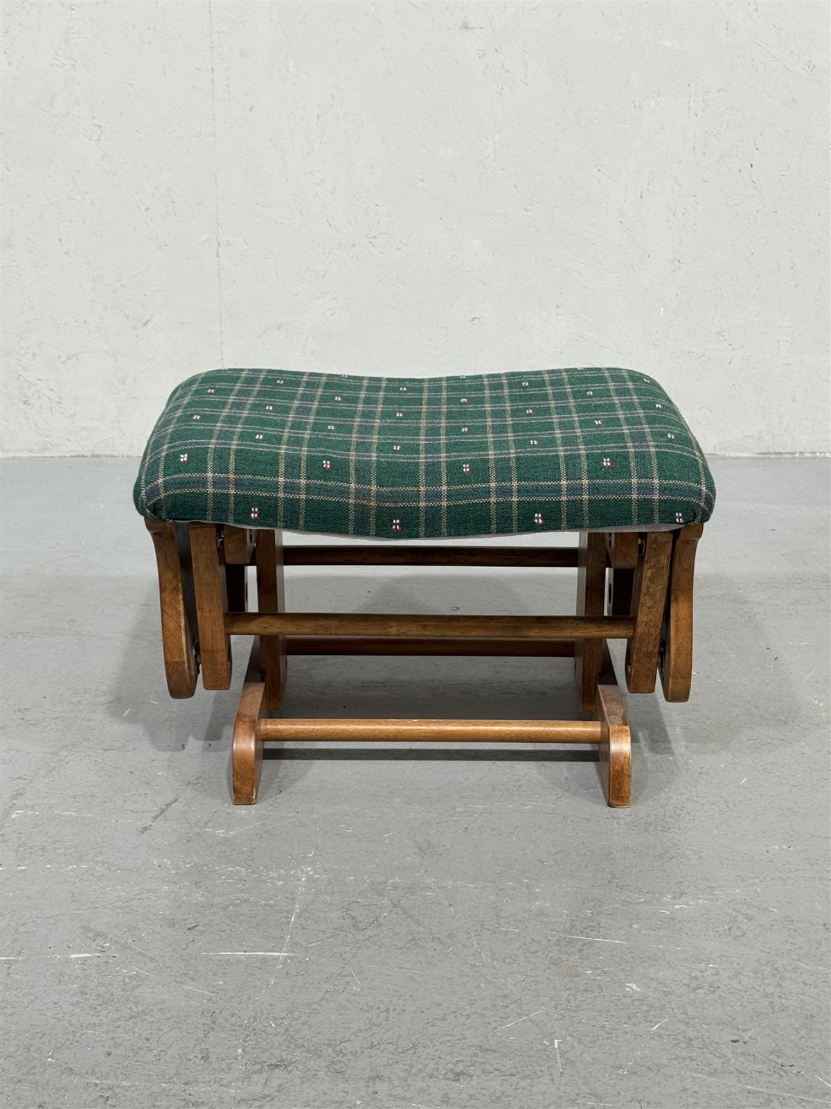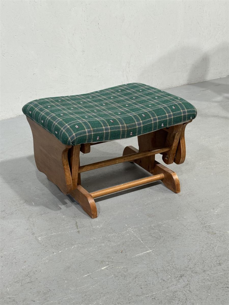 Vihreä keinujakkara tai rahi, jossa on ruudullinen kangasverhoilu ja puinen runko. Jakkara on suunniteltu mukavaksi jalkatuen ja istuimen yhdistelmäksi, joka sopii hyvin rentoutumiseen ja keinumiseen. Rakenne on tukeva ja kestävä, mikä tekee siitä pitkäikäisen valinnan kotiin tai mökille.