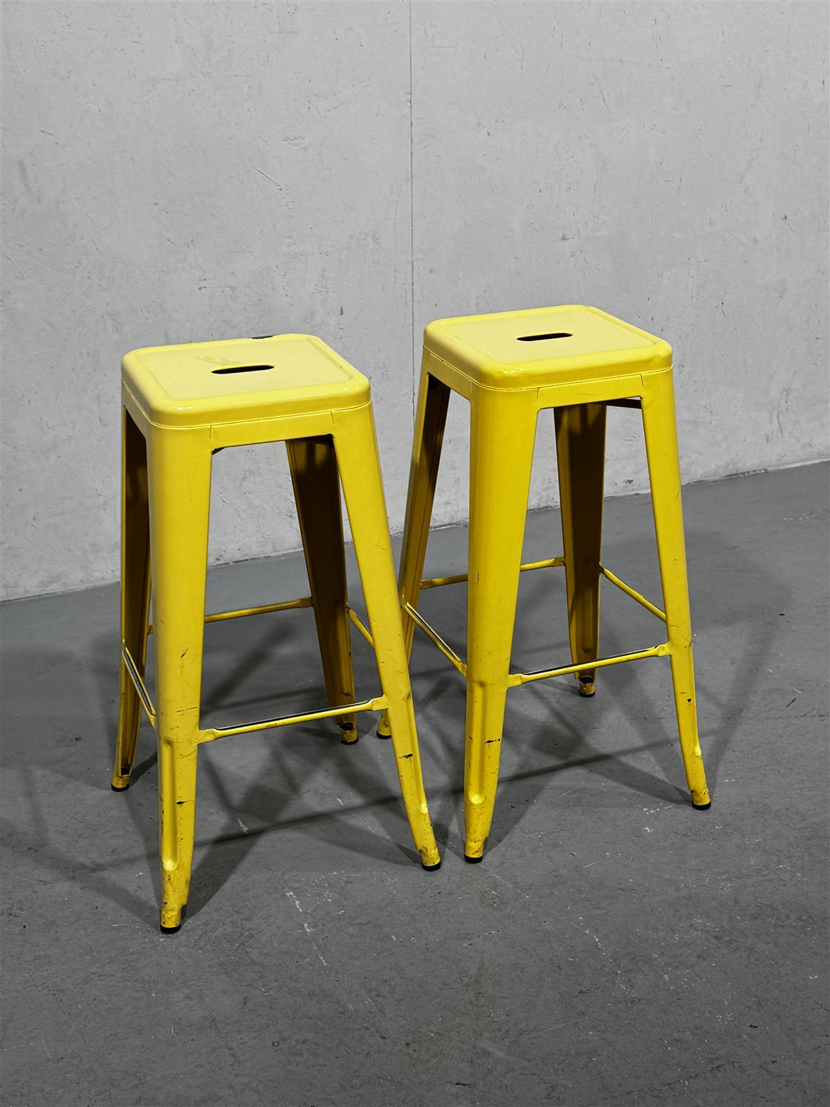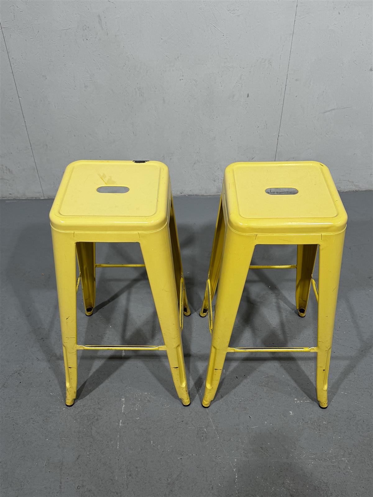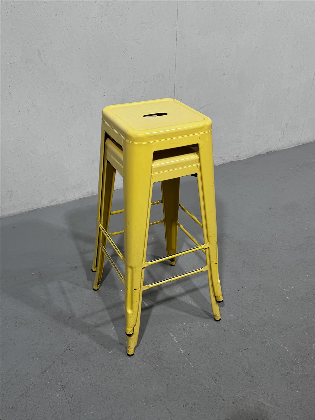 Kaksi keltaista korkeaa jakkaraa, joissa on yksinkertainen ja moderni muotoilu. Jakkarat ovat pinottavia ja niissä on aukko istuimessa helpottamaan siirtämistä.