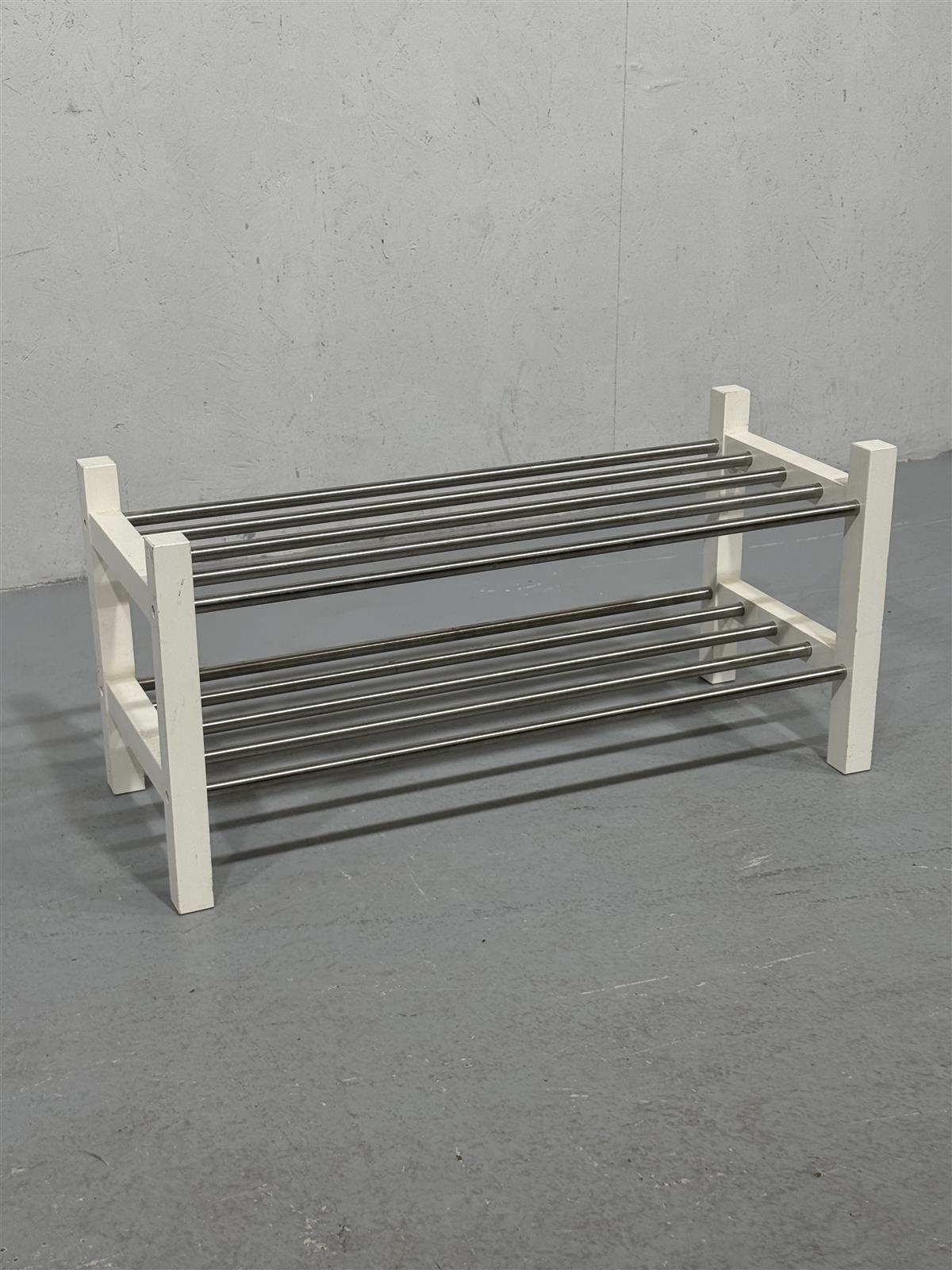 Kenkäteline, jossa on kaksi tasoa. Teline on valkoinen ja siinä on metalliset tangot.